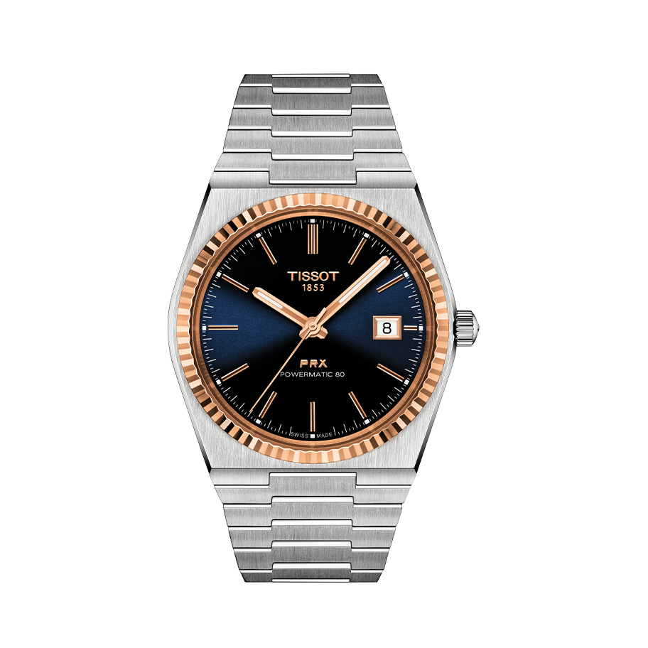最合适的机械腕表天梭PRX蓝金盘 只是橡树内圈表圈要比较宽,并且有代表性的八颗螺丝镶嵌,这款表盘跟橡树一样也是蓝金盘面,只是细看没有橡树那种玑镂(手工刻花)细纹,但这款表依旧采用了拉丝及倒角抛光工艺,做工非常精细的感觉,钢的质感也非常好。机芯方面P80机芯80小时储能,Nivachron防磁游丝,更换也很容易,整体来看5k价位真是超值,不输于万元表 (图片源于网络,侵删)
