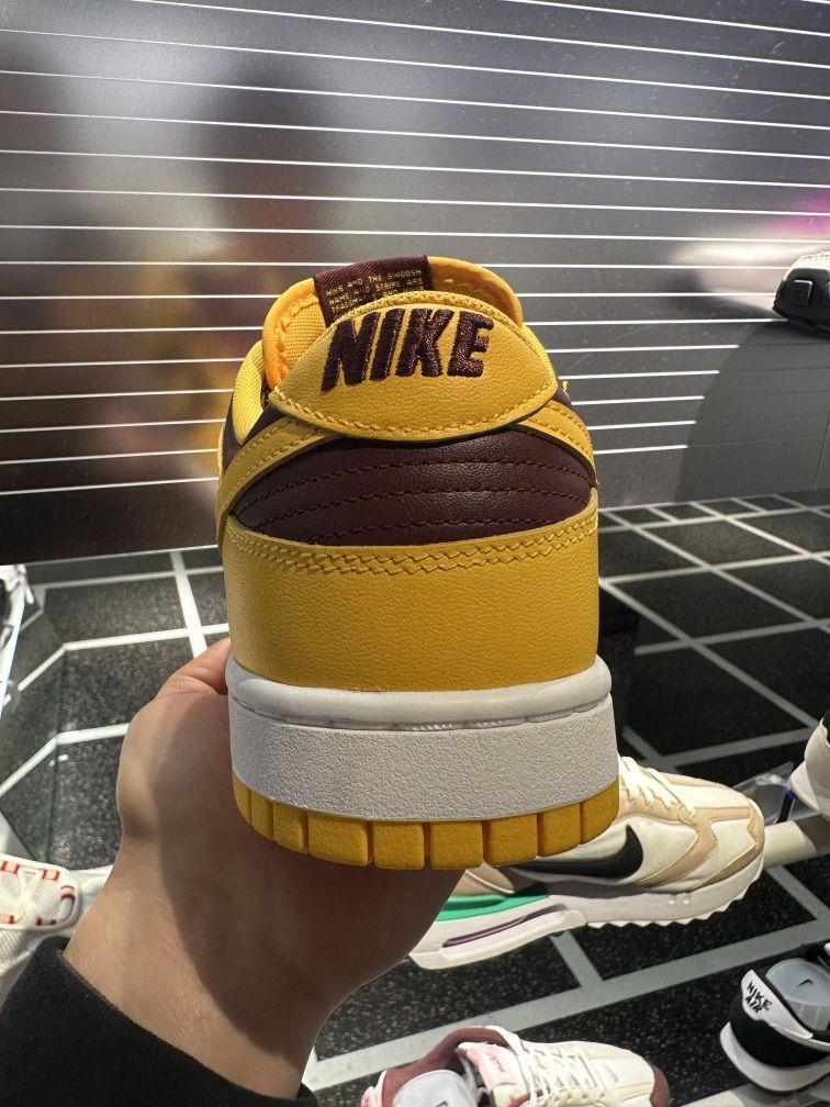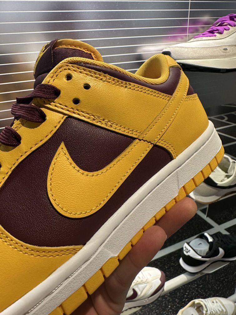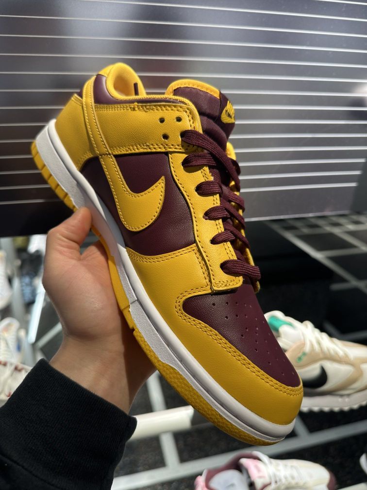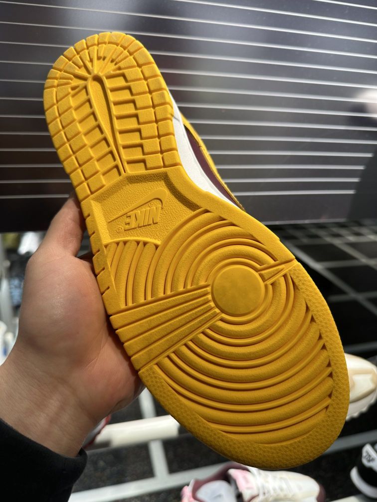 哈喽大家好,我是肠粉,今天给大家带来这双dunk low新款黄酒红配色,那这双最便宜的dunk值得买吗? 鞋身以亮黄色搭配深酒红,看起来有点不协调,鞋面是皮革材质,有个缺点就是鞋身做工比较一般,在皮革裁切边缘有毛边的情况!如果觉得这个配色好看的话那它的性价比很高,如果觉得配色丑,那不是很推荐!