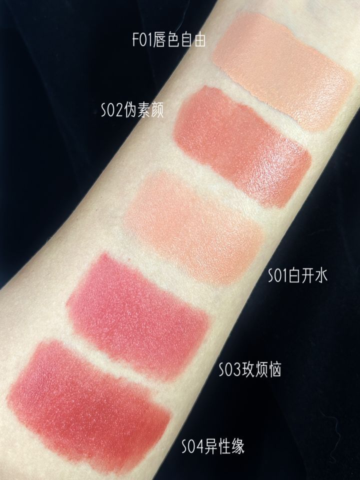 F01唇色自由嘎嘎好用,是遮盖力强又不会干巴的打底色 想尝试浅色口红又怕唇色改变口红本身颜色的深唇姐妹,F01是不错的选择啊! 还有S01白开水!也可以遮!是乳酪质地的裸橘粉调色,唇部周围暗沉的地方就可以用到它