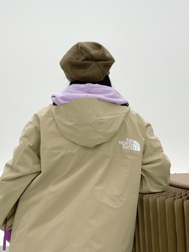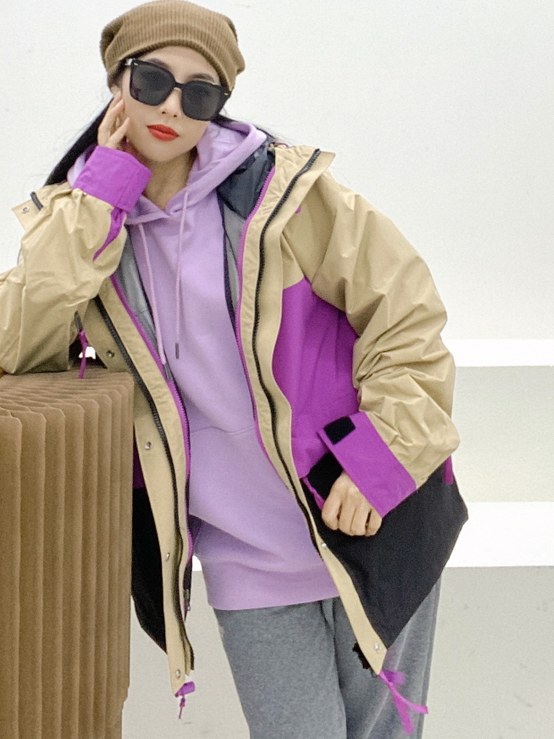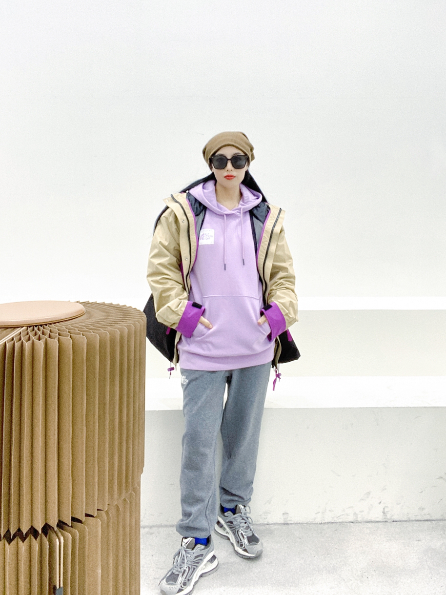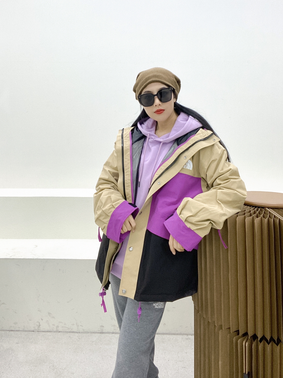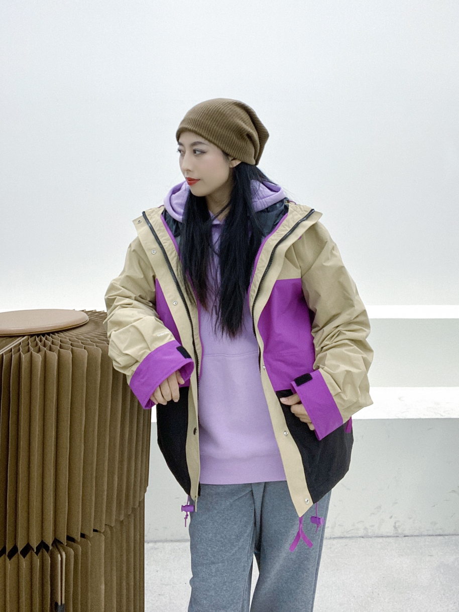 身高162.体重98尺码M 🏕️🏕️🏕️🏕️🏕️ 这件2023春季新款拼色冲锋衣 真是YYDS🌟🌟 紫色跟卡其色撞色搭配,配色真是绝了 防风防水,特别适合户外活动穿着 搭配 THE NORTH FACE 浅紫色卫衣, THE NORTH FACE 灰色卫裤 复古运动风搭配!