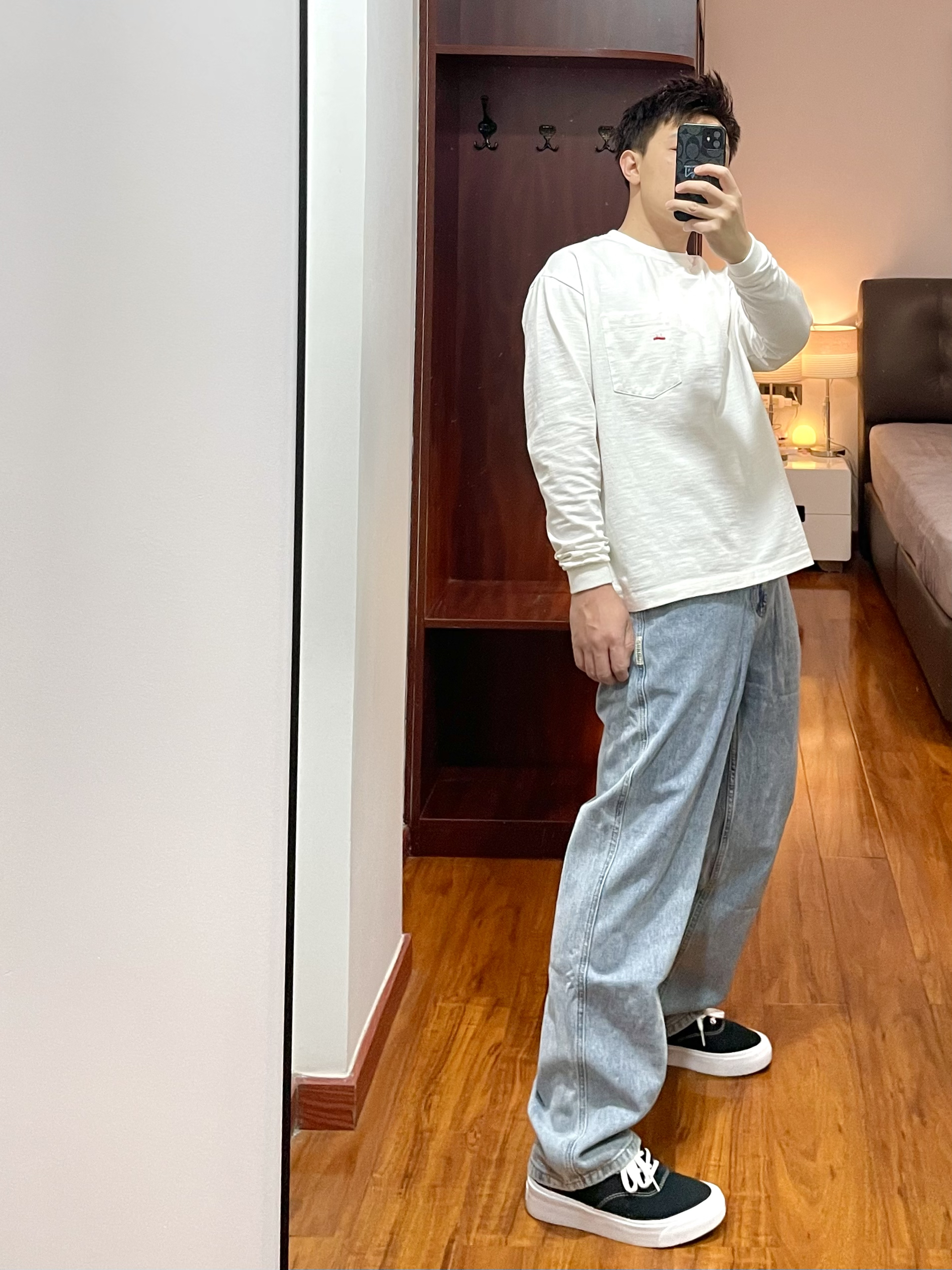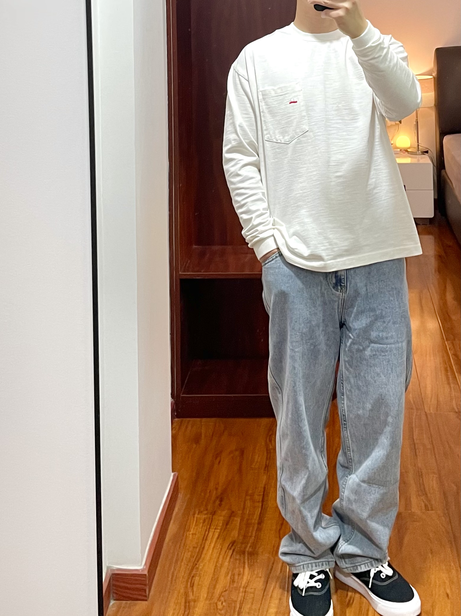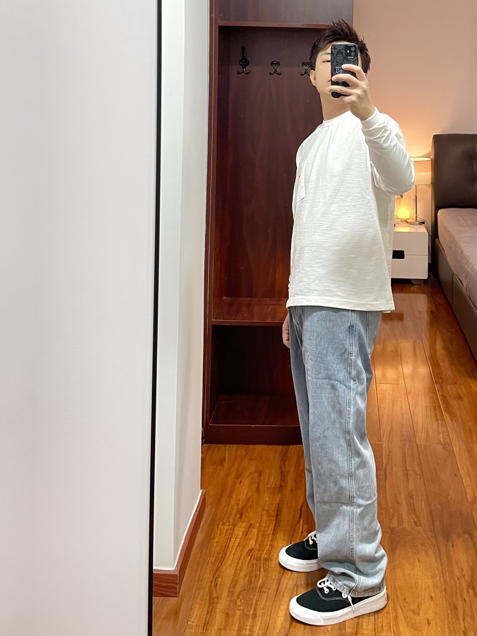 170/135斤 一个普通人的穿搭 👔:白色长袖T 竹节棉的T恤还是第一次穿,上身的感觉是舒适的,面料一节节的文理有吸湿排汗的特性,做内搭穿还挺保暖。 👖:水洗牛仔裤 浅色牛就是看起来很休闲的感觉,裤子的面料纹理清晰干净细腻,上身效果还有垂感。 👟:converse skidgrip 日常上脚出门非常频次较高的鞋子,原因就是黑色布鞋百搭耐看脚感舒适。