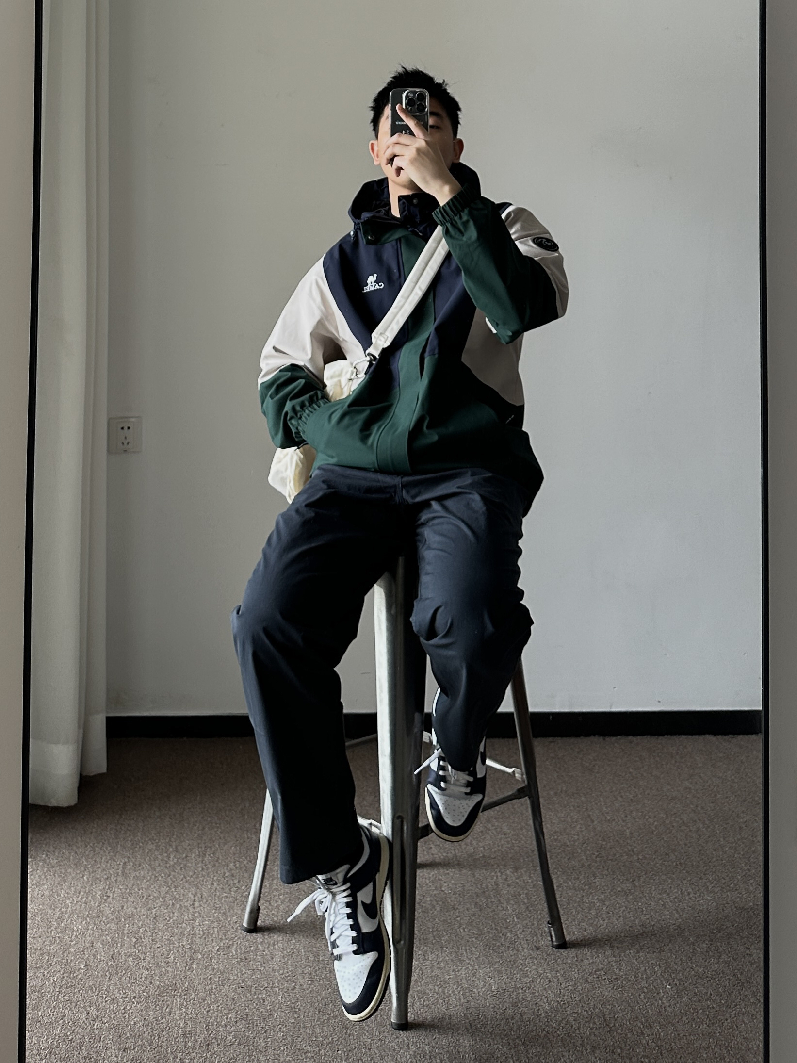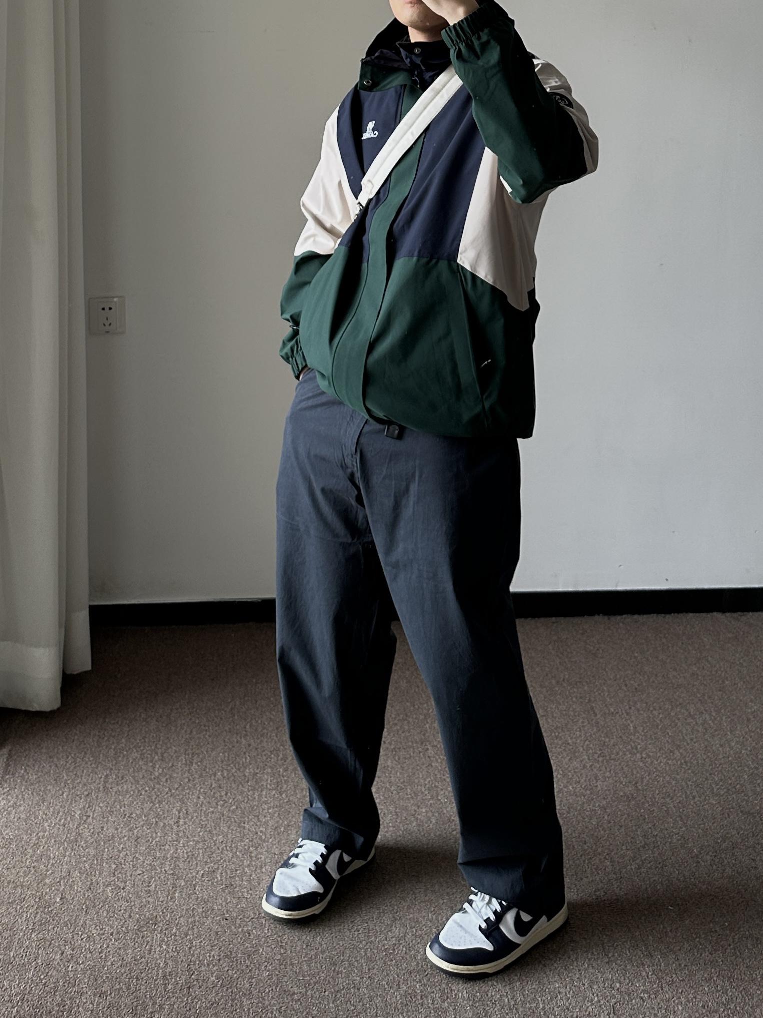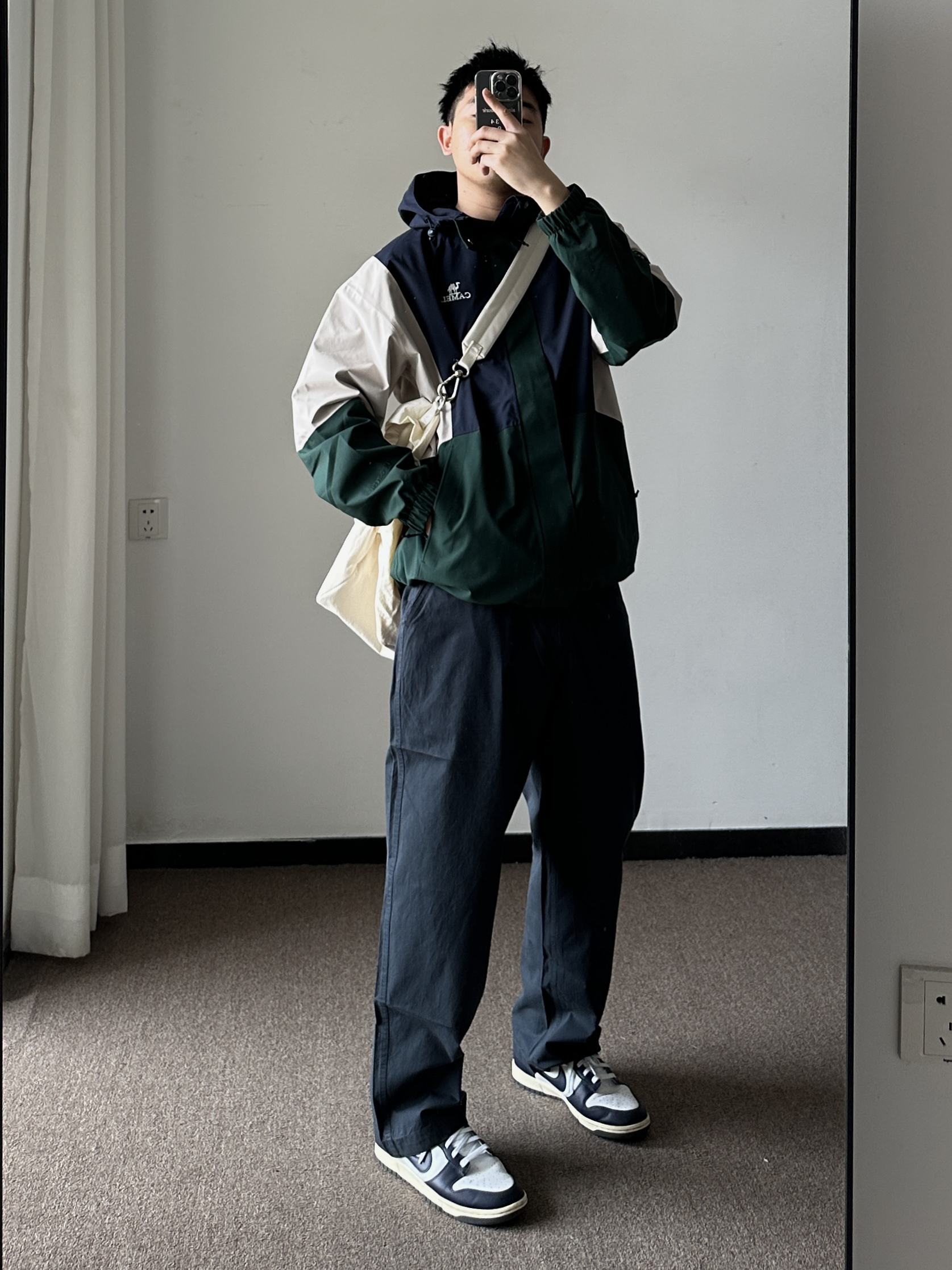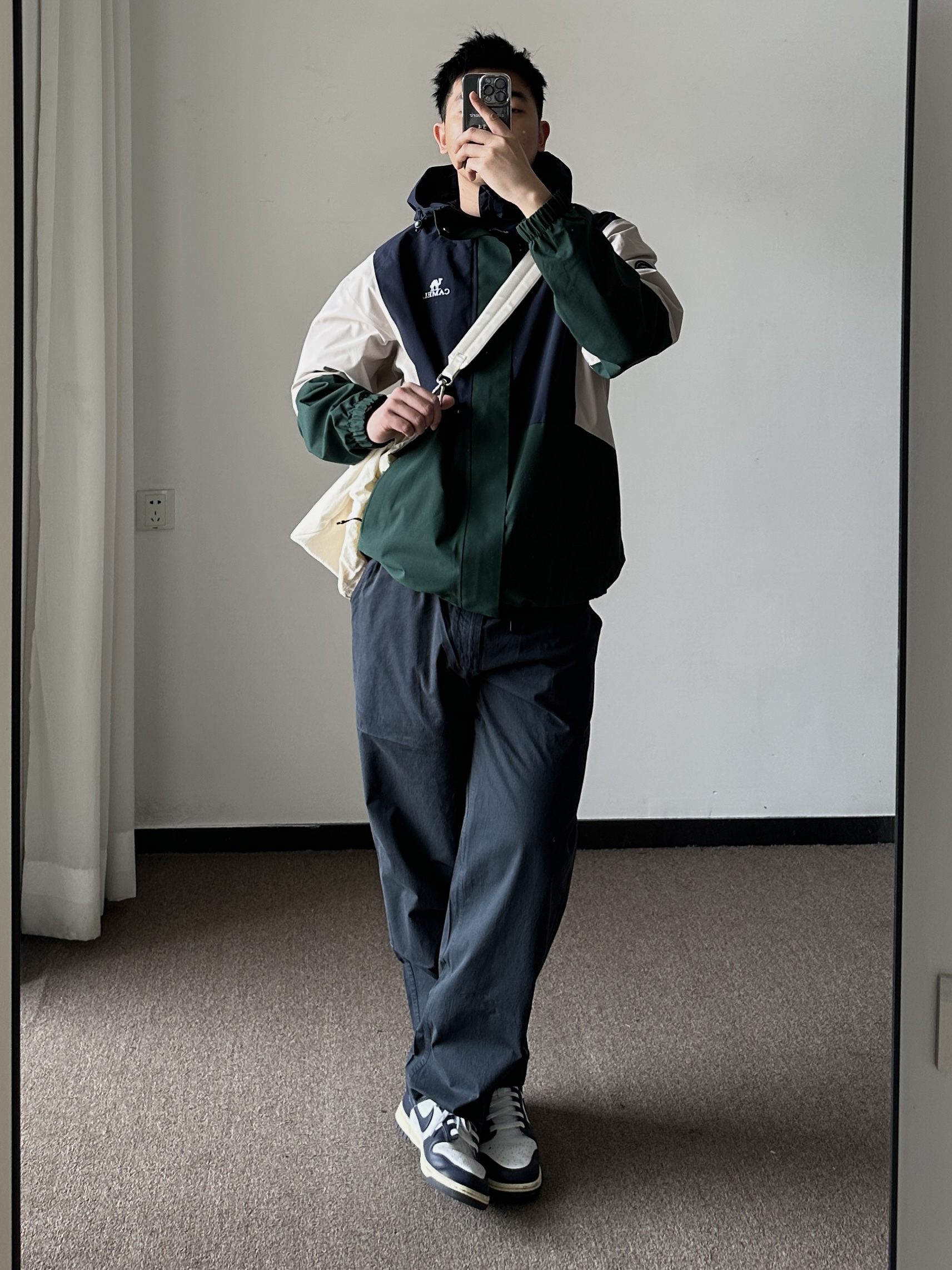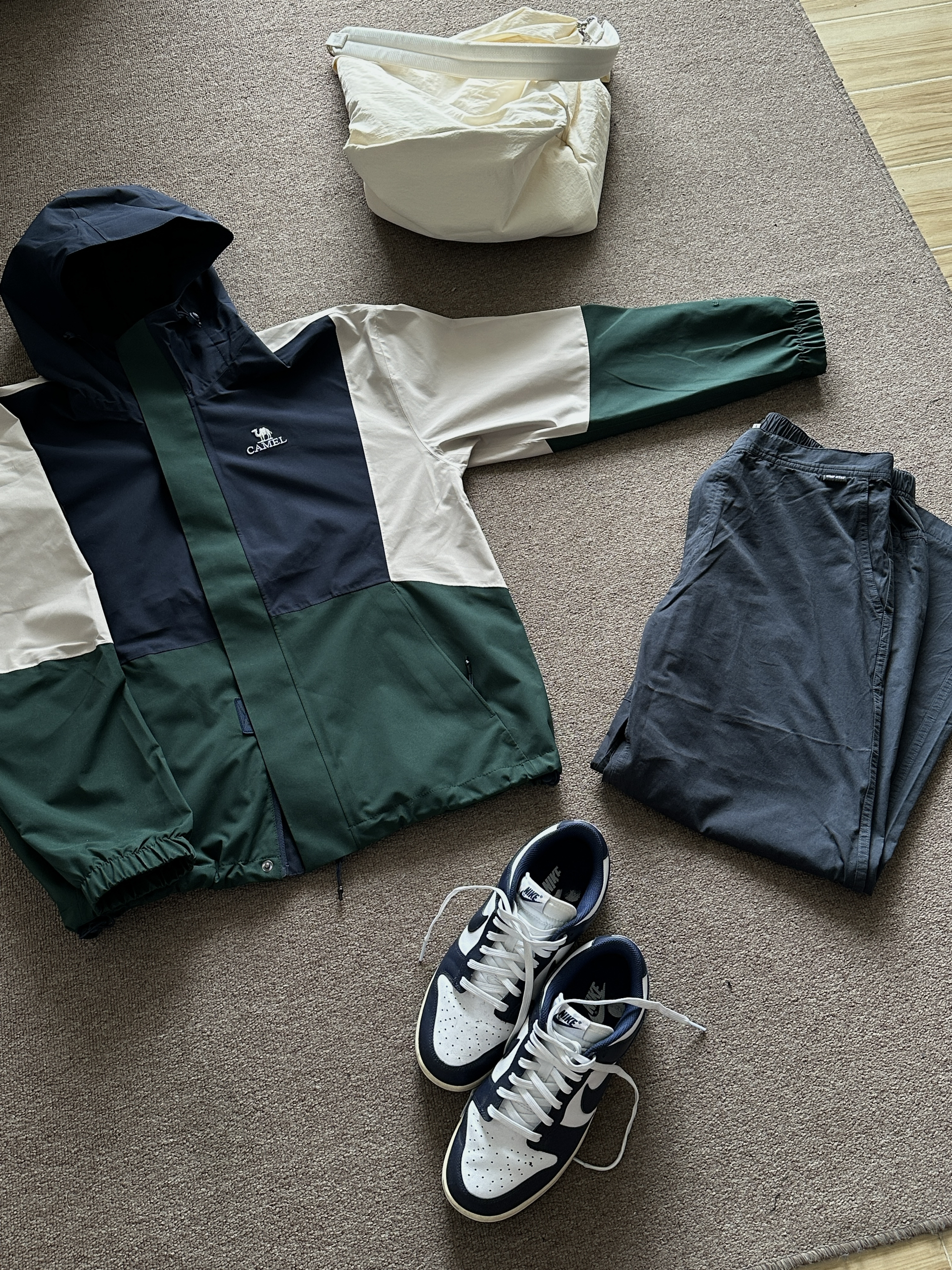 素人也能好看系列~174cm / 65kg 🧥- 墨绿、米白、藏青的户外撞色不是一般的好看。 👖- 有点做旧蓝的视觉效果,但质地是复合面料。 👟- dunk来城市通勤吧