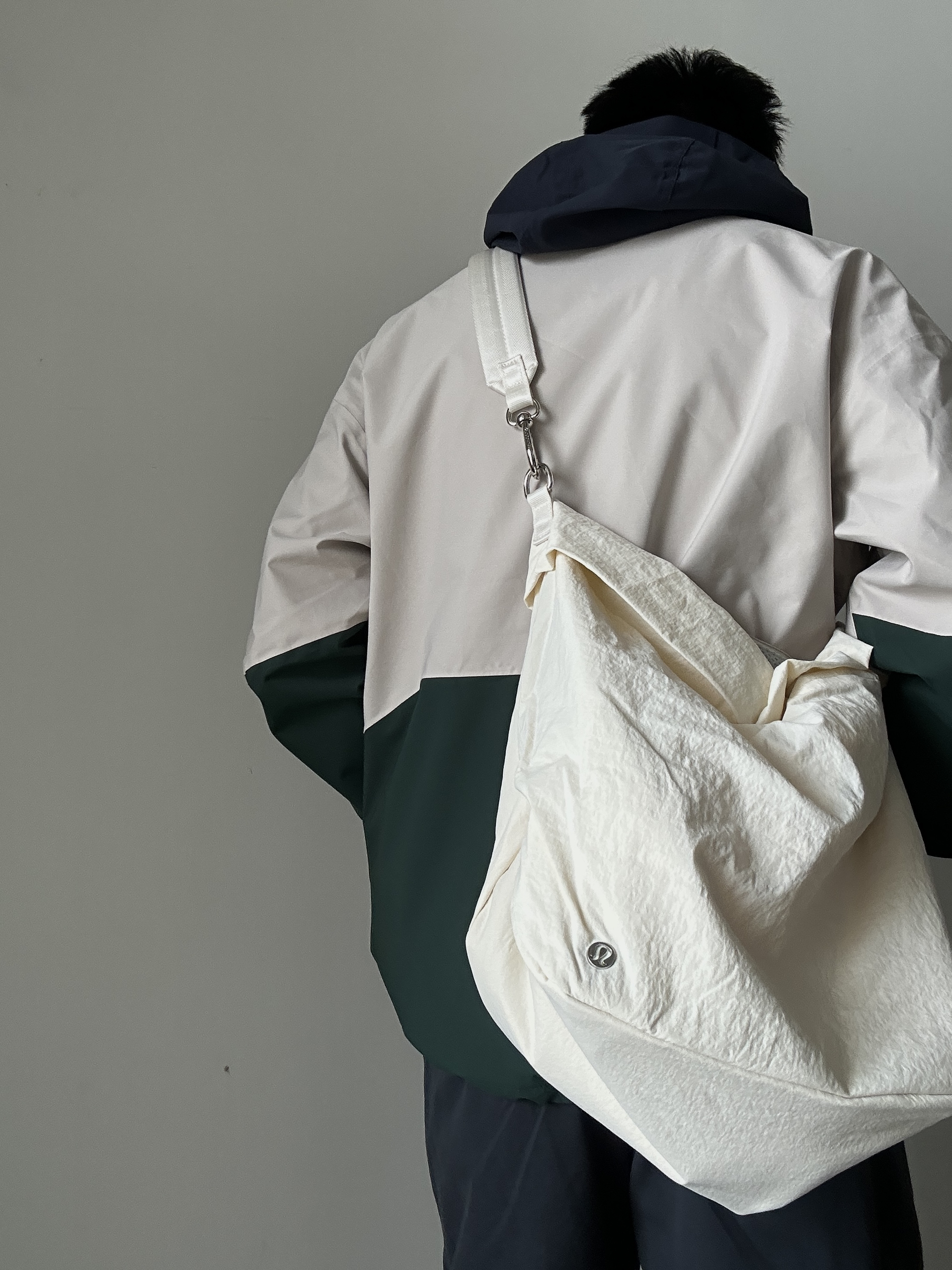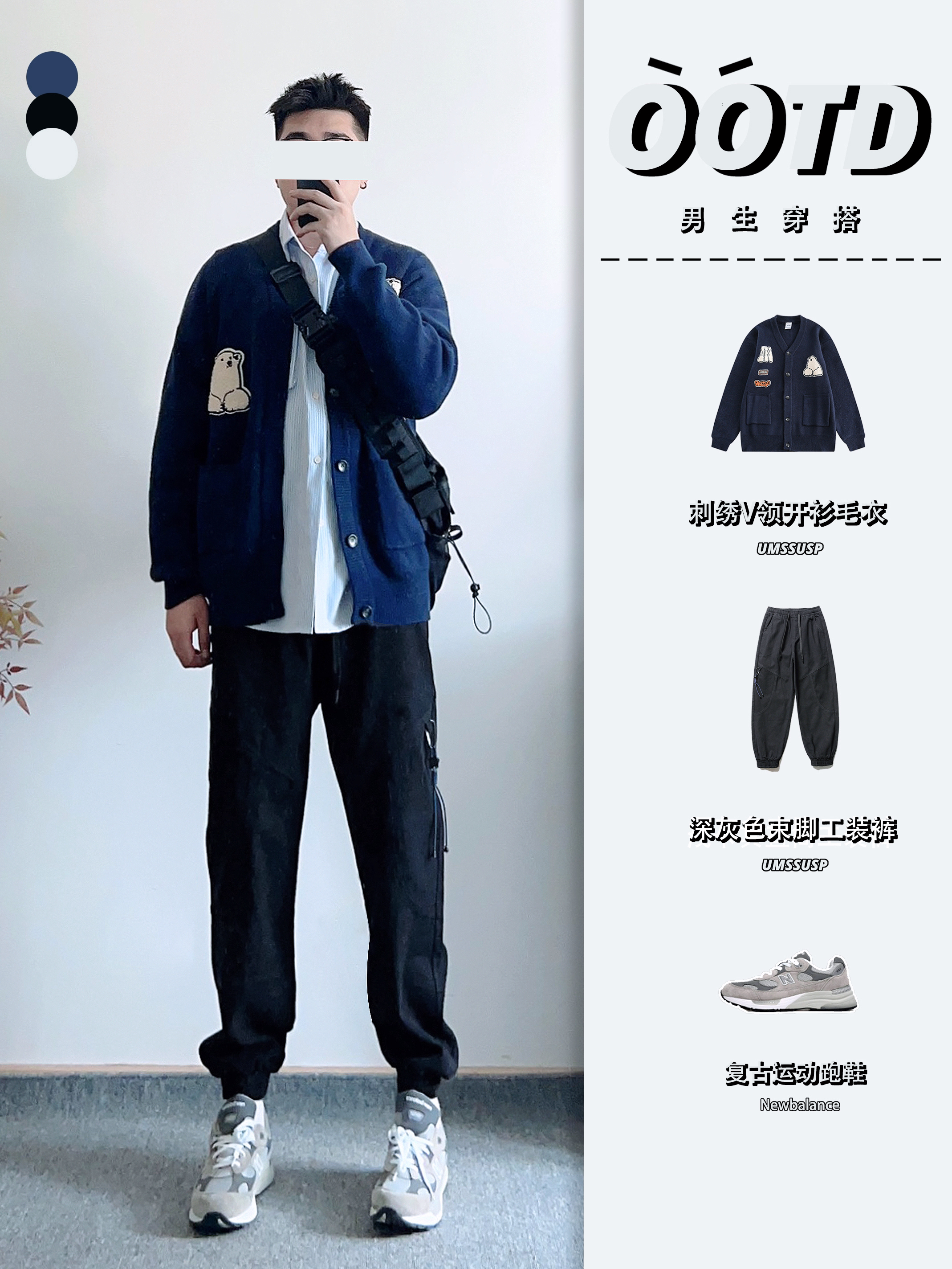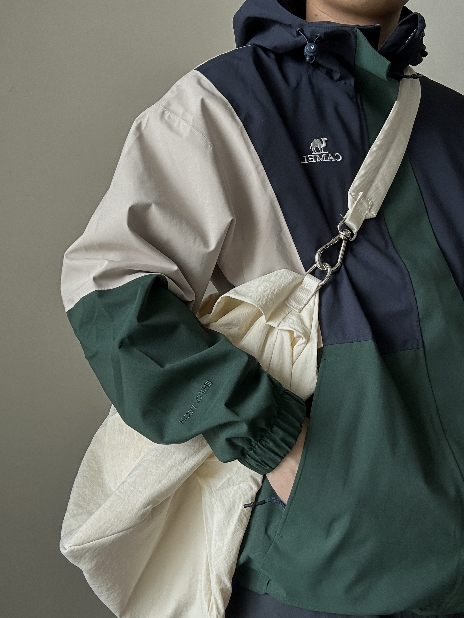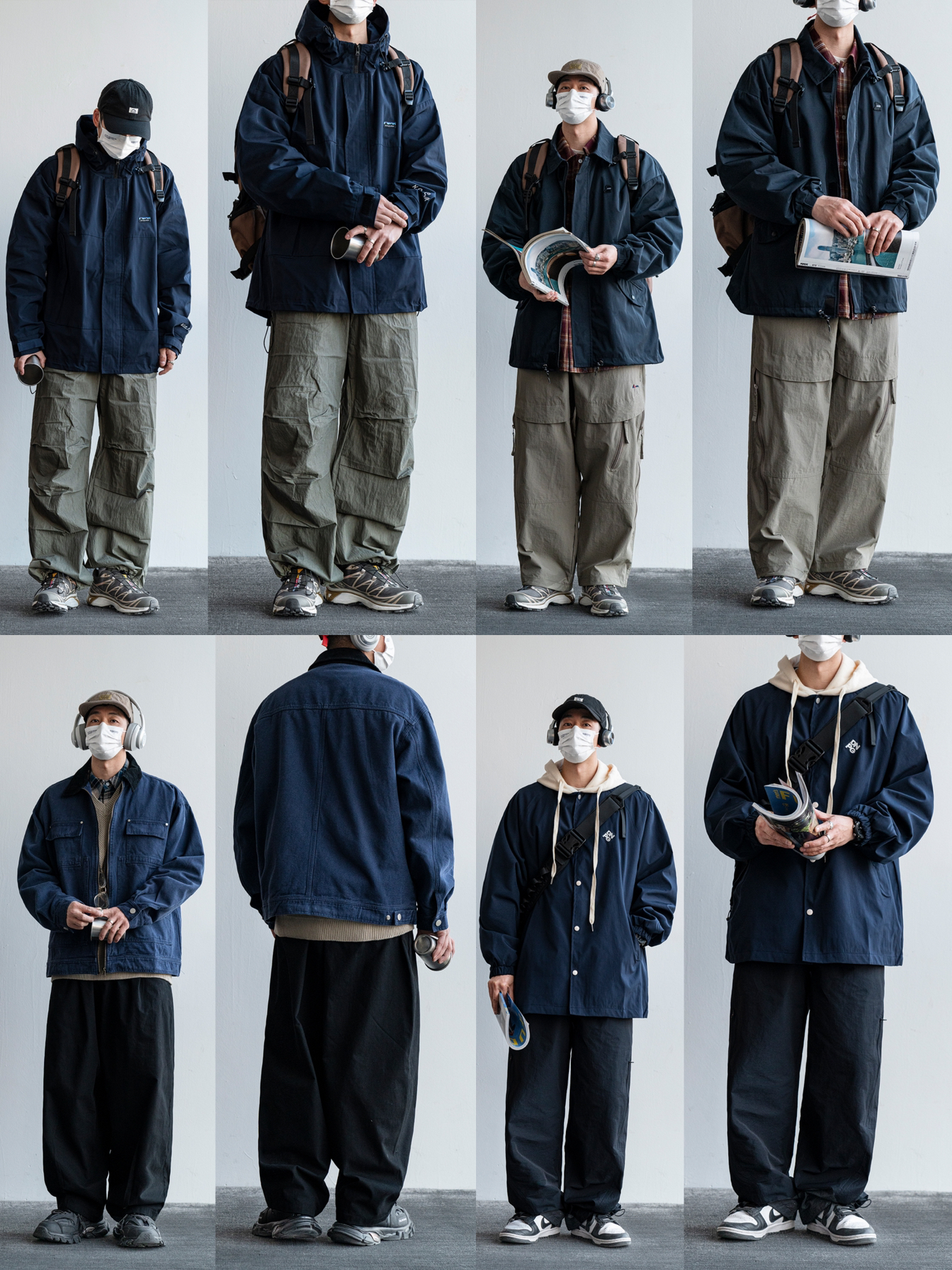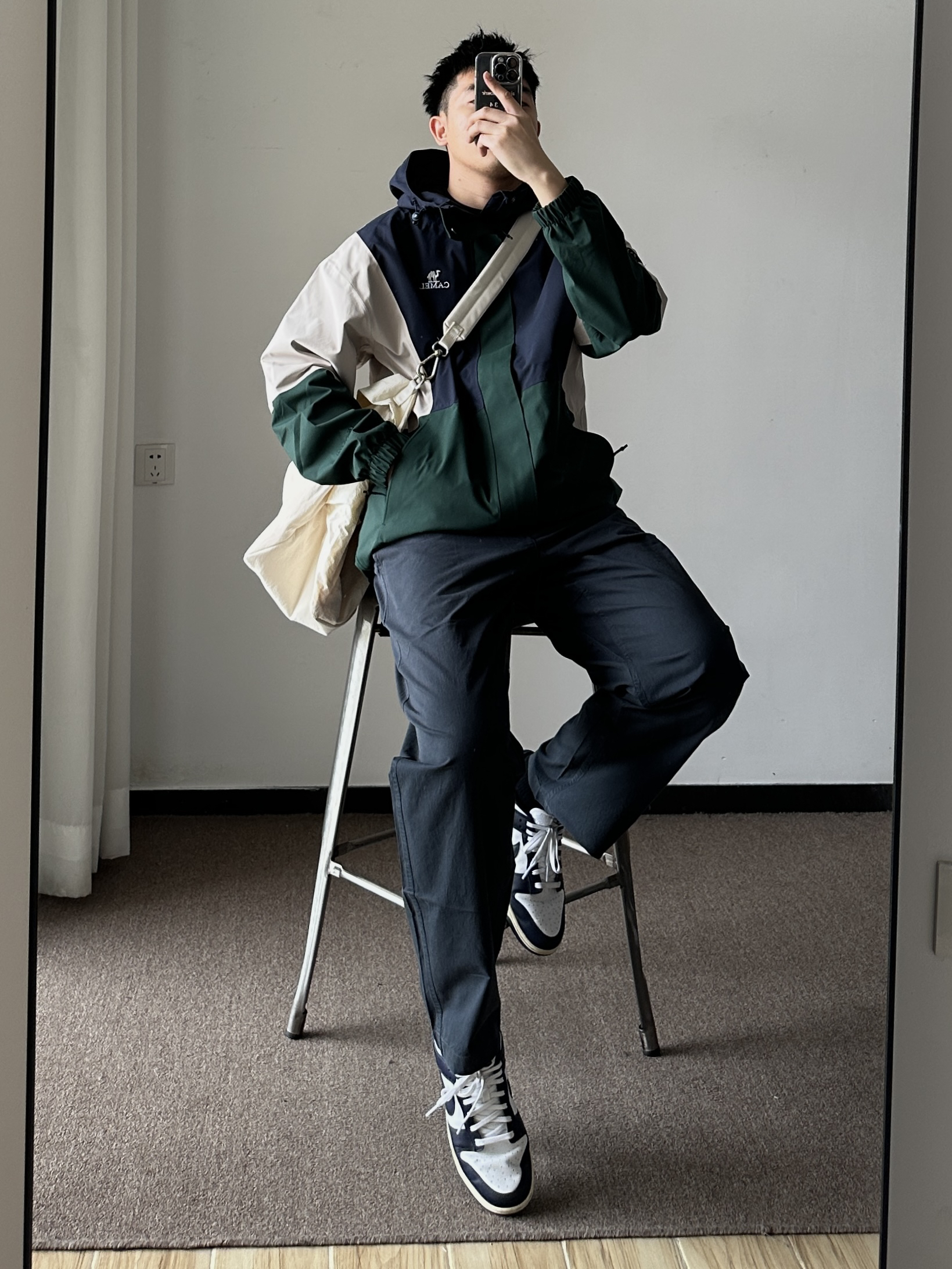 素人也能好看系列~174cm / 65kg 🧥- 墨绿、米白、藏青的户外撞色不是一般的好看。 👖- 有点做旧蓝的视觉效果,但质地是复合面料。 👟- dunk来城市通勤吧