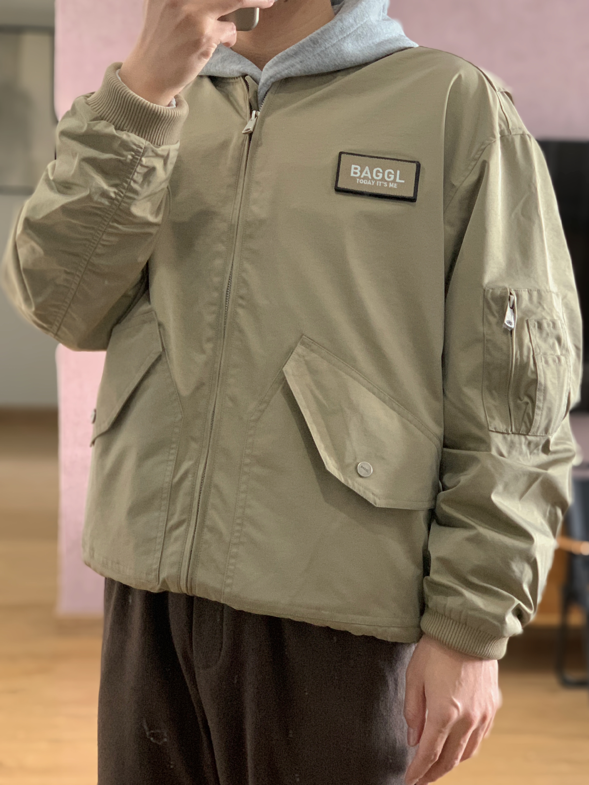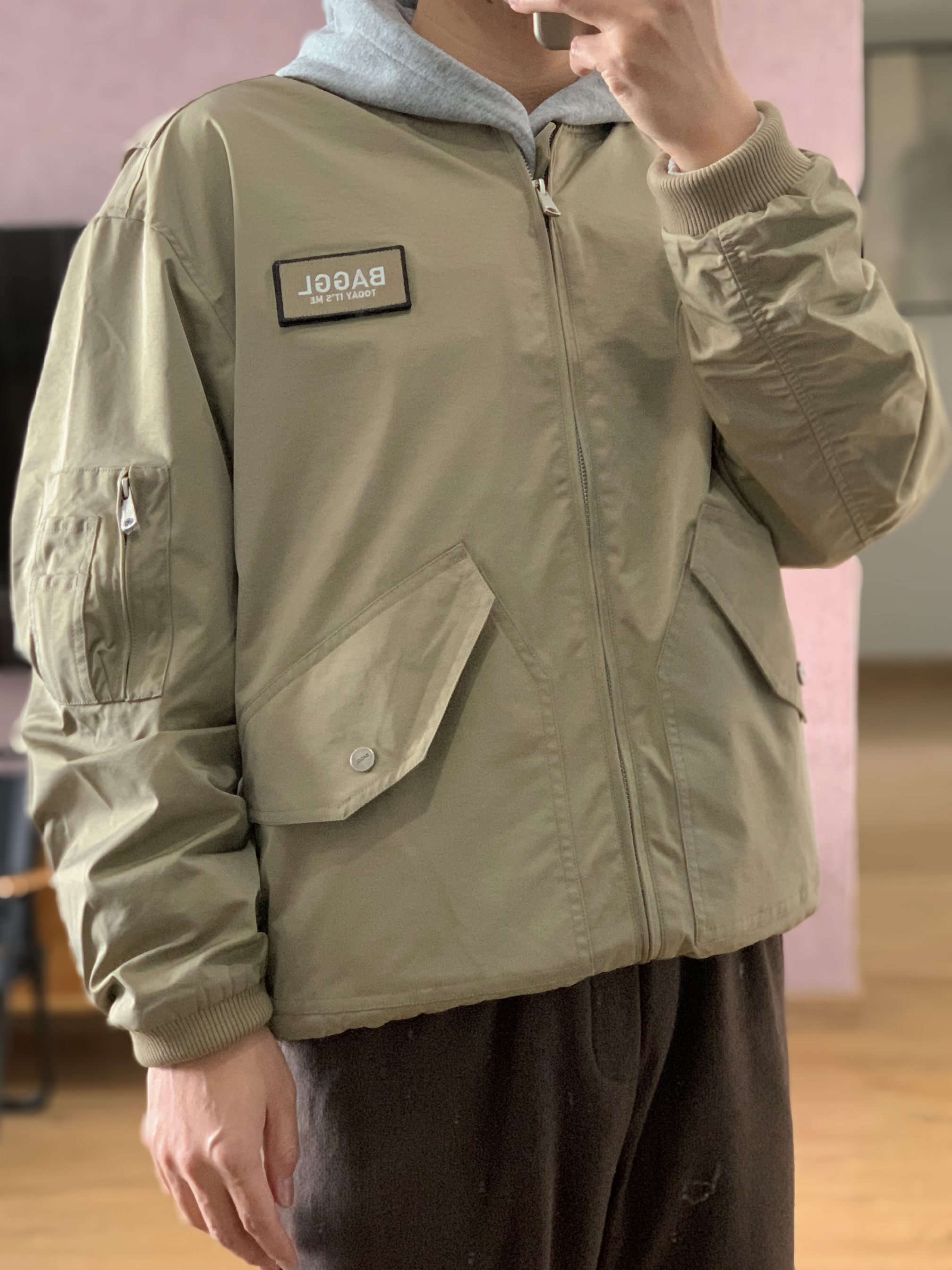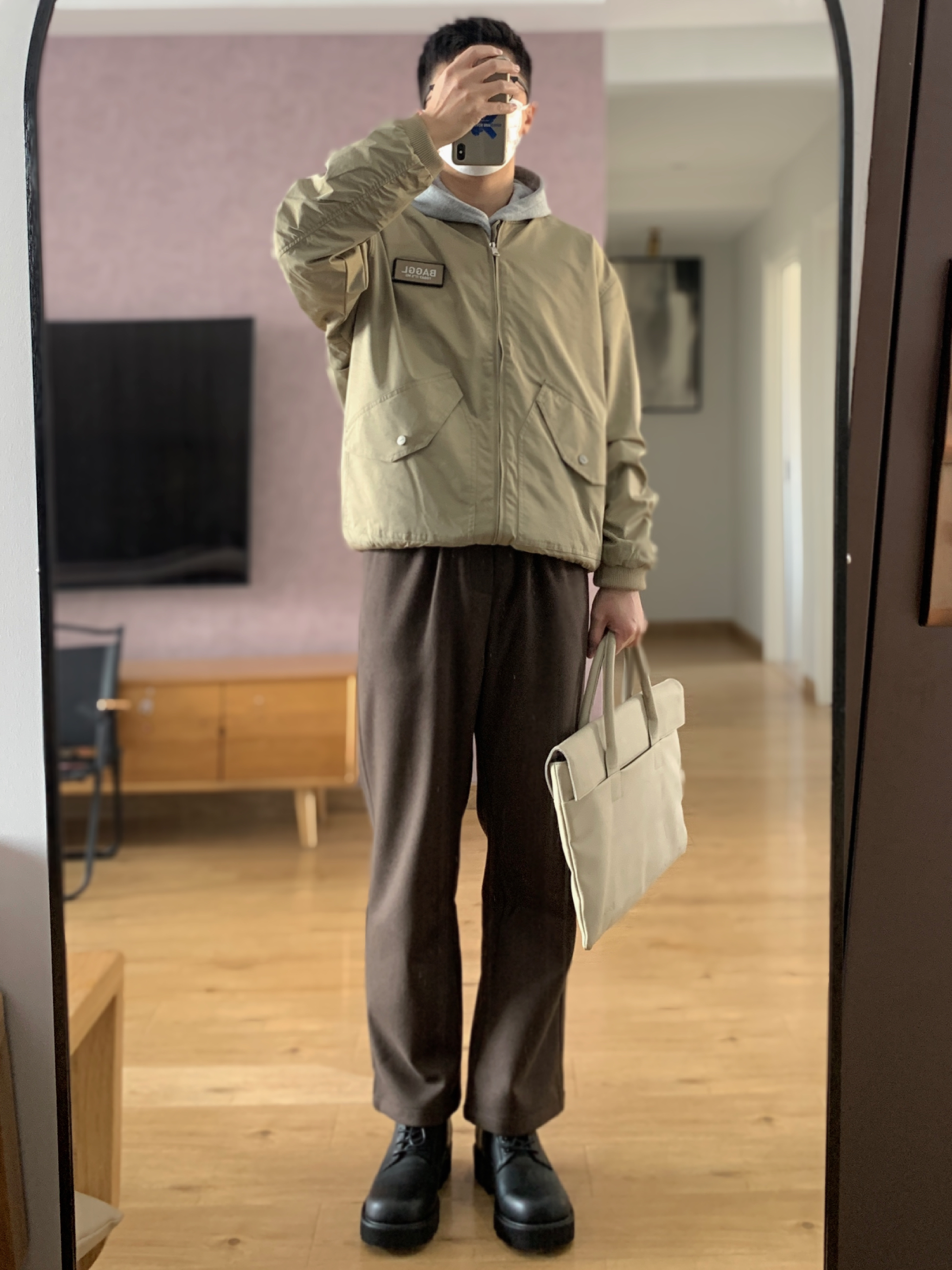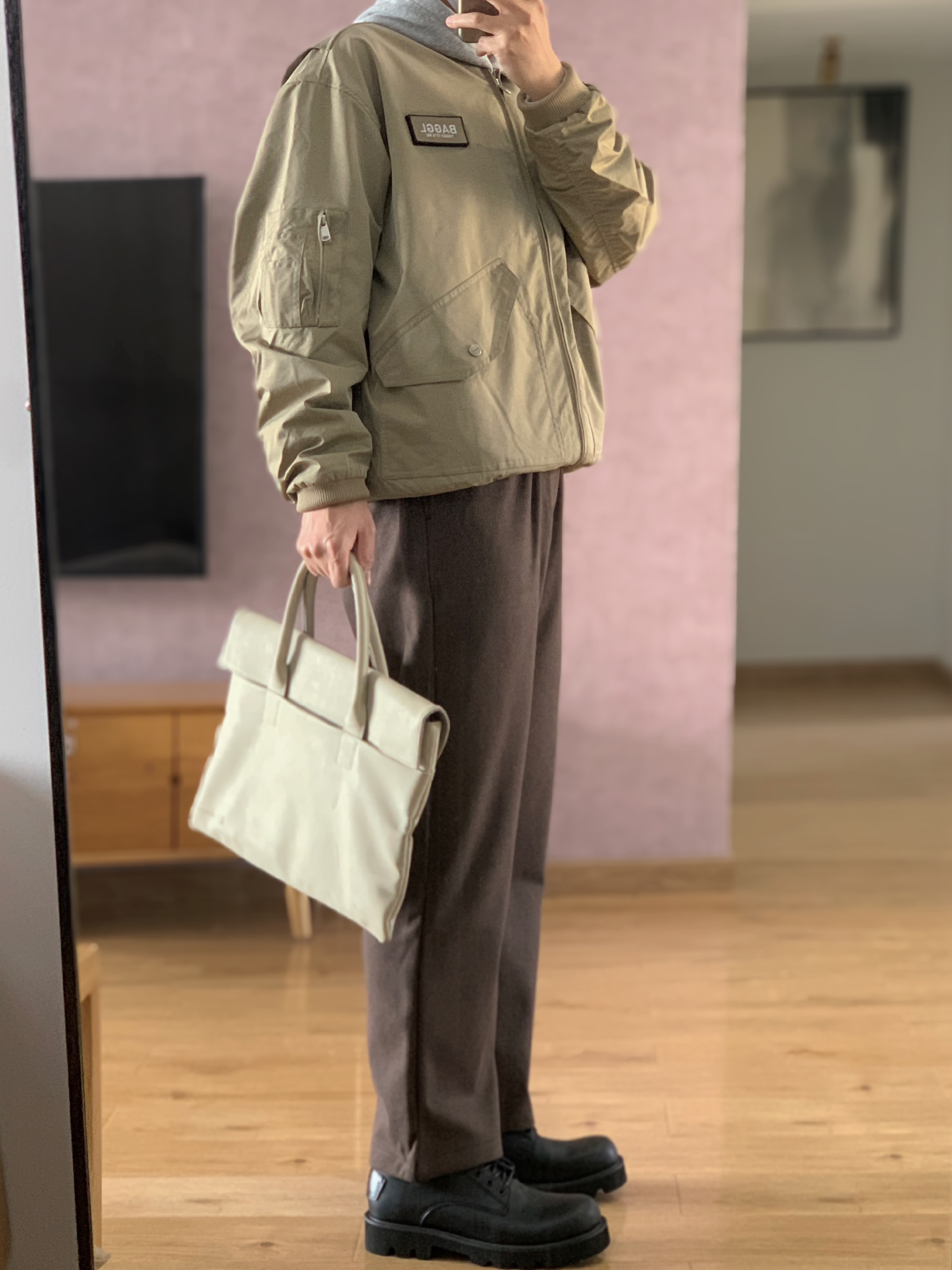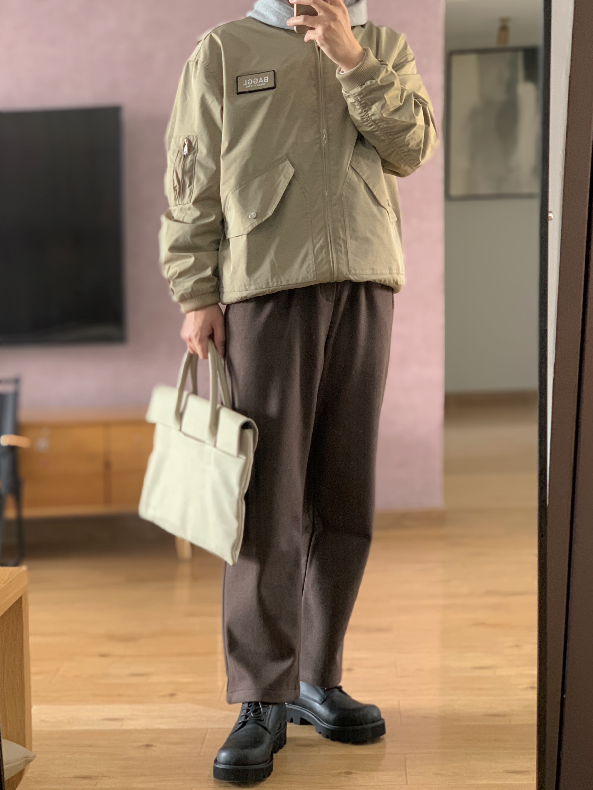 hey 这里是每天记录穿搭的社畜日记。 卡其色夹克 把螺纹下摆往内折变成短宽版型 超符合当下cleanfit的感觉😏 内搭一件灰色卫衣 帽子一戴谁都不爱。 下身一件同色系的咖色直筒卫裤 最后来一双超有味儿的德比鞋 今天的穿搭分享就这样啦,欢迎交流指点。