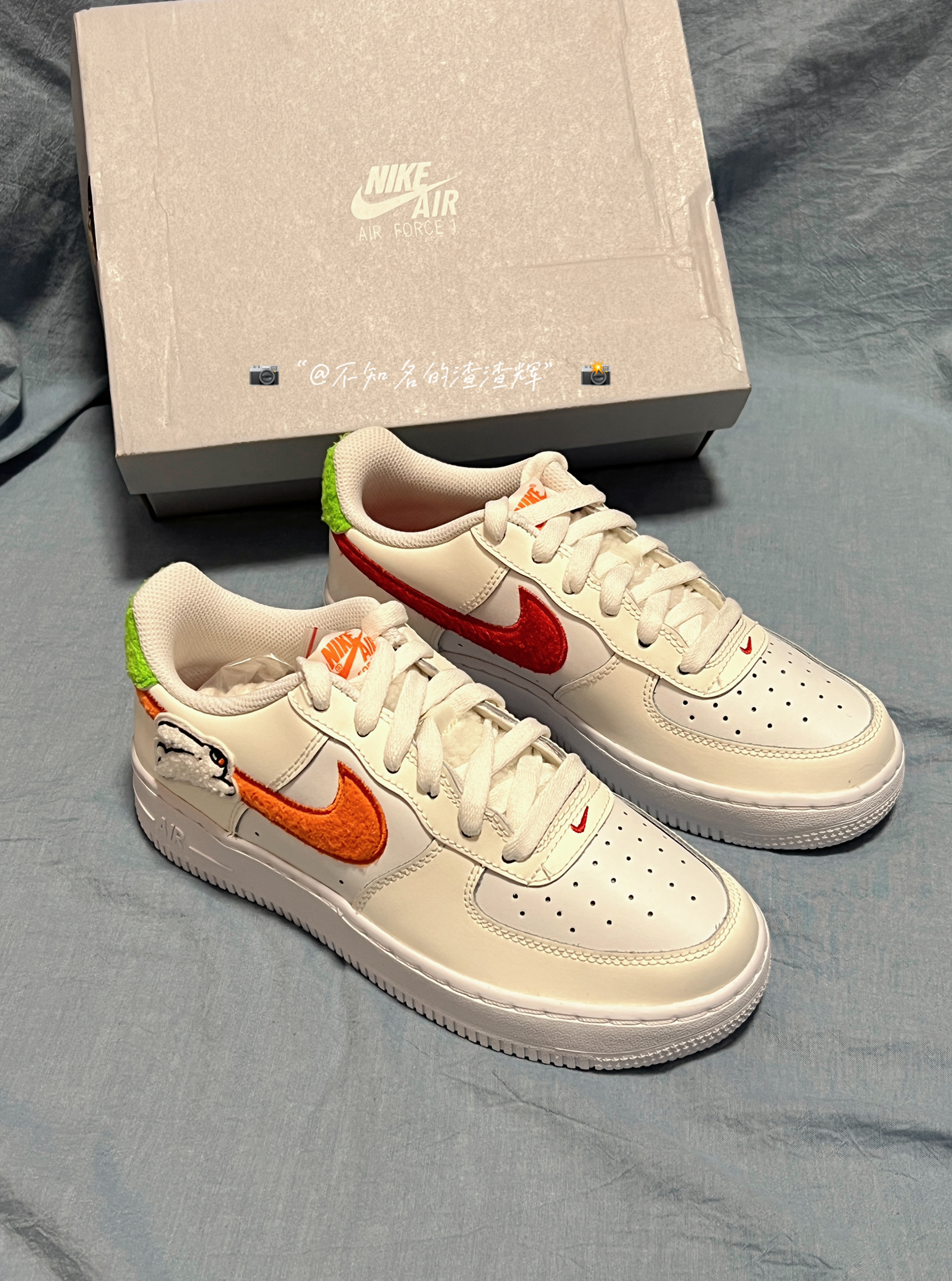 🐰:Nike Air Force 1 Low (GS)“Year of the Rabbit”防滑减震耐磨 低帮 板鞋 白色 🐰:这双鞋子整体以白色为主色调,外侧Swoosh采用橙色,内侧采用红色,为鞋子增添一份色彩感,鞋身小兔子图案,氛围感直接拉满,鞋身采用优质皮革材质和毛绒材质组成,质感舒适,中底Air Sole气垫为鞋子带来良好舒适脚感 🐰:很适合女孩子穿的鞋子,上脚很好看,而且很好搭衣...