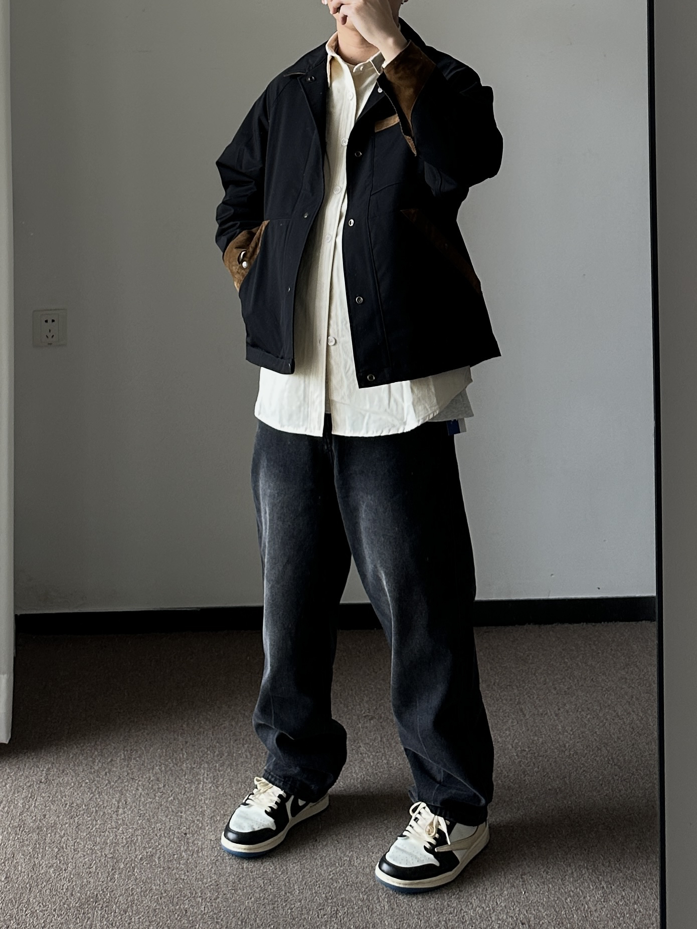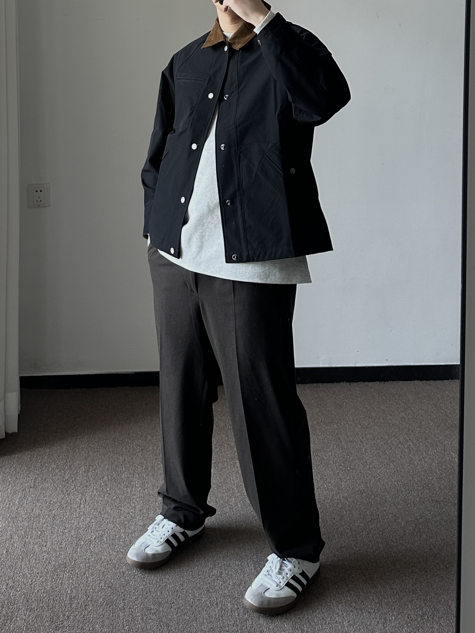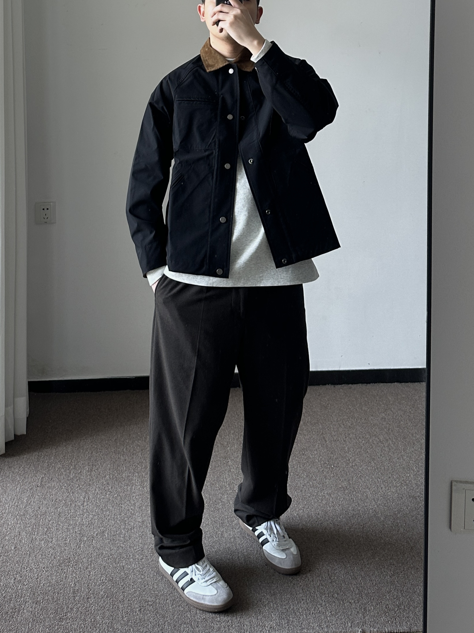 素人也能好看系列~174cm / 65kg 🧥- 很火的短款夹克,确实好看,正反两穿随意搭。 👖- 微宽松的深色牛仔裤,周五自在感满分。 👟- 复古板鞋,呼应内搭的颜色。