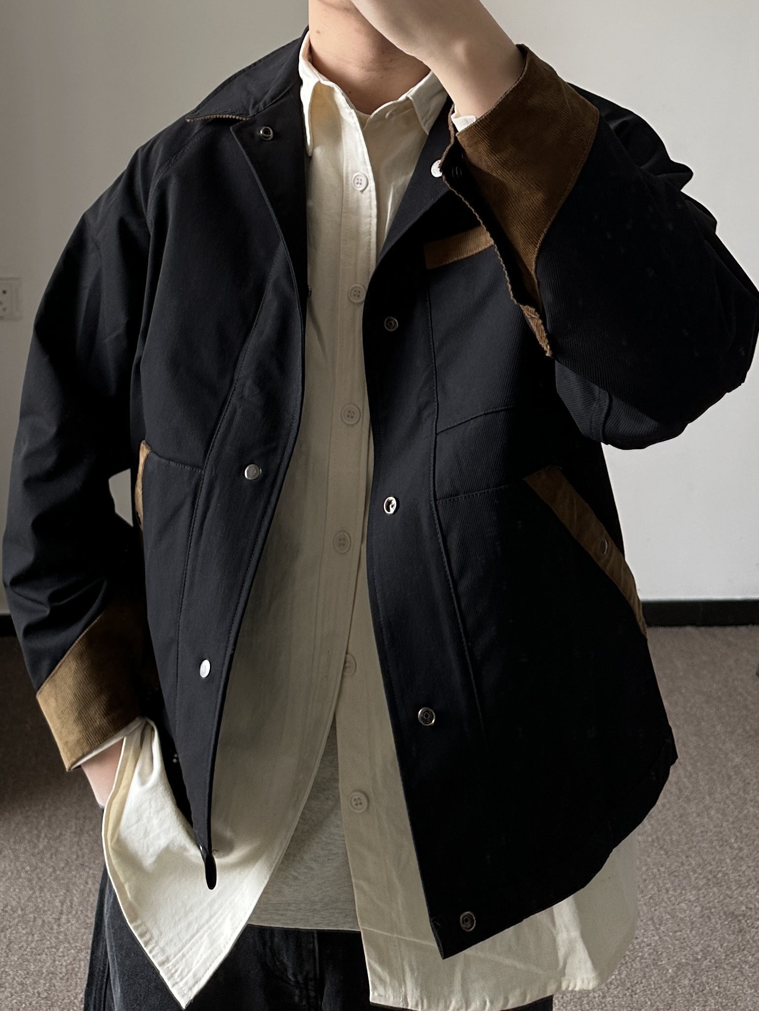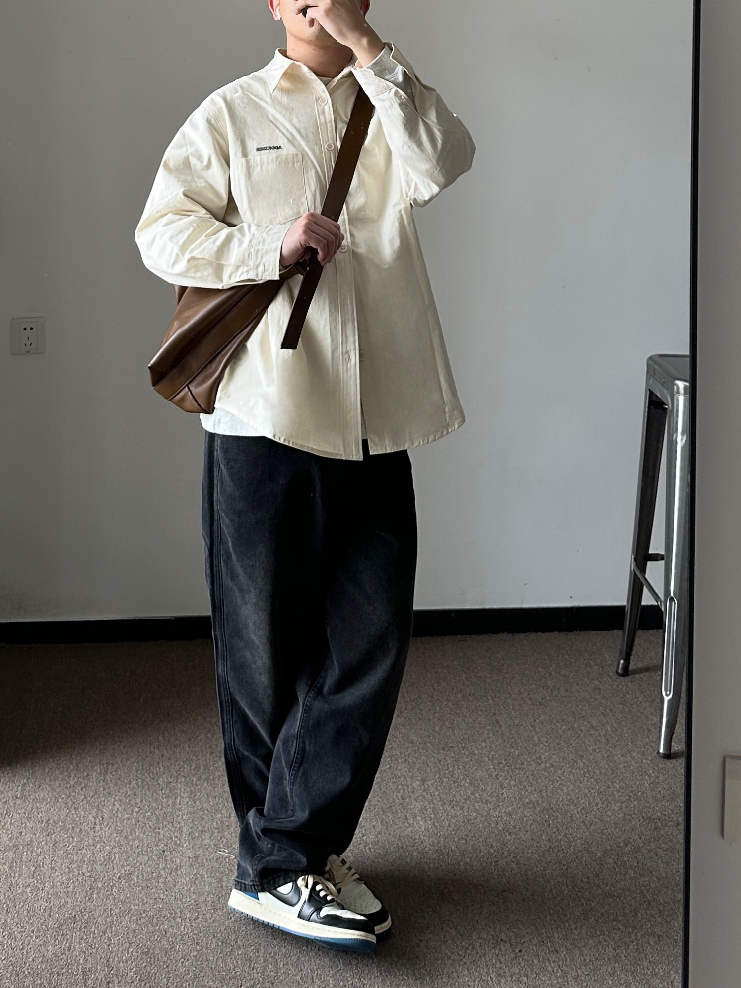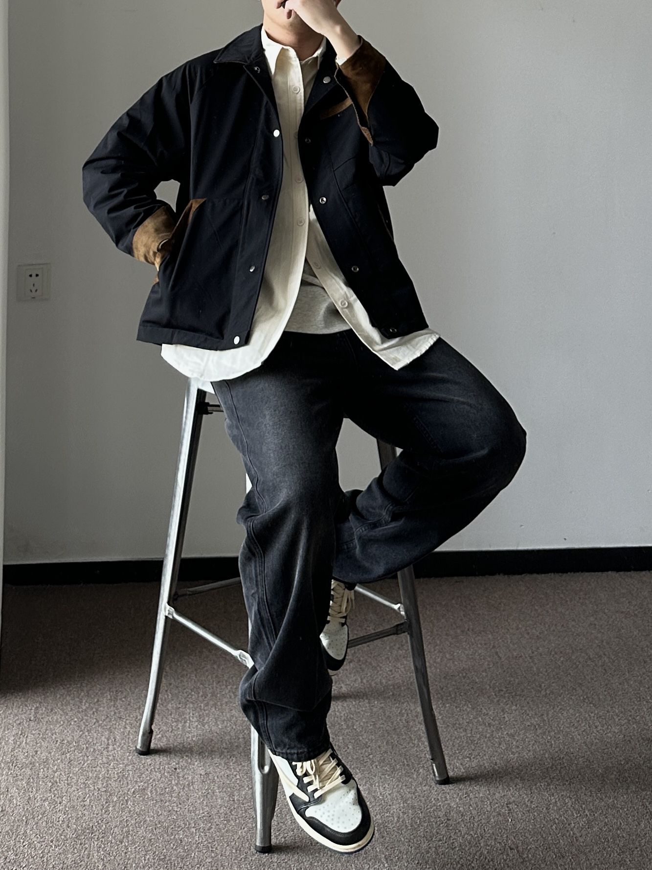 素人也能好看系列~174cm / 65kg 🧥- 很火的短款夹克,确实好看,正反两穿随意搭。 👖- 微宽松的深色牛仔裤,周五自在感满分。 👟- 复古板鞋,呼应内搭的颜色。