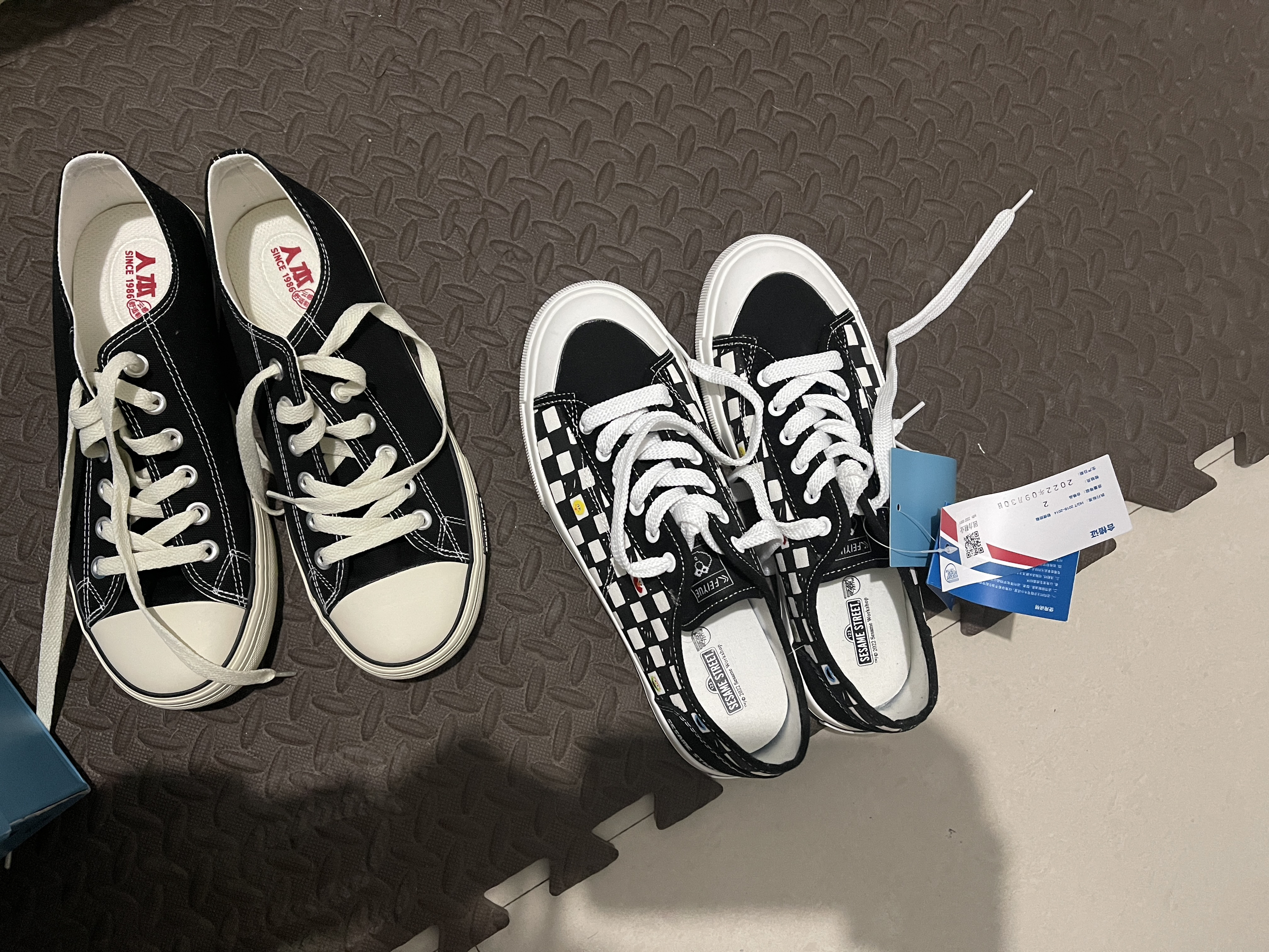 已经很久没有穿过帆布鞋了,最近突然想起来,最开始关注Vans,后面看很多网友推荐国产的回力、飞跃、人本这三家国产老品牌,于是从中挑选了两双。 距离我最近一次穿帆布鞋还是罗永浩直播时下单的,不过那款帆布鞋默认没有鞋垫,鞋底很薄硌脚,所以我记得应该是退货了。 这次买的两款帆布鞋,一款来自人本经典的1986,到手价格69元;另一款来自飞跃的一款“芝麻街”联名款,到手价格129元。 两款鞋都有泡...
