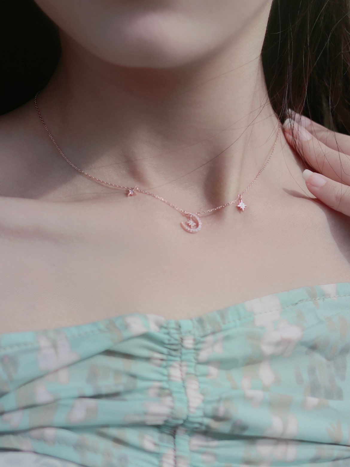 天气好好!绿色小裙子穿上啦 淡绿色牛油果色系的穿搭太绝了 春夏季就是穿小裙子的季节 不得搭配一条百搭又好看的锁骨链 月亮图案旁边还有两个星星点缀 阳光下闪闪发亮! 精美的酒红色外包装礼盒 打开礼盒内部是心型设计的 女生看了都会心动~ 送给女朋友 母亲都是个很不错的选择啦 #周大福 MONOLOGUE #甜蜜饰爱 #情人节送礼心得 #2023年第一件好物 #开学动起来 #开学换身行头