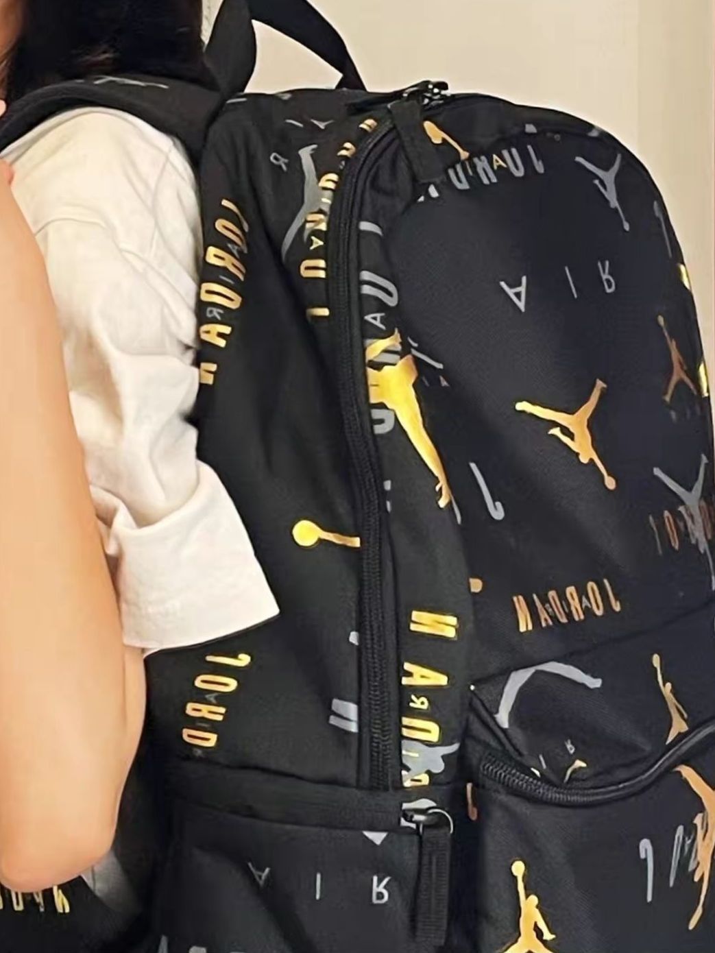 金色logo搭配黑色包底,永不过时!让整体包包变得格调很高,容量自然不说,足够让人装个笔记本,书本,篮球等等没问题。还有一点,黑色真的是非常的耐脏。 建议165以上的人背,鄙人161背这个包显得我整个人小小的哈哈,但是我滴朋友试背妥妥的帅气,我觉得男生女生都很适合。喜欢的朋友可以入手的,性价比很高的。