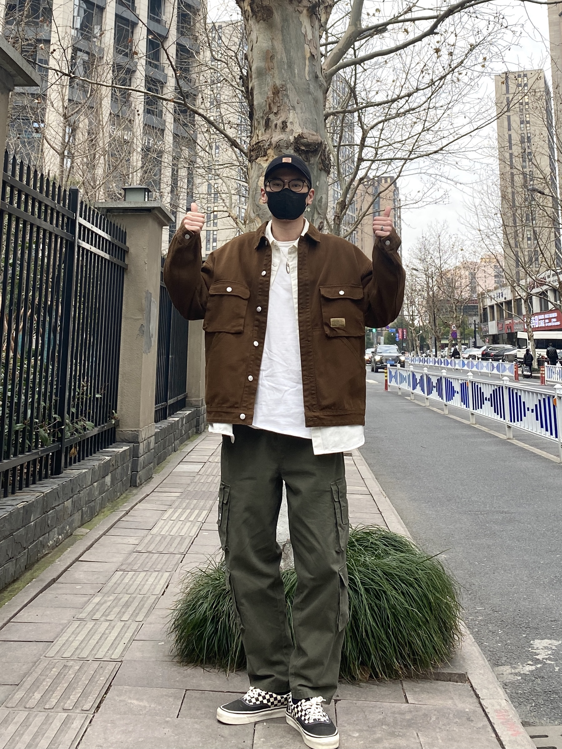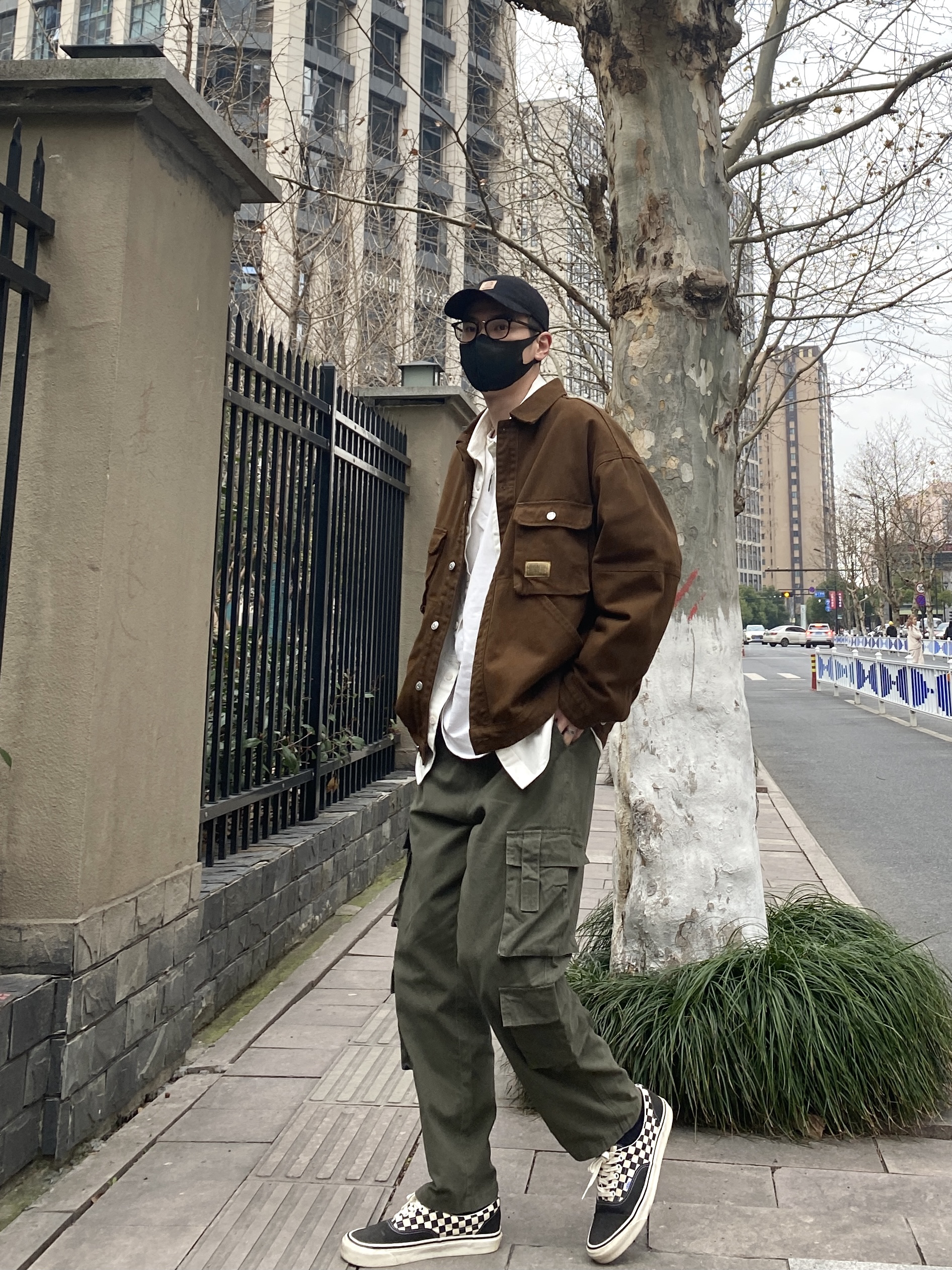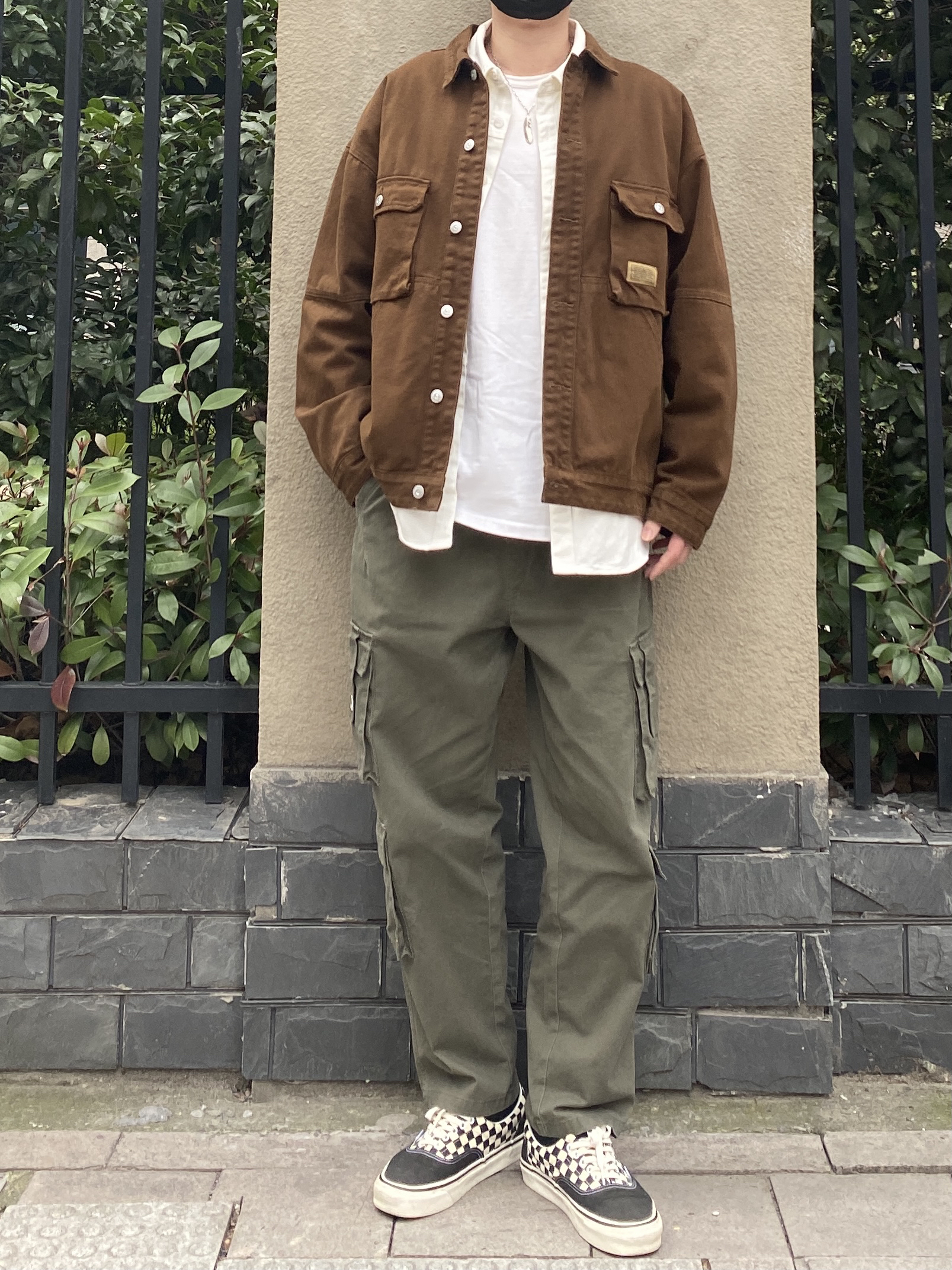 今天这套先用清爽干净的白色工装衬衫做内搭,裤子选择不挑腿型的军绿色直筒工装裤,鞋子上脚经典百搭的vans棋盘格,接着套上咖啡色多口袋重磅工装夹克,最后戴一顶黑色水洗棒球帽,OK,出门看看搭配效果吧! - 今日穿搭 衣服裤子:NICE LILI 鞋子:vans棋盘格