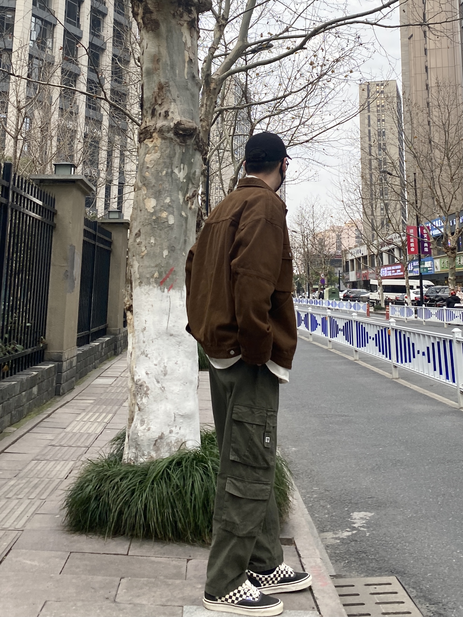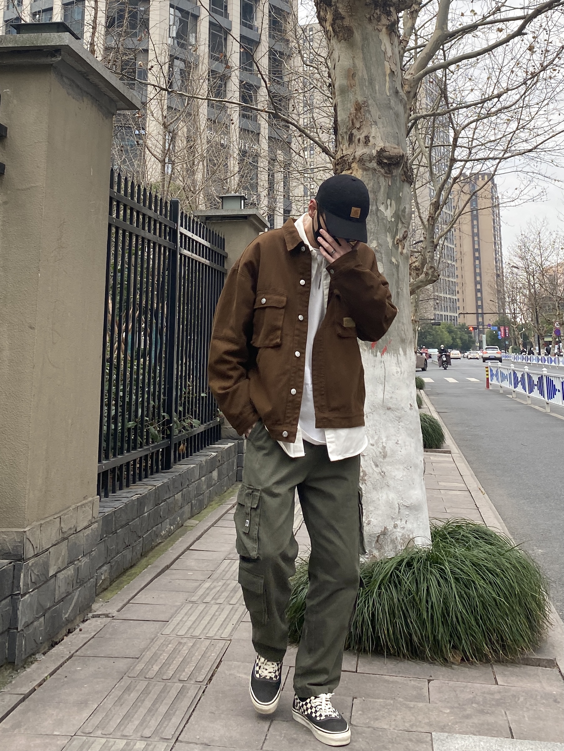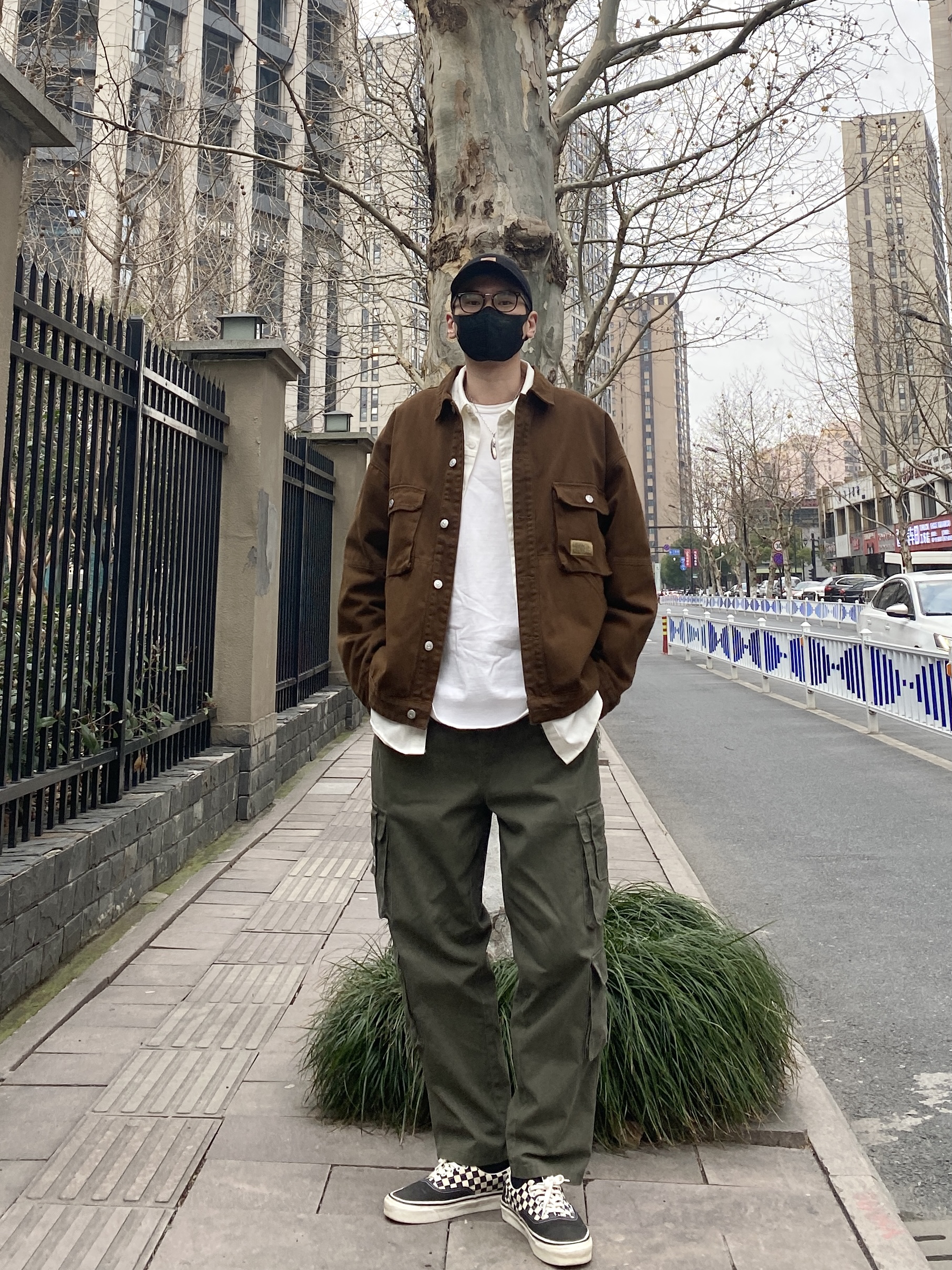 今天这套先用清爽干净的白色工装衬衫做内搭,裤子选择不挑腿型的军绿色直筒工装裤,鞋子上脚经典百搭的vans棋盘格,接着套上咖啡色多口袋重磅工装夹克,最后戴一顶黑色水洗棒球帽,OK,出门看看搭配效果吧! - 今日穿搭 衣服裤子:NICE LILI 鞋子:vans棋盘格