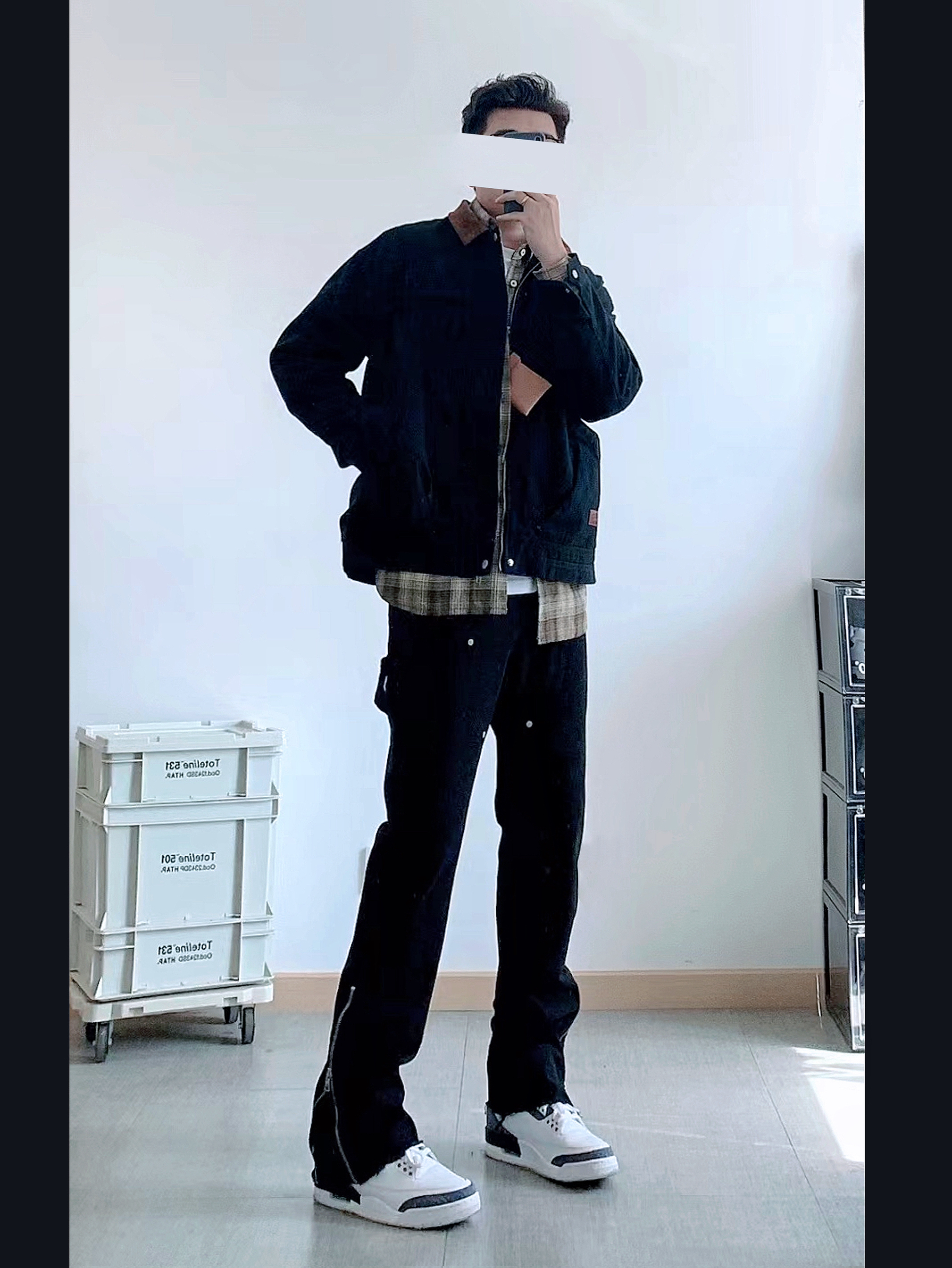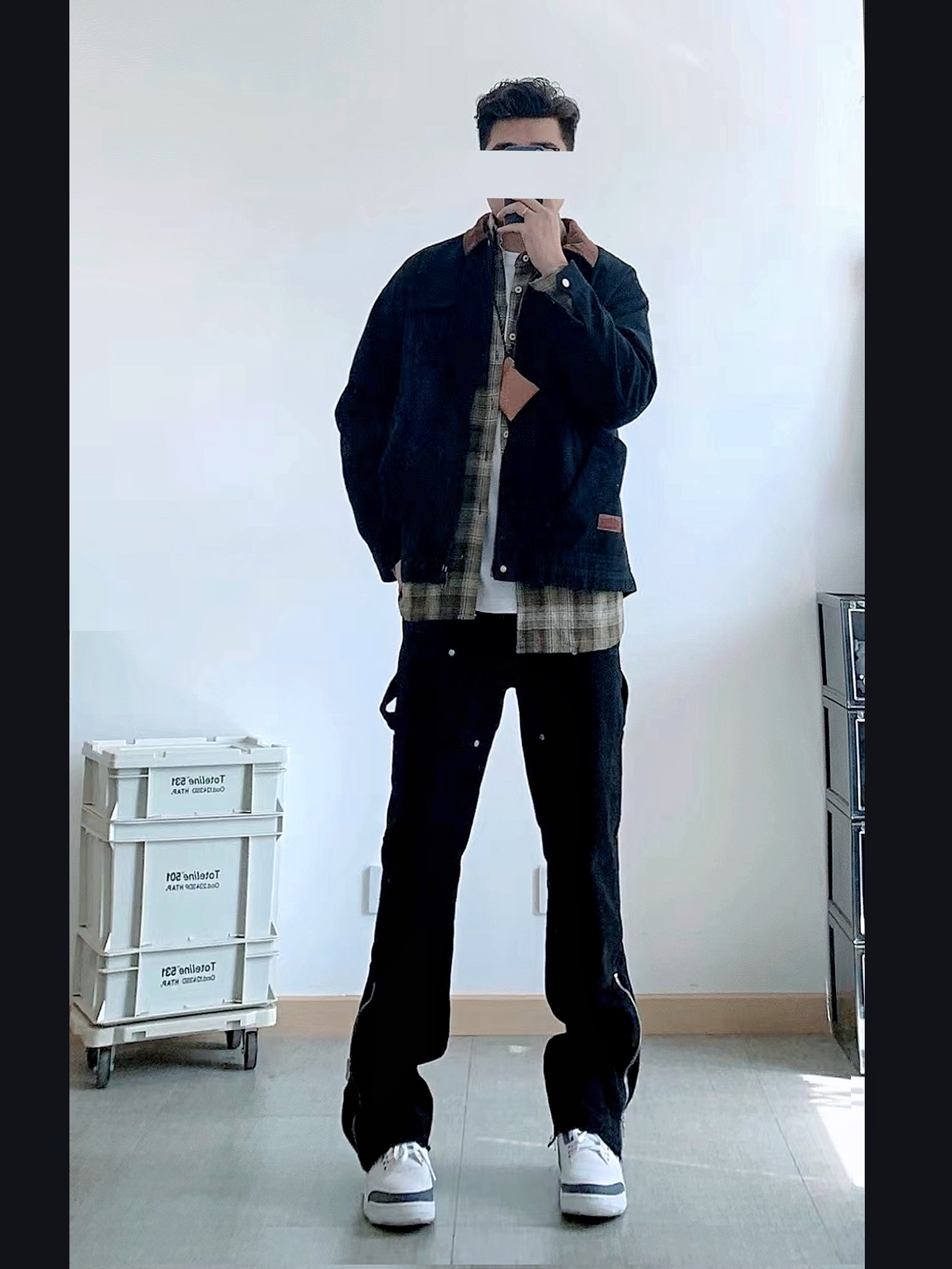 ▪️适合男生的早春约会通勤穿搭 ▪️拼色翻领工装夹克 硬朗帅气 ▪️搭配黑色微喇工装裤炒显腿长! ▪️整体all black色系低调出街✌🏻 ——