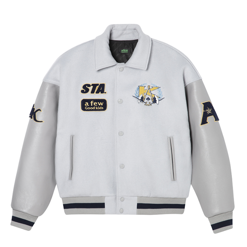这款是STA X AFGK联名毛呢皮袖拼接棒球夹克,这种设计的衣服真的是很适合喜欢复古风格的小哥哥们穿。 秋天的时候不知道该如何穿搭的话,那么你一定要ge t这一款! 这款棒球夹克是非常有个性的,可以搭配一条黑色的工装裤就很好看了,又酷又显得帅气。 图片来源网络侵删!