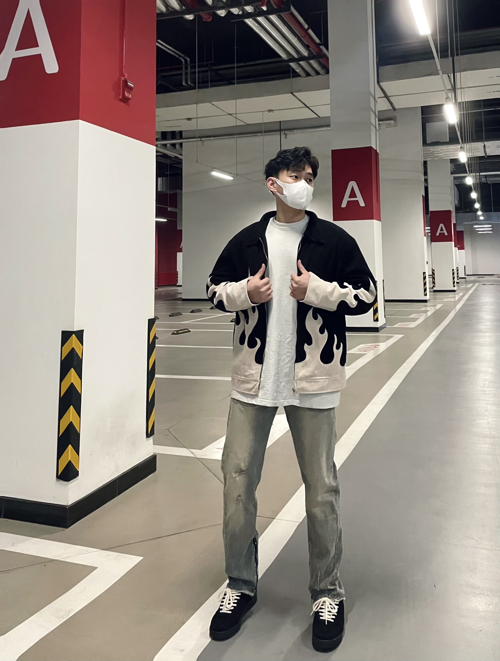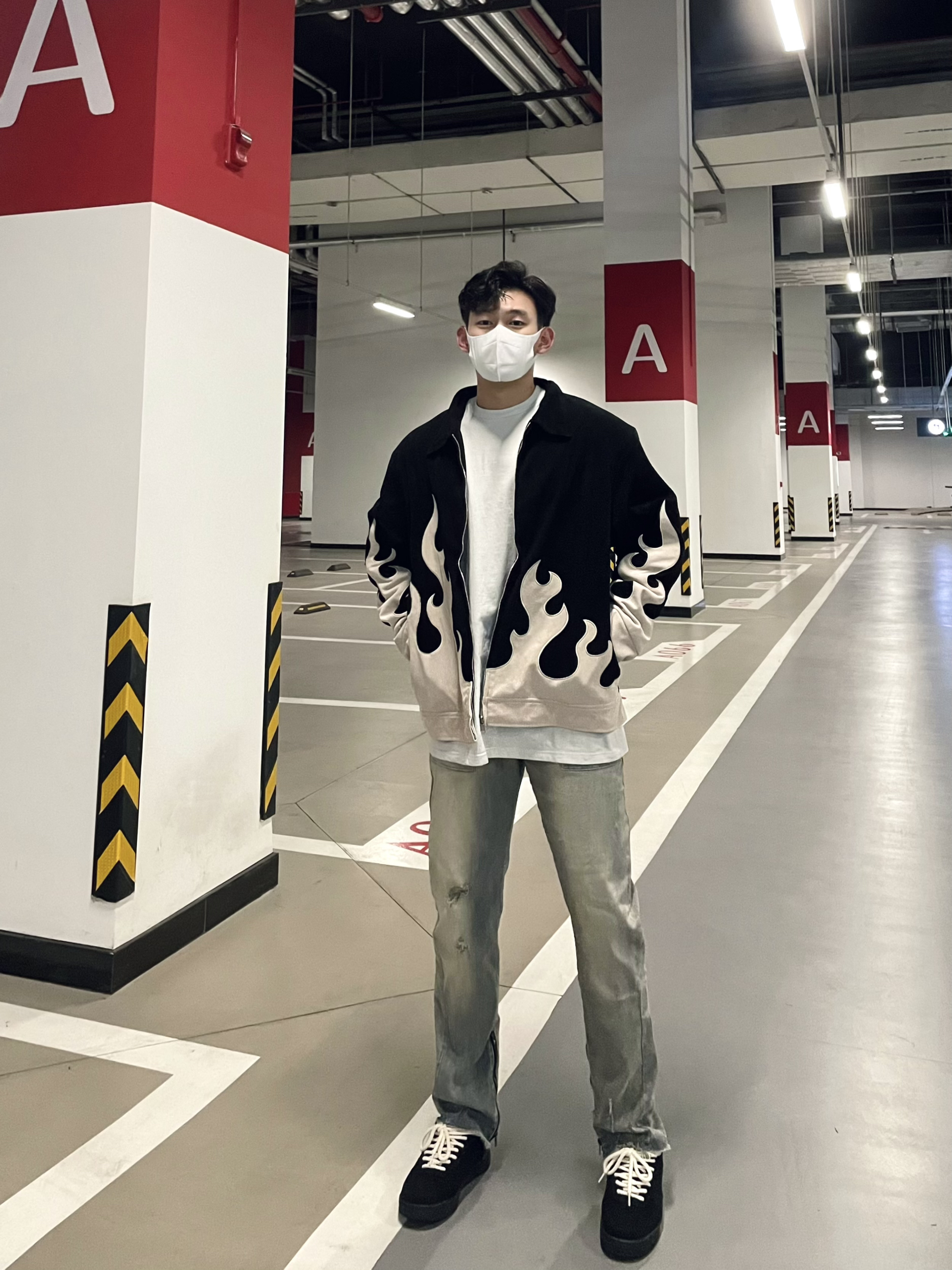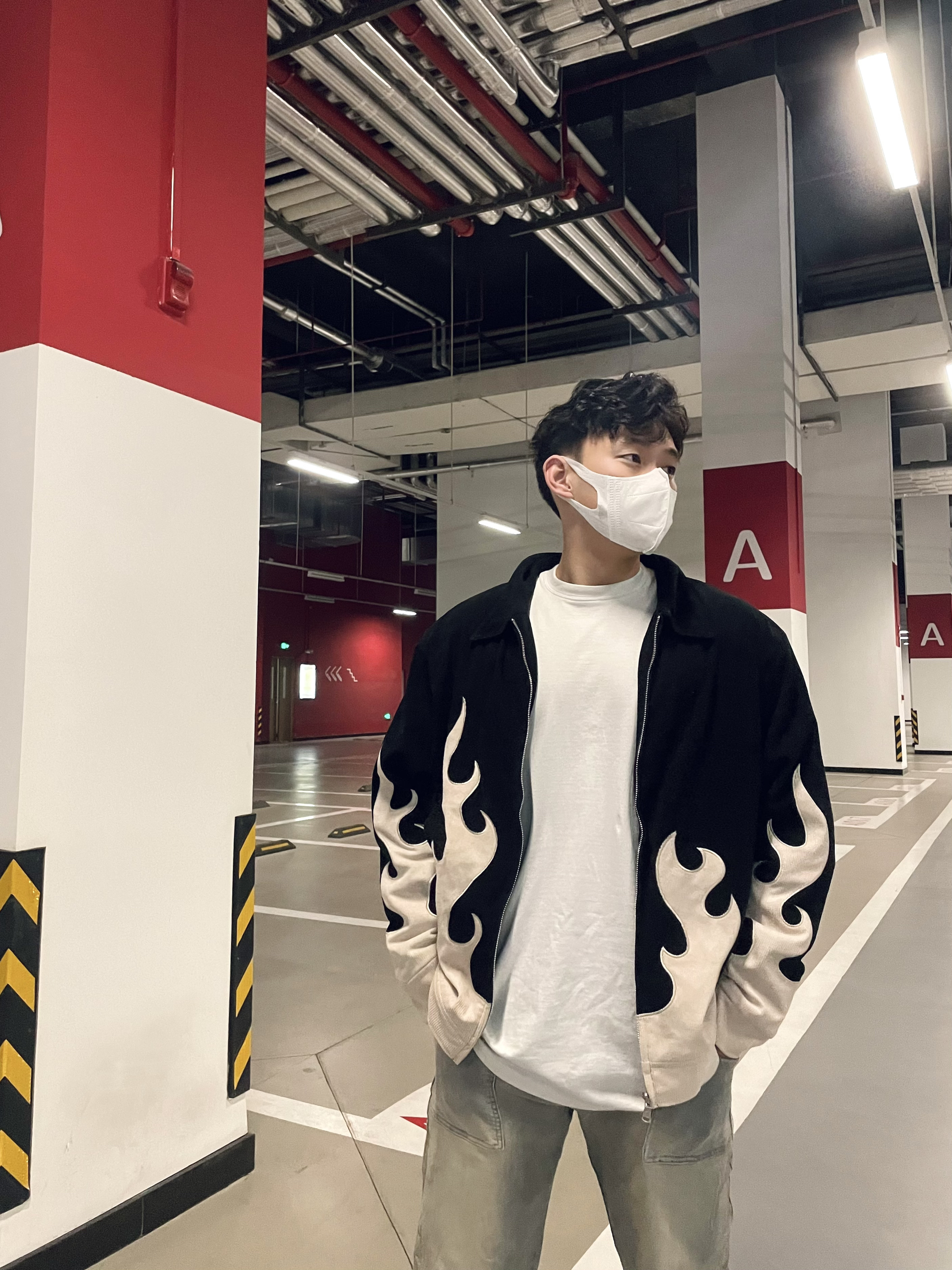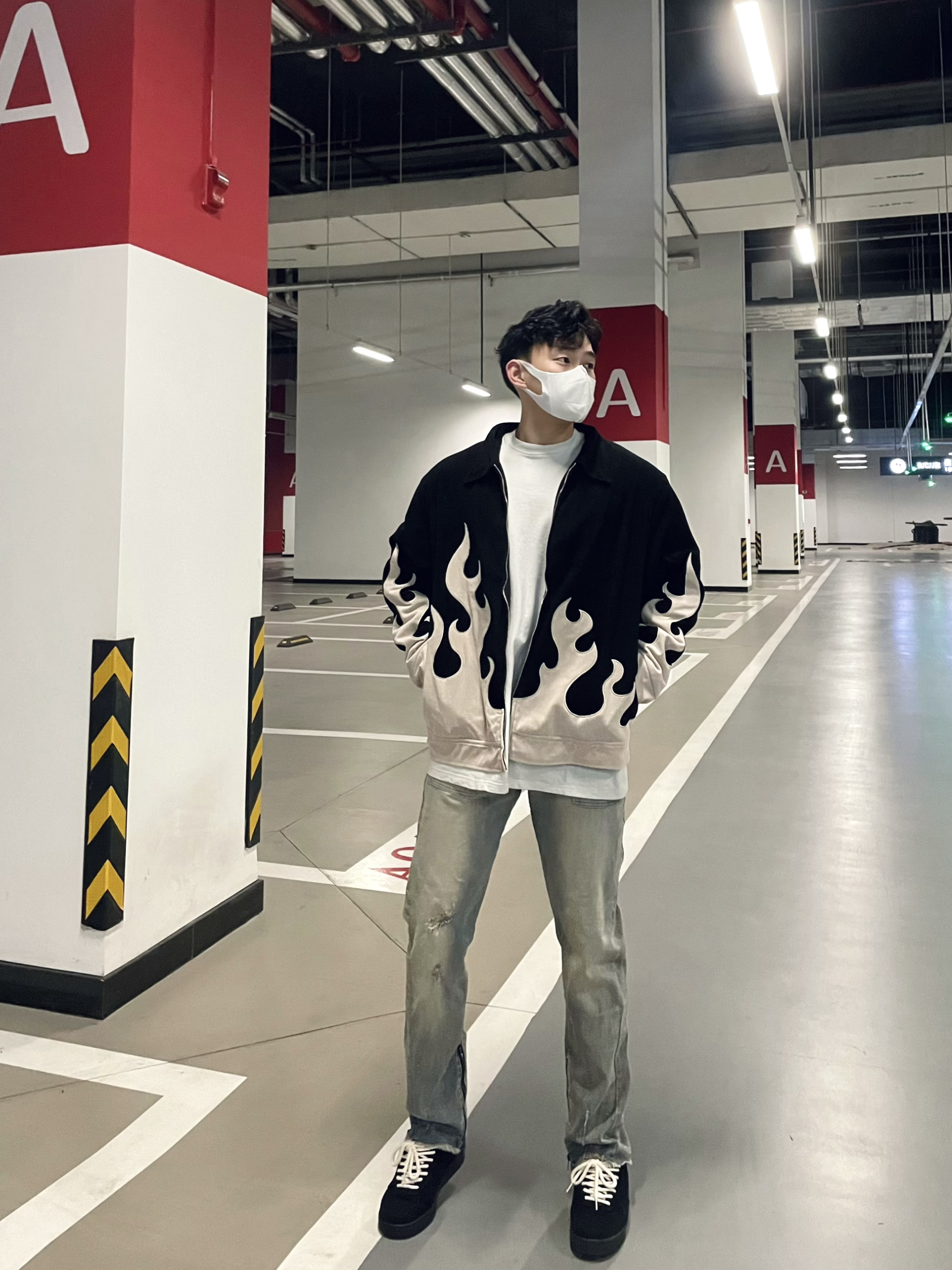 今日份男生穿搭 春秋来临之际 夹克是男生的必备衣服 如何在人群中脱颖而出 一件帅气的夹克是万能单品 火焰印花的夹克 真的个性十足 坚挺的版型又特别显身材 上身效果超级帅气!