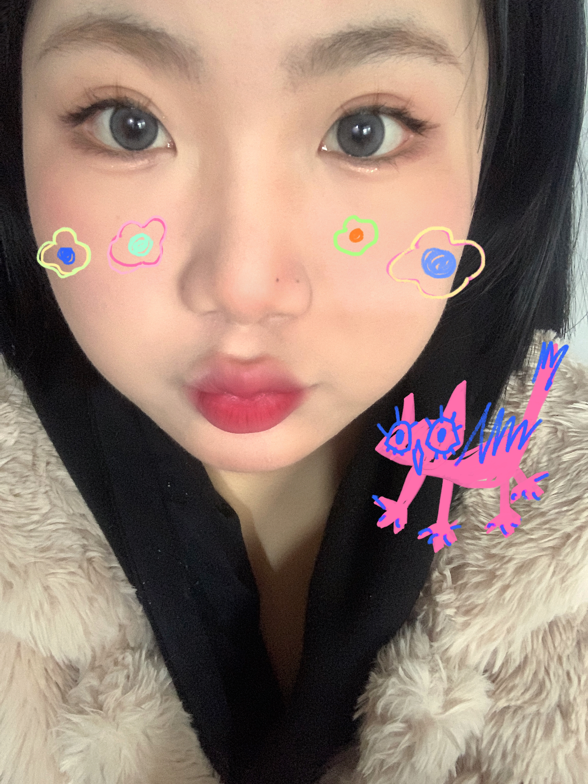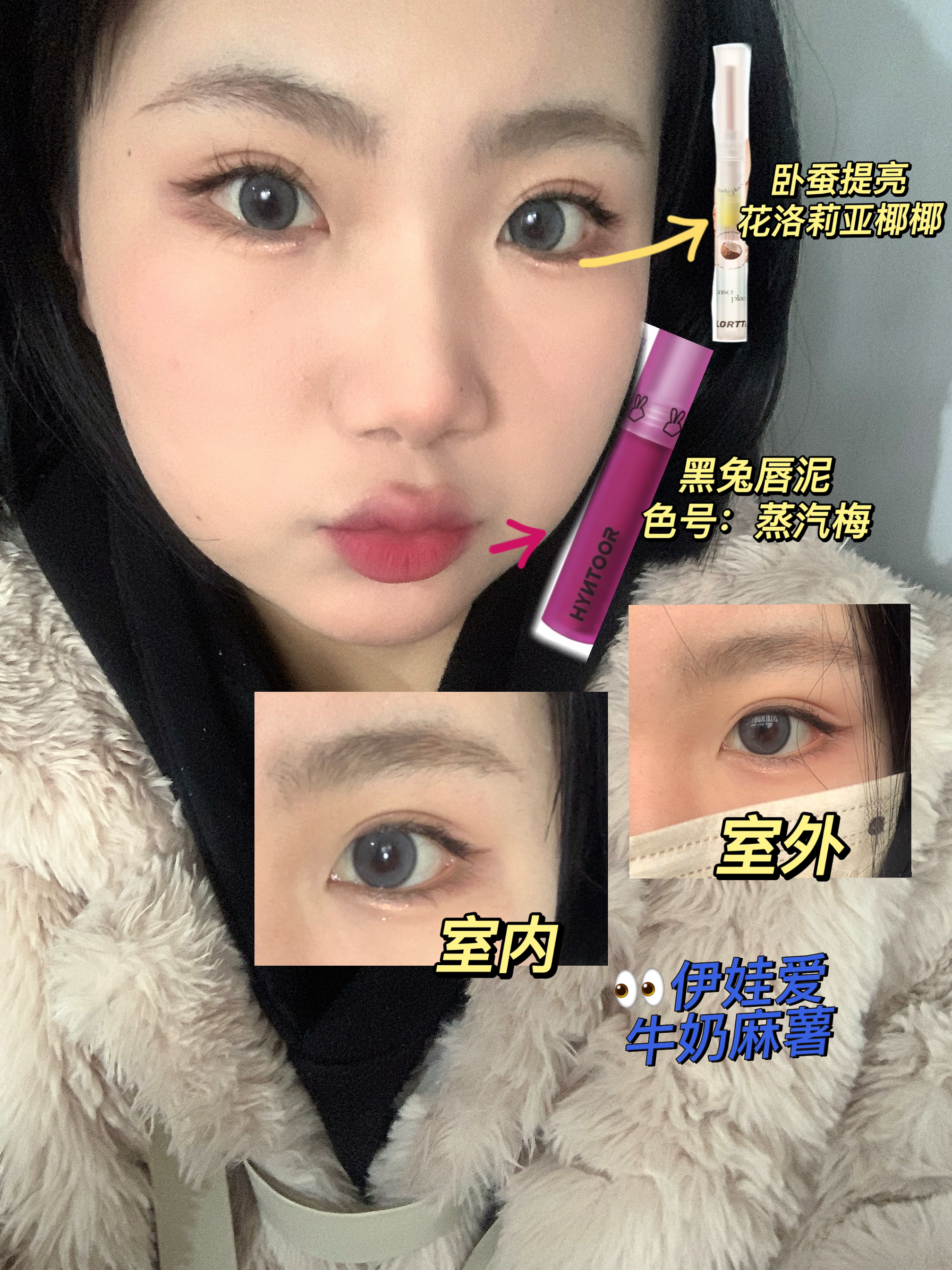眼珠珠:伊娃爱 牛奶麻薯 口红:黑兔唇泥蒸汽梅 紫调没有那么重 很显白 卧蚕:花洛莉亚卧蚕笔 椰椰