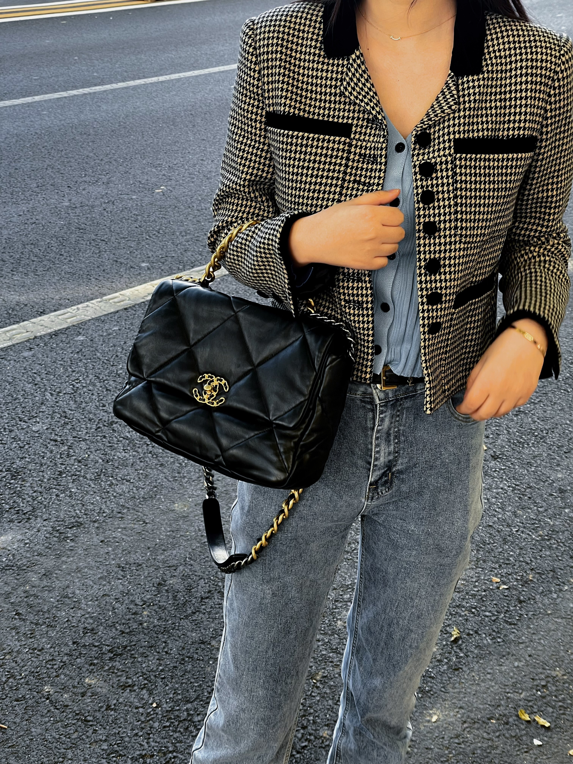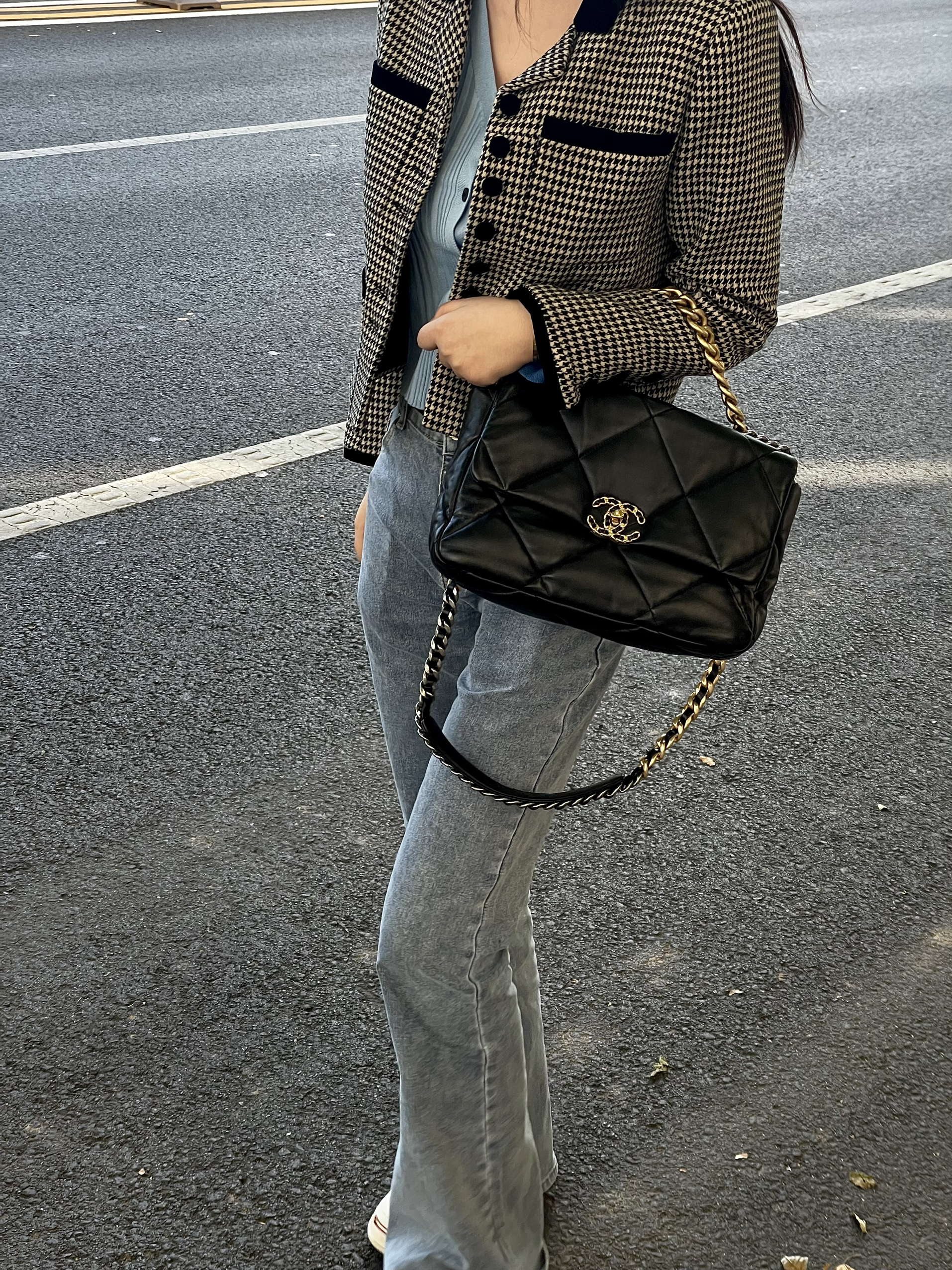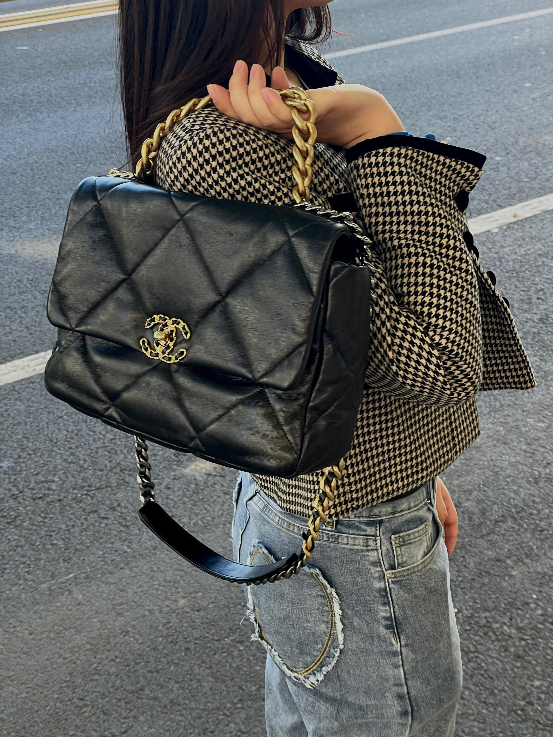 🎒单品介绍(品牌|款式):香奈儿19bag(黑金配色) 💰价格参考:4w+ 🛒尺寸容量:手机、车钥匙、钱包、纸巾、粉饼、都完全可以装下,水杯就不太行 🧍♂️ 搭配技巧(风格|场合):经典百搭!秋冬都适合背!怎么搭都不会出错~ 而且这款包包手感也超级好,也不是特别娇气,如果一直还没有买一个小香可以考虑这款,很值得❗️