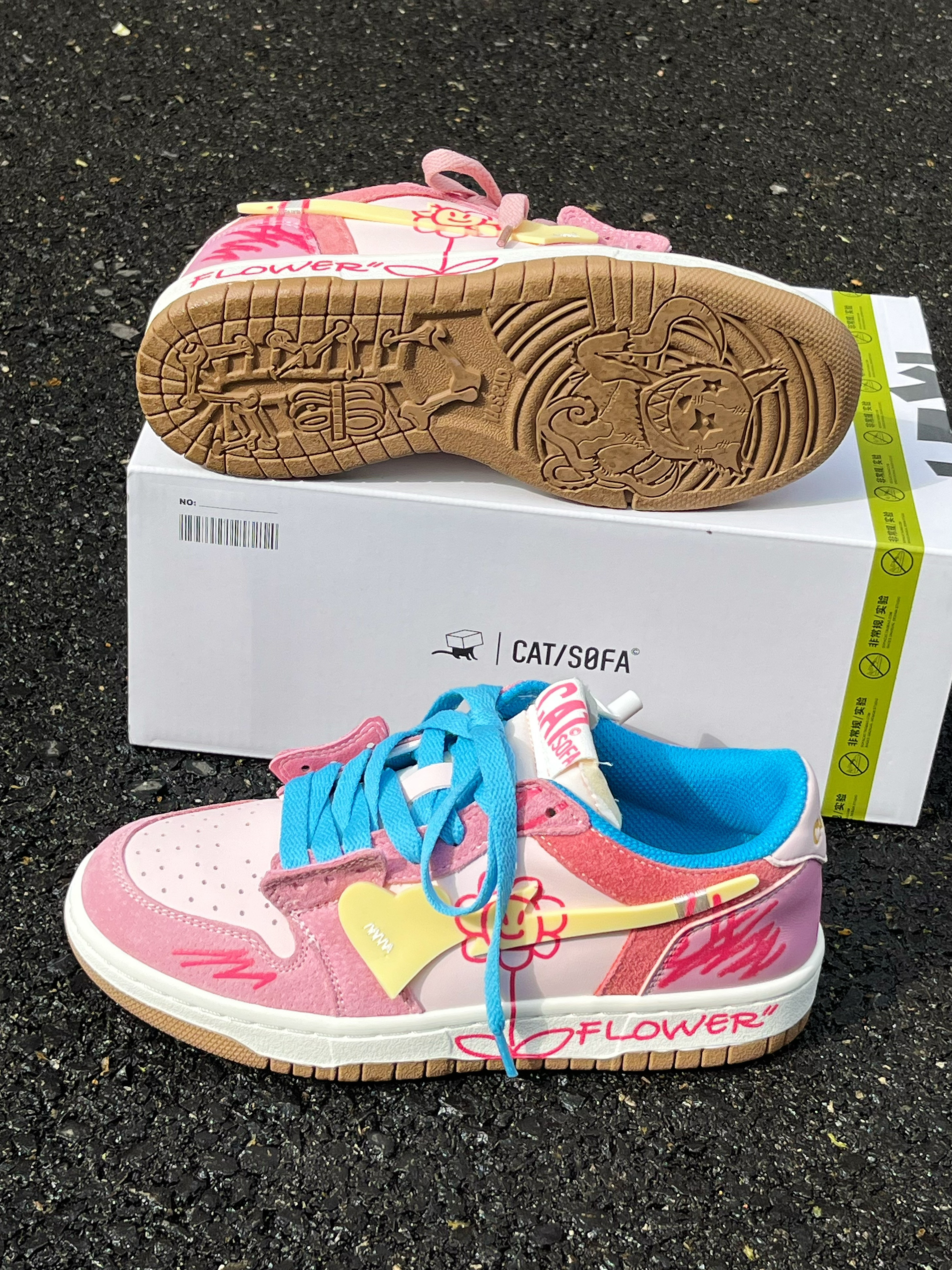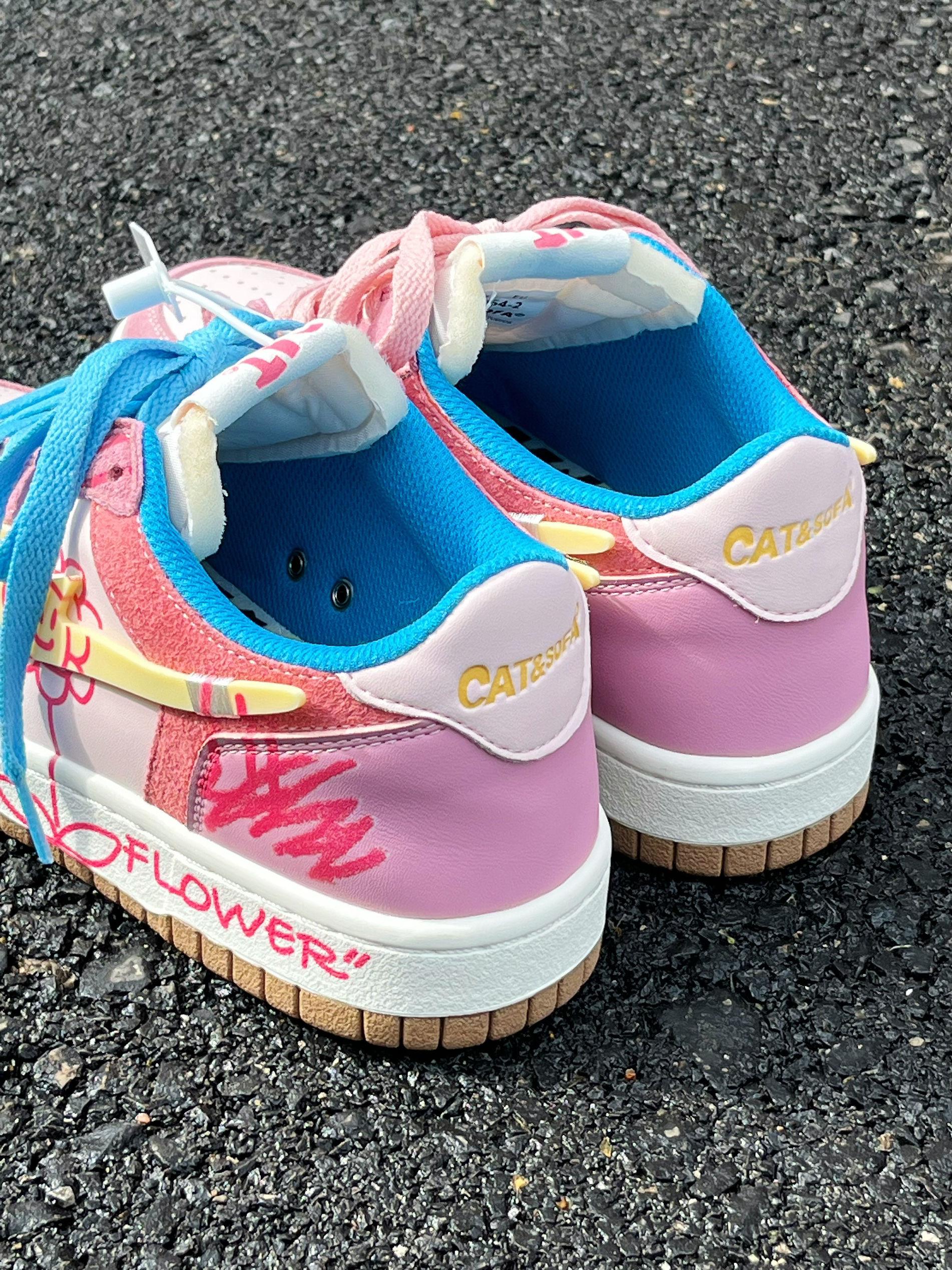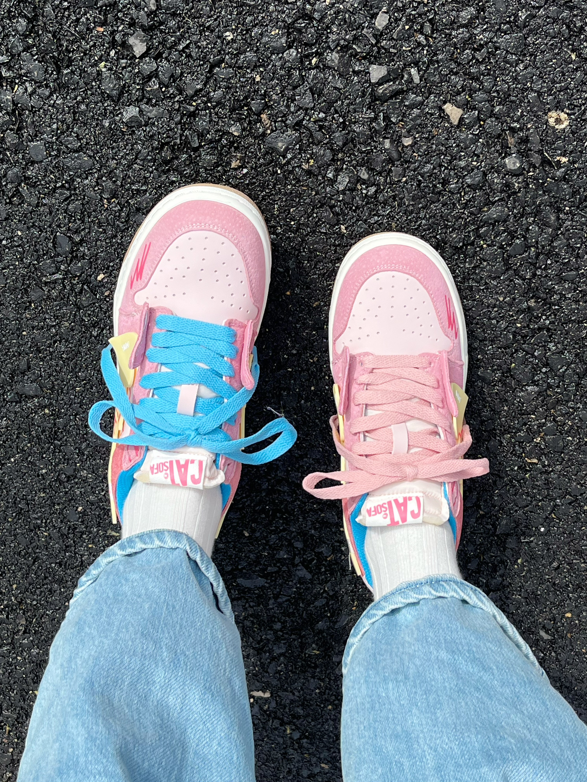 粉蓝两副鞋带,可以鸳鸯也可以叠穿, 鞋底依旧是叛逆的小猫🐈 咋看都觉着好好看~
