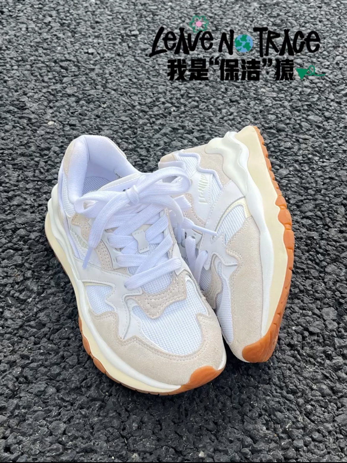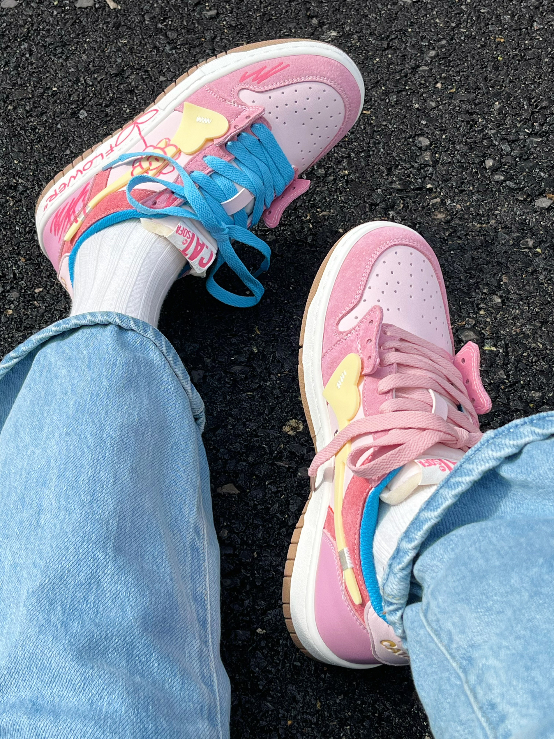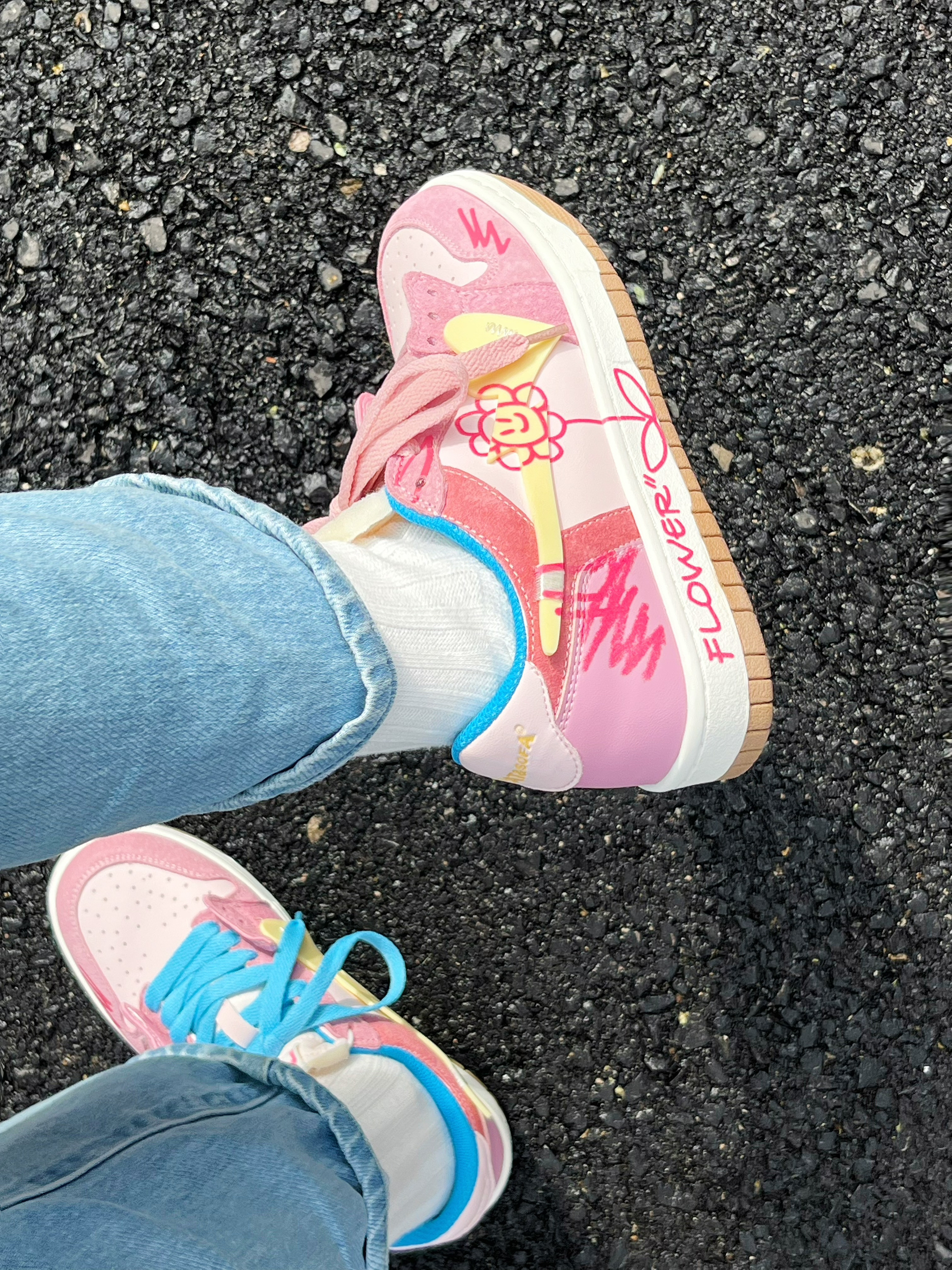 粉蓝两副鞋带,可以鸳鸯也可以叠穿, 鞋底依旧是叛逆的小猫🐈 咋看都觉着好好看~