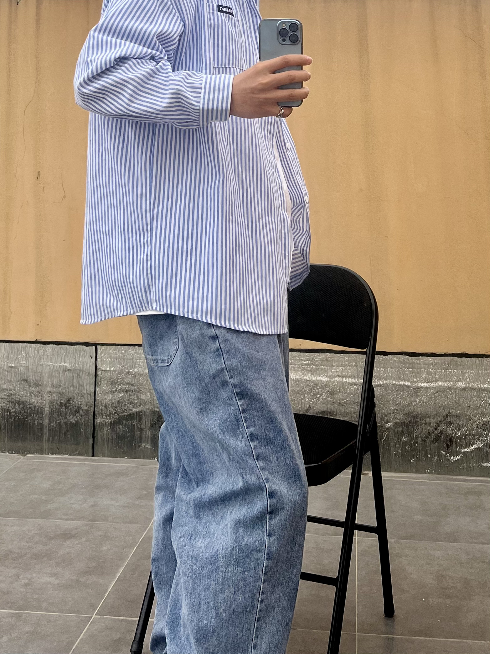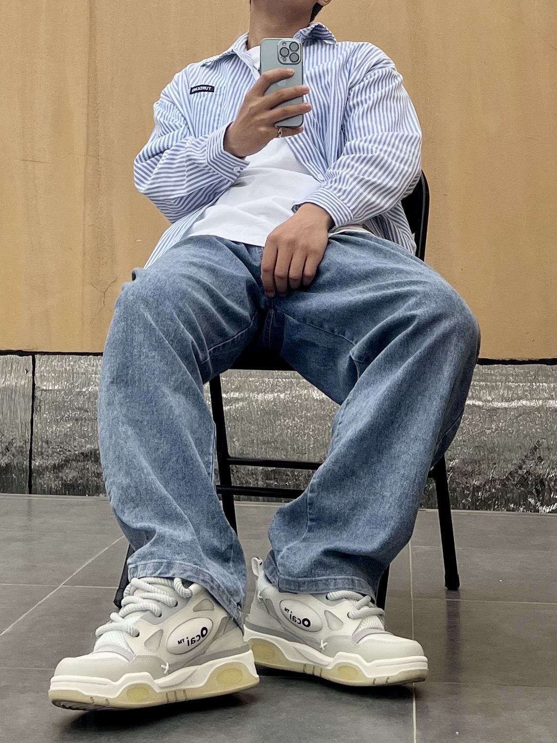 身高|体重:身高175 体重140 尺码XL 🧍♂️ 穿搭风格:休闲简约风 👔 上衣:是一件条纹衬衫 很有少年感的气息 很不错 👖 下装:一条蓝色牛仔裤 搭配起来上身还是蛮好看的