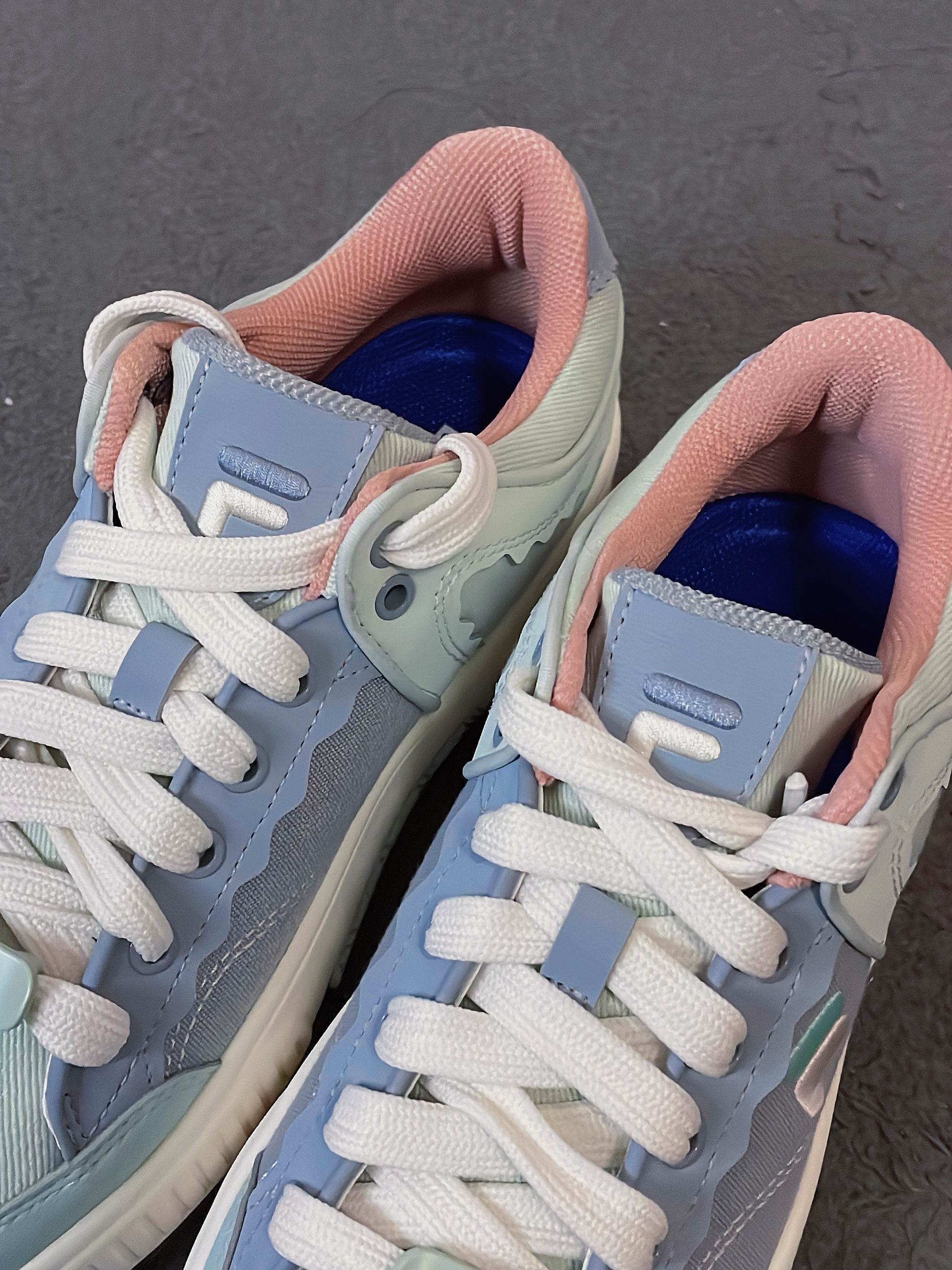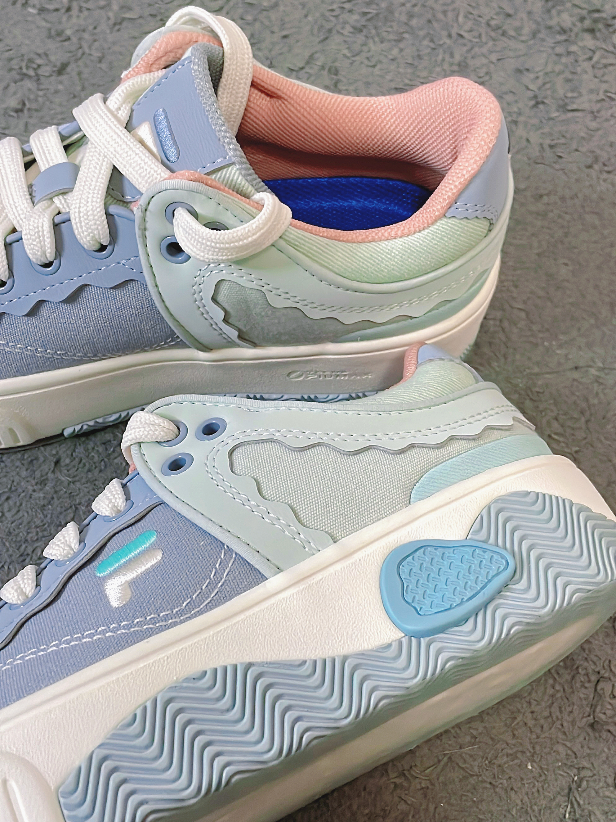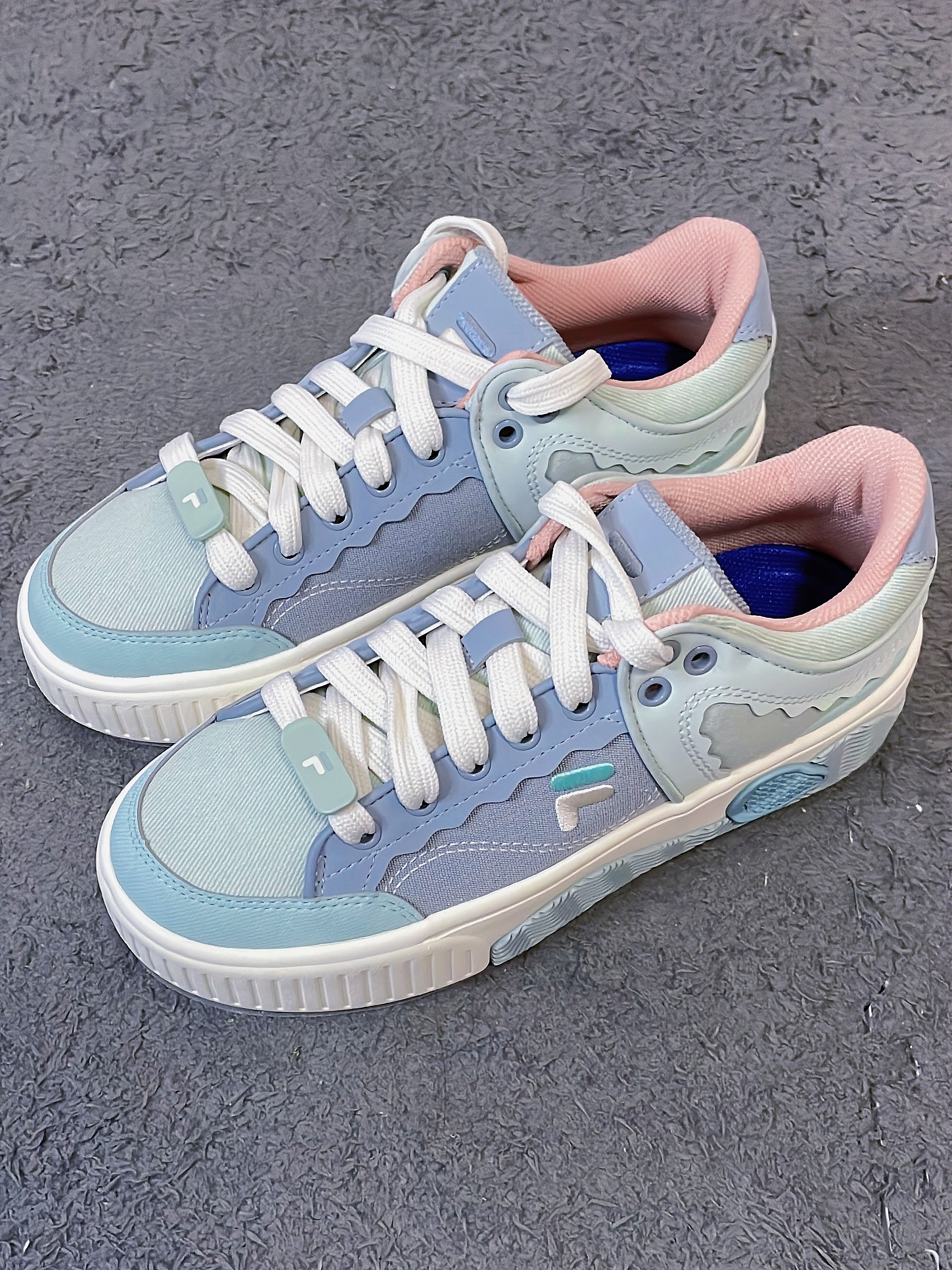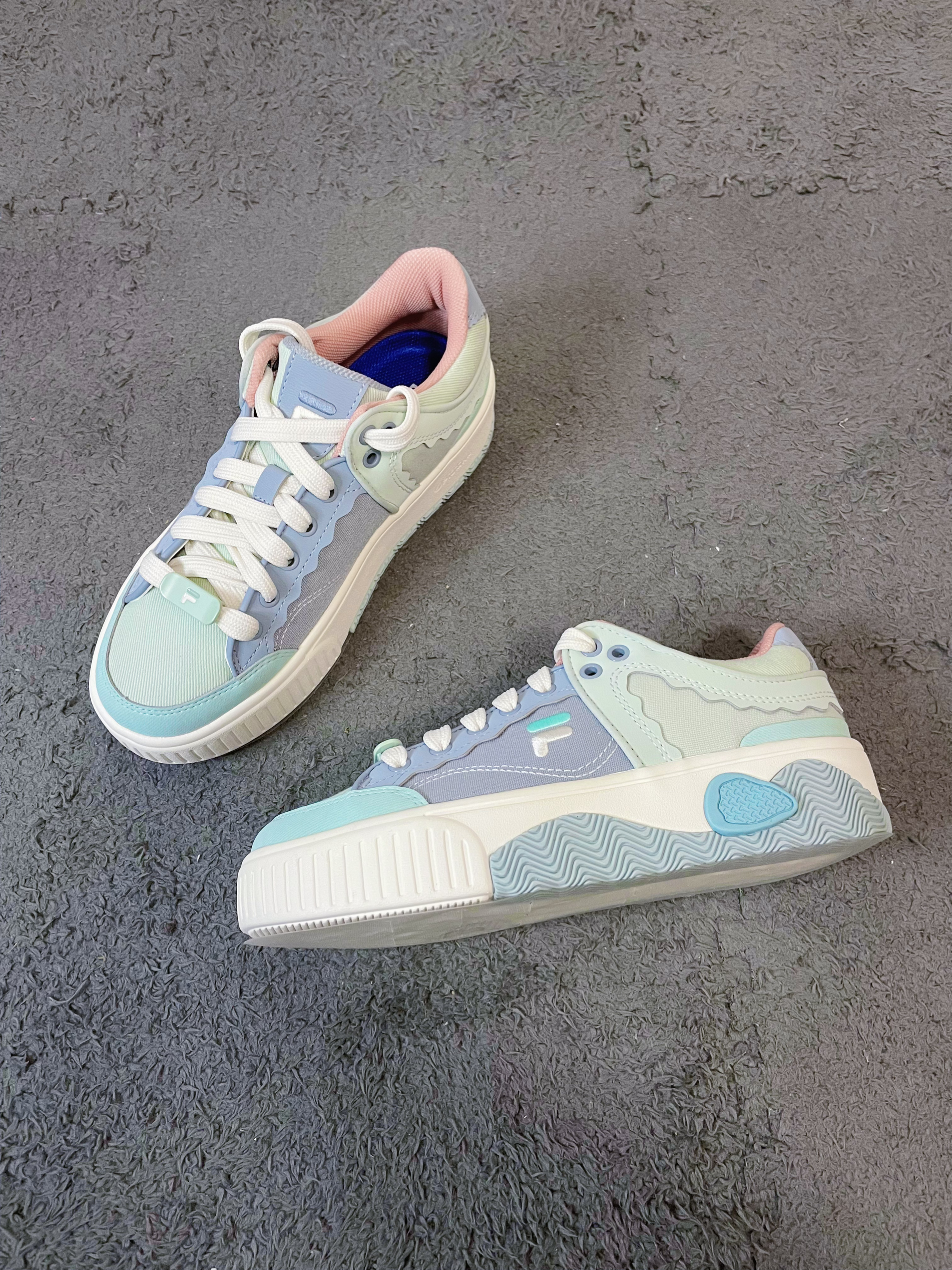 这双双斐乐的厚底帆布鞋真的太宝藏啦!!! 鞋身采用的是这种灰海洋拼接采石蓝的配色 配色非常的小清新👍 它以多层浪花为设计灵感 所以你能看到鞋身有很多这种波浪纹的设计 上脚是真的好穿又好搭,鞋子的版型也很好看 几乎什么风格的衣服都能搭配 日常出街还不容易撞款,而且脚感真的超软! 用手按下都能感觉到明显的回弹 尺码方面不偏码可以正常选择 除了小贵真的没啥缺点~