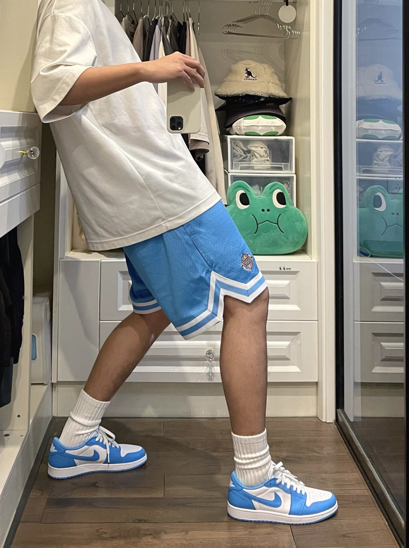 篮球短裤|北卡蓝穿搭|||🏀球裤,是夏季穿搭的必备单品 📐裤长调整,能穿出不同的风格 . 🎨各种配色,都轻松与球鞋匹配 🖌️北卡蓝,属于夏天的一抹清新 . —————— . 👕Uniqlo U / 455359 / 白色 // XXL . 🩳UZIS / 星芒 / 美式短裤 / 蓝色 // XXL . 👟Nike SB Air Jordan 1 low / 北卡蓝 // 42 . —————— ....