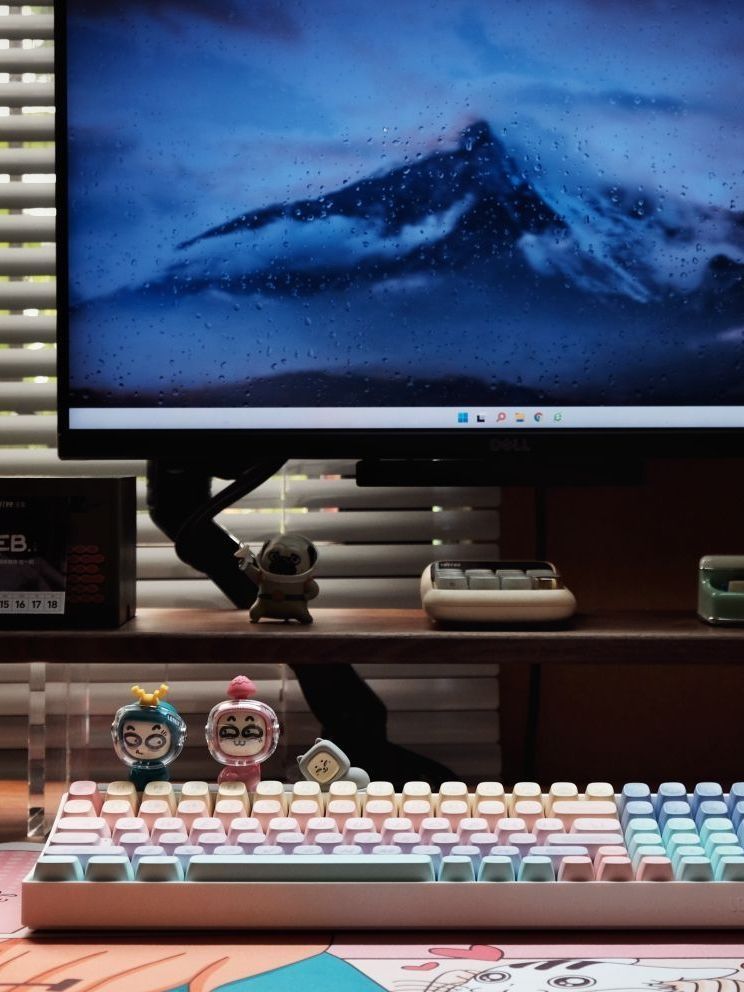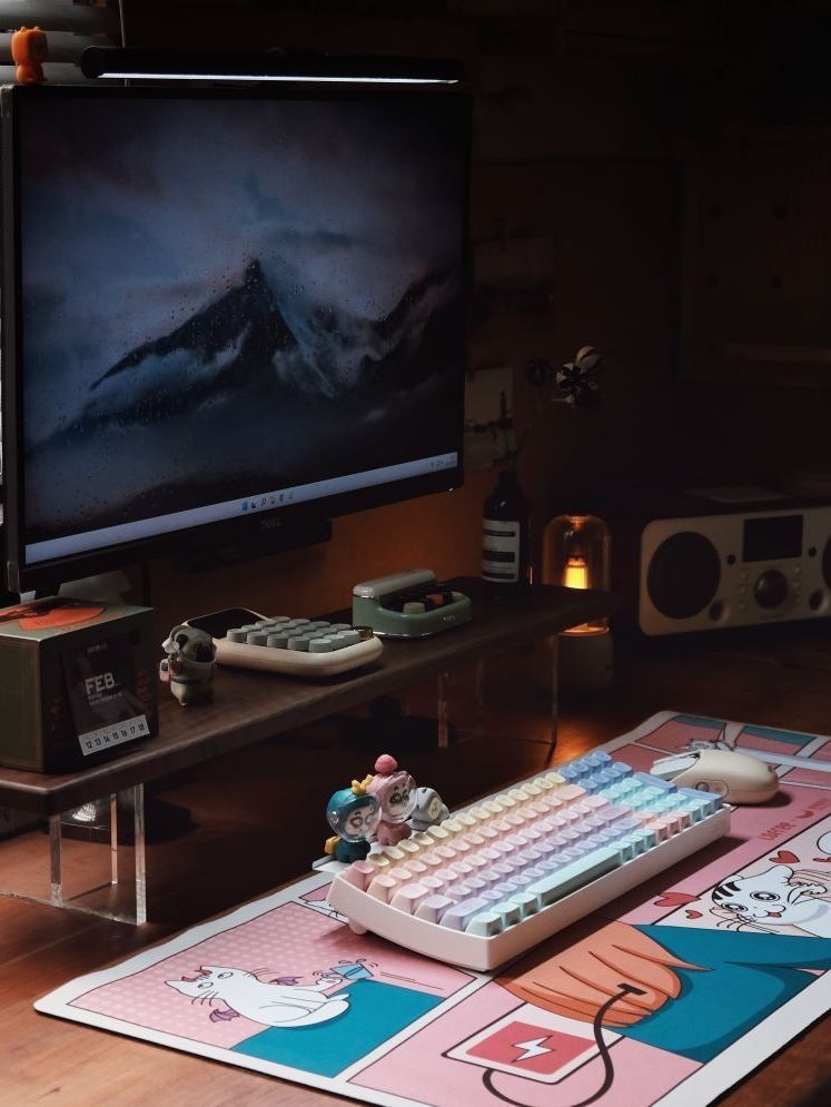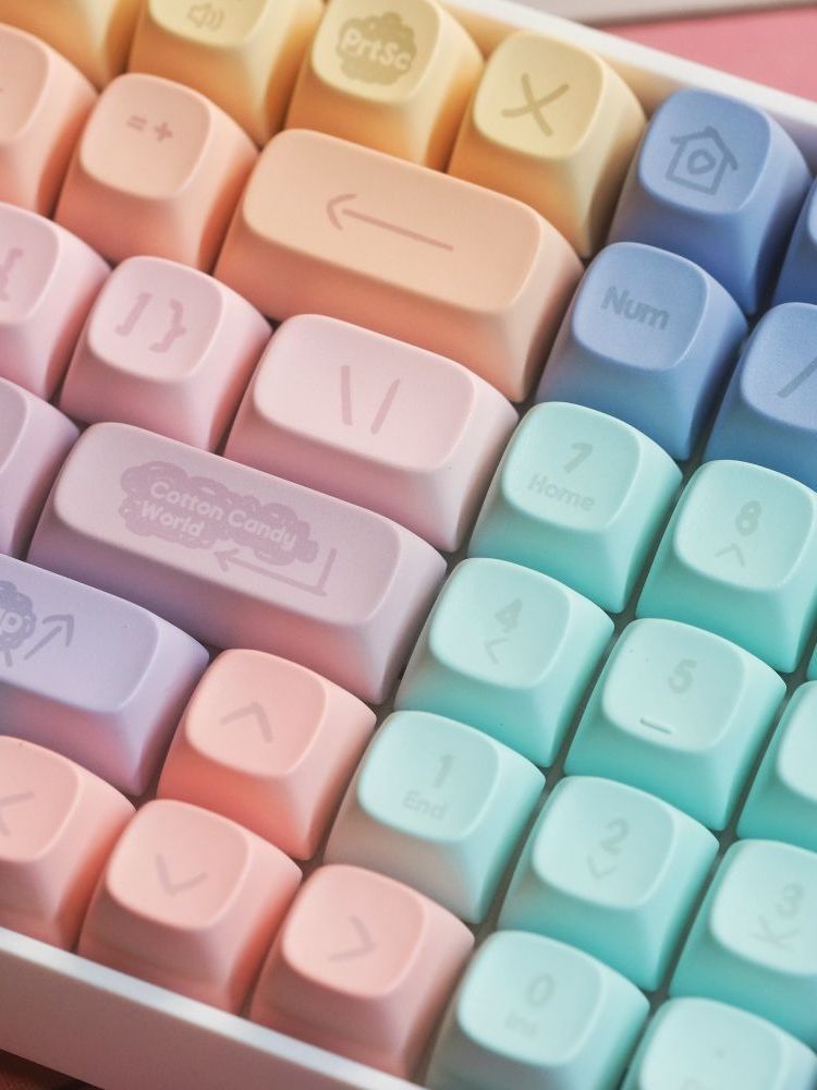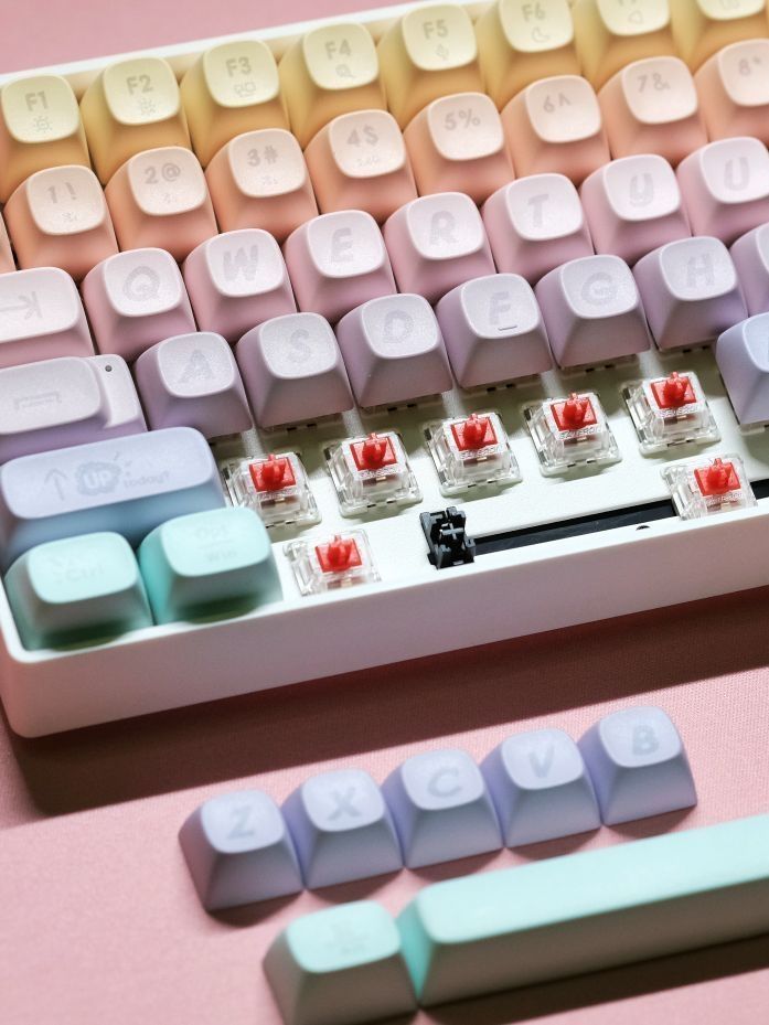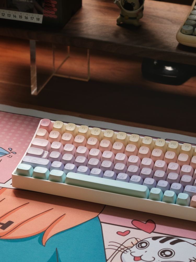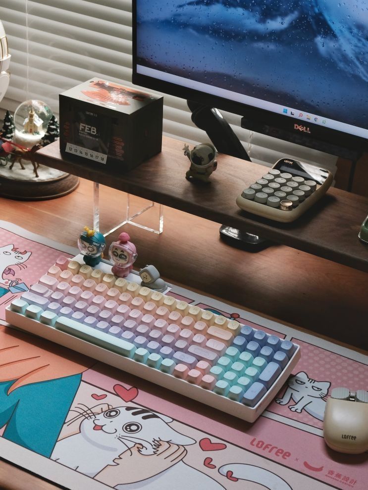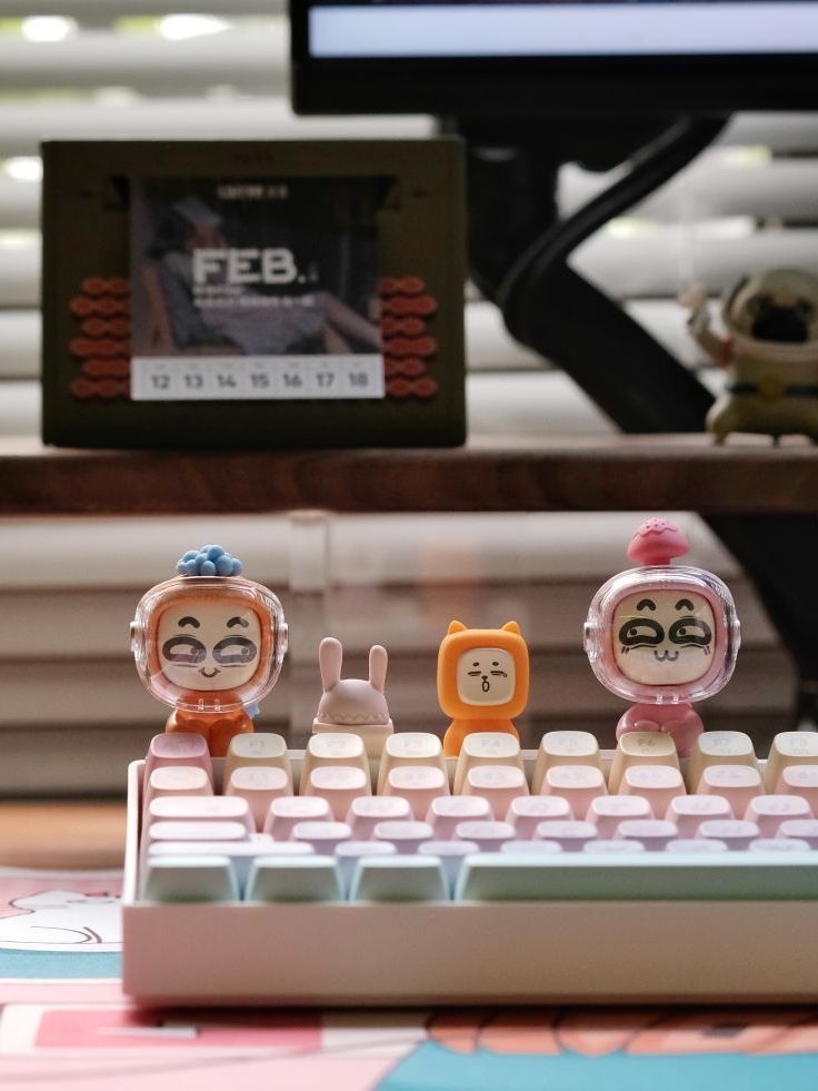 这把洛斐小翘棉花糖是送妹纸的,100键紧凑布局,关键是键帽的配色真的太温柔了,真的完全长在了妹纸的审美上,一上手就喜欢得不得了! 配件还送了一个金属托盘,作为洛斐的老粉,谁还没几个龙利公仔啊,随便拿出几只出来,怎么搭配都好看,摆在桌面上就算不使用都是一道赏心悦目的风景线呢。 另外这款棉花糖是可换轴的键盘,自带了佳达隆的G红Pro轴,这个轴体按压起来很柔和,静音效果也不错,很适合妹纸使用。右侧的三模...