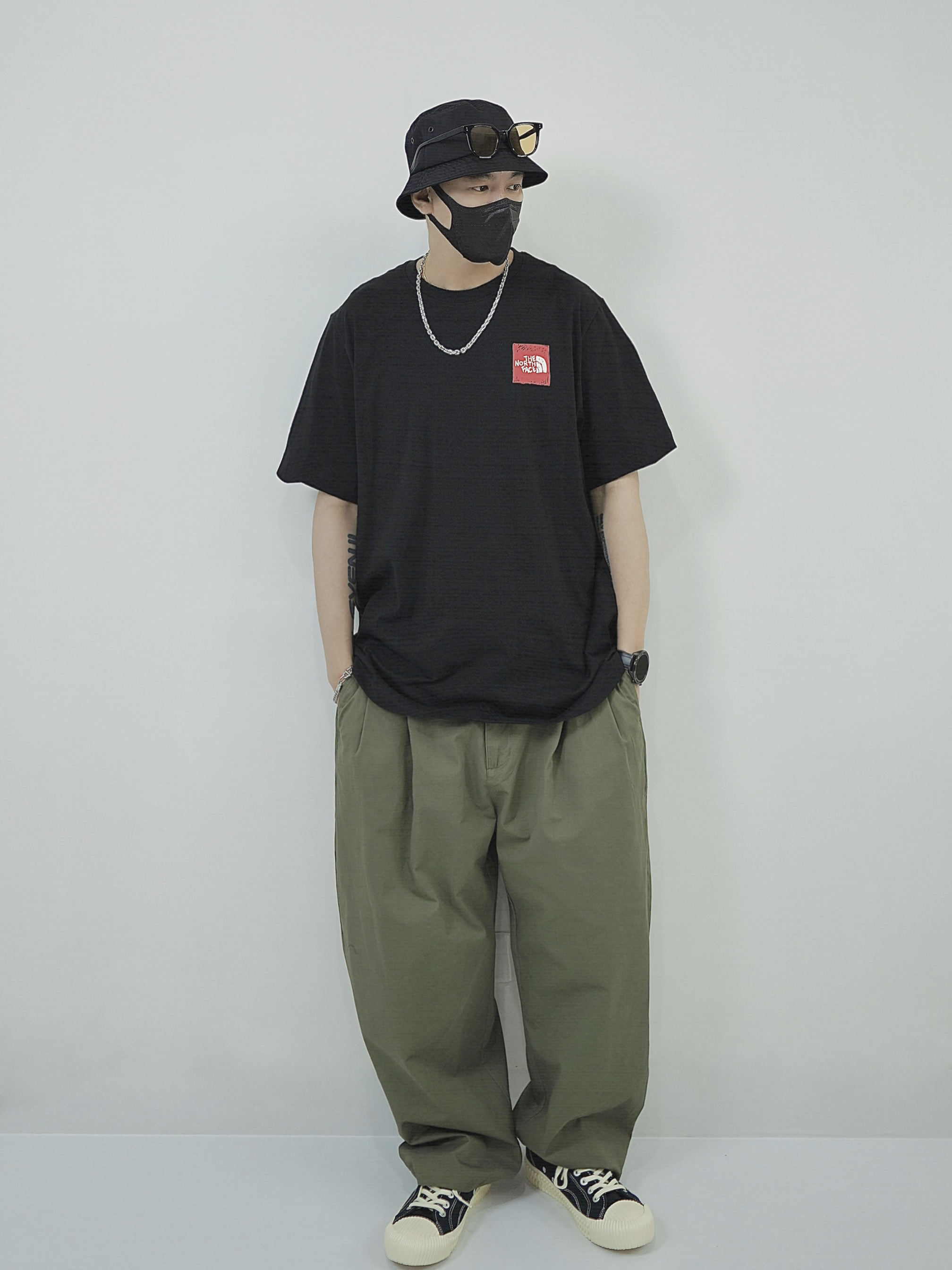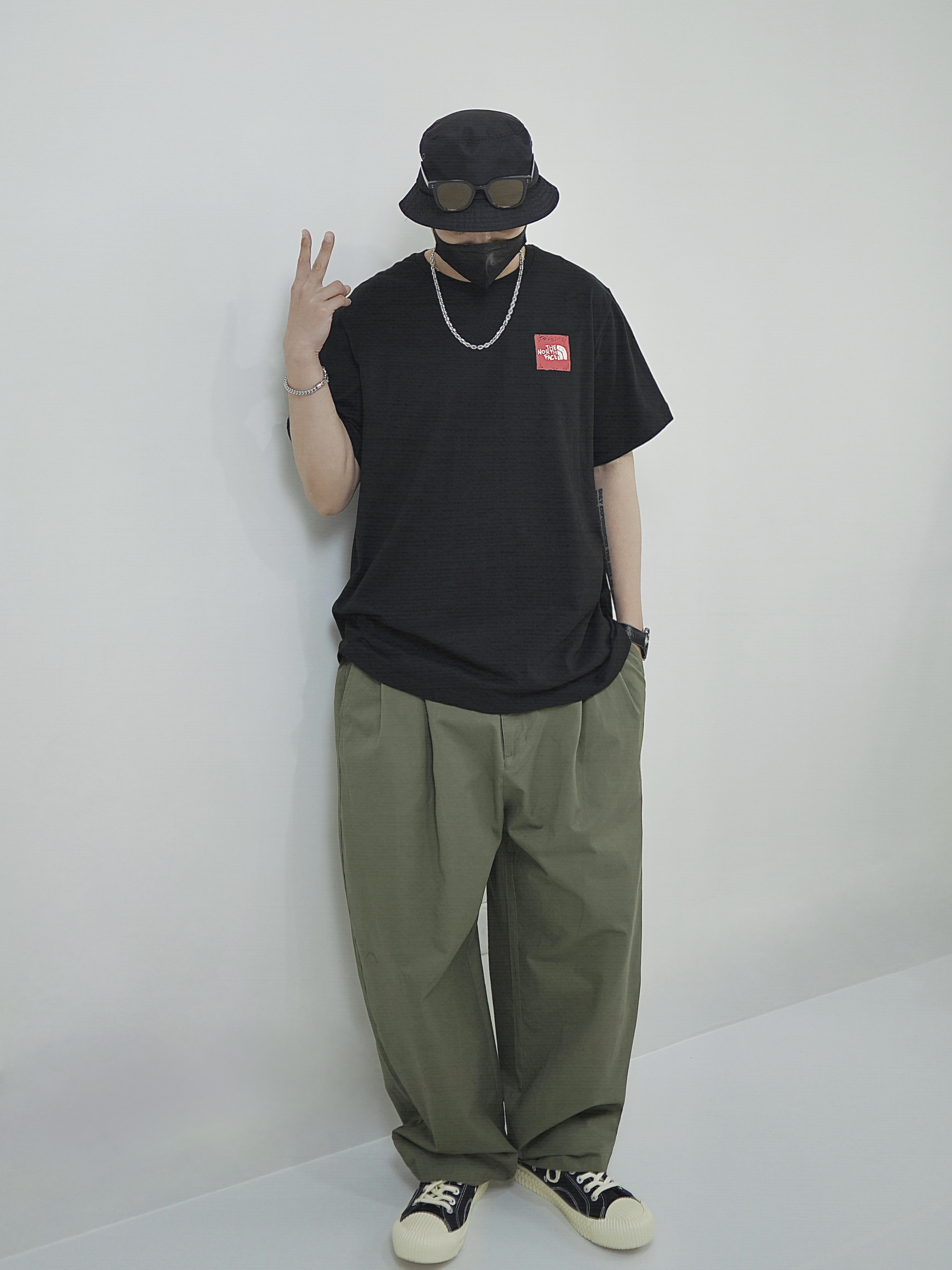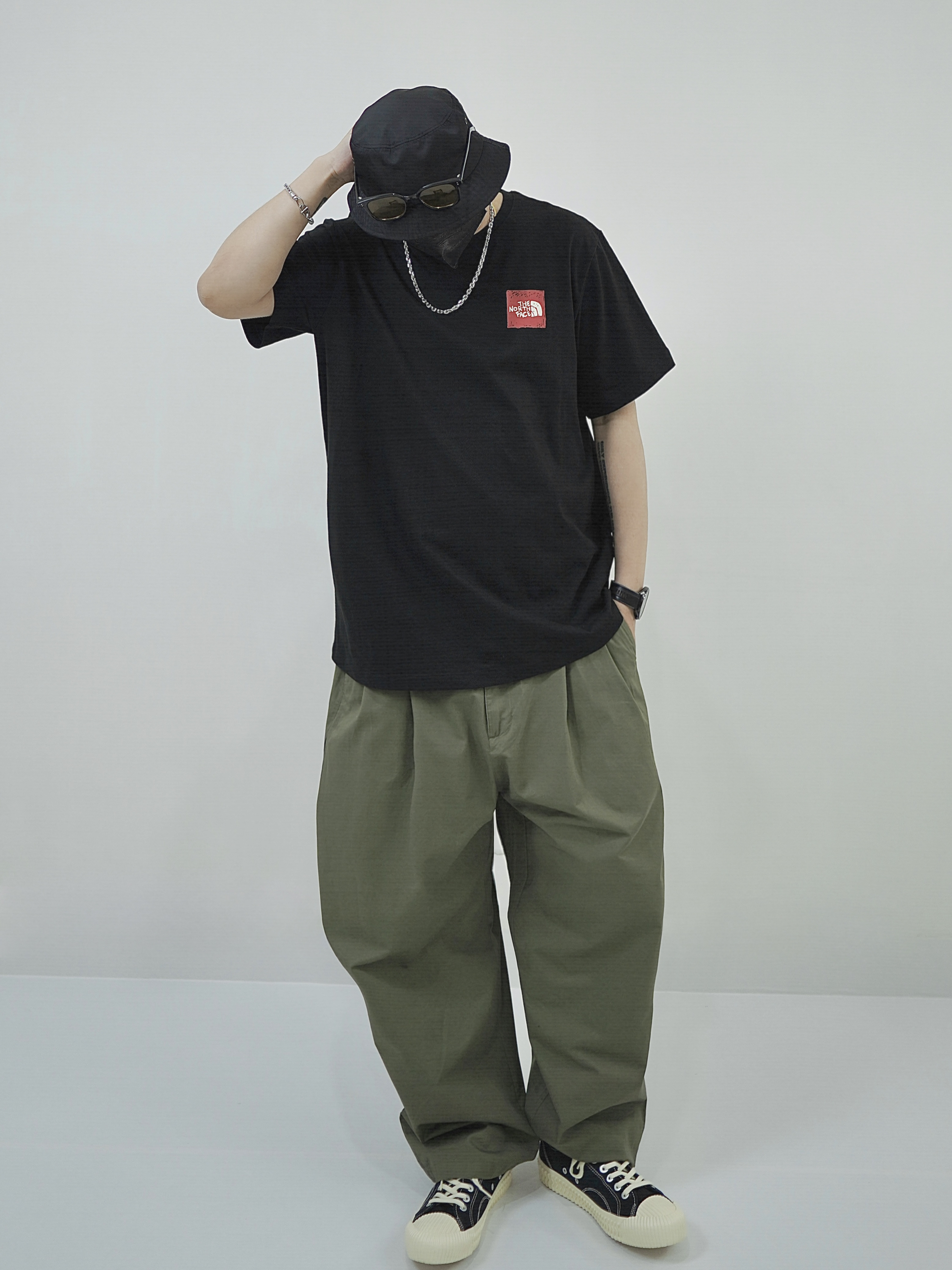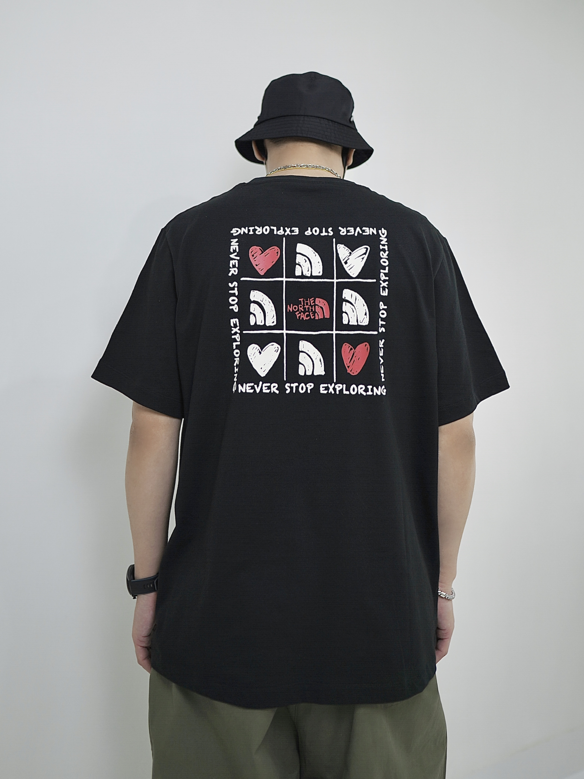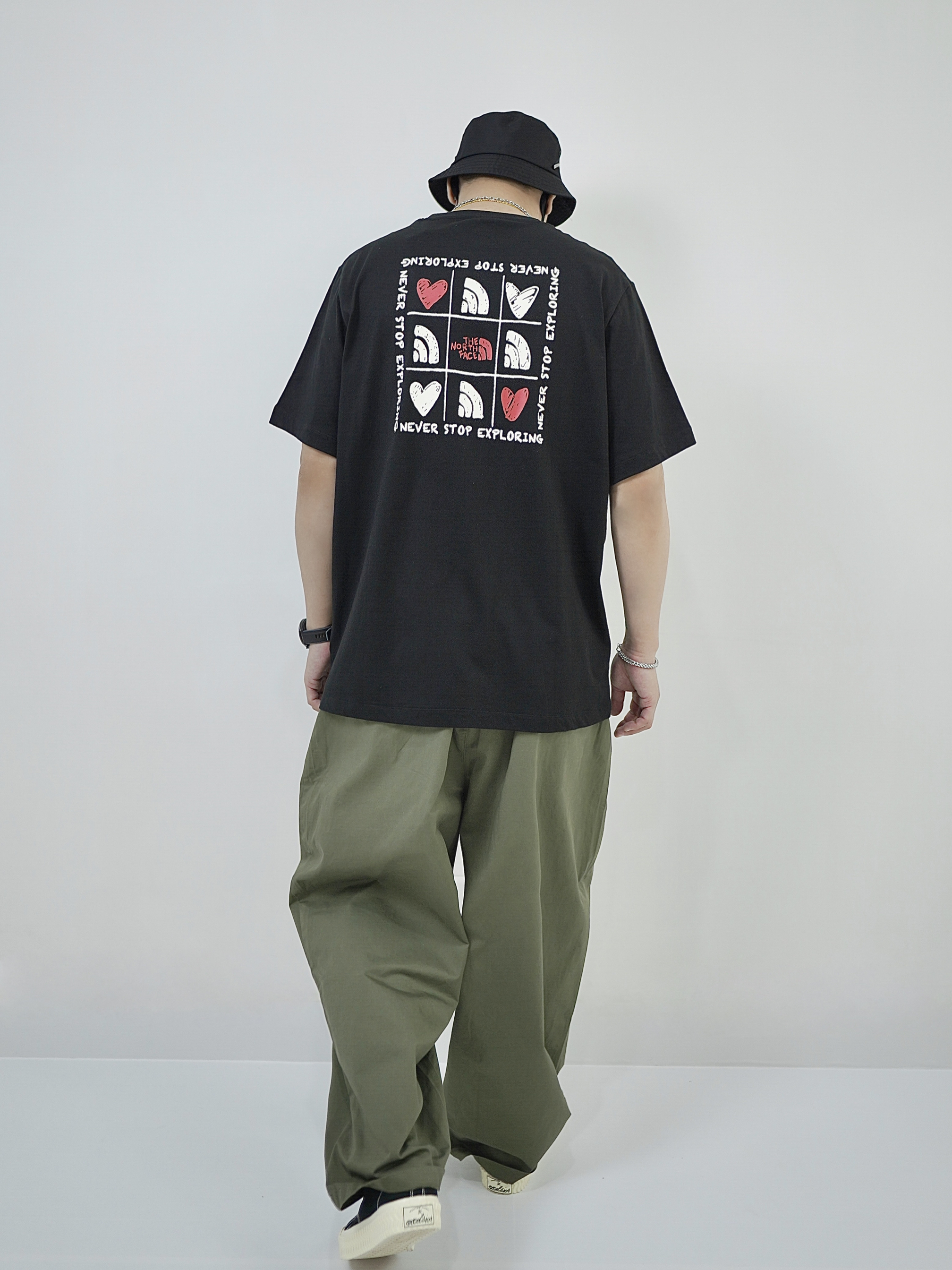 又到了一年一度乱穿的季节了 没想好春装穿什么 就可以穿夏装了 最近超爱穿这款黑色北面短袖 正面一个北面小的logo 简单大方 背面心形图案设计 是今年情人节限定款T恤 超级适合夏日情侣穿搭 轻松塑造满满的街头风 面料柔软上身非常舒服 宽松版型尽显慵懒休闲感 对所有身材的都特别友好 黑色T恤搭配军绿色阔腿工装裤简直是绝配 在搭配韩系饼干帆布鞋 渔夫帽 太阳镜 古巴链 你就是坐在倒数第一排的坏坏帅...