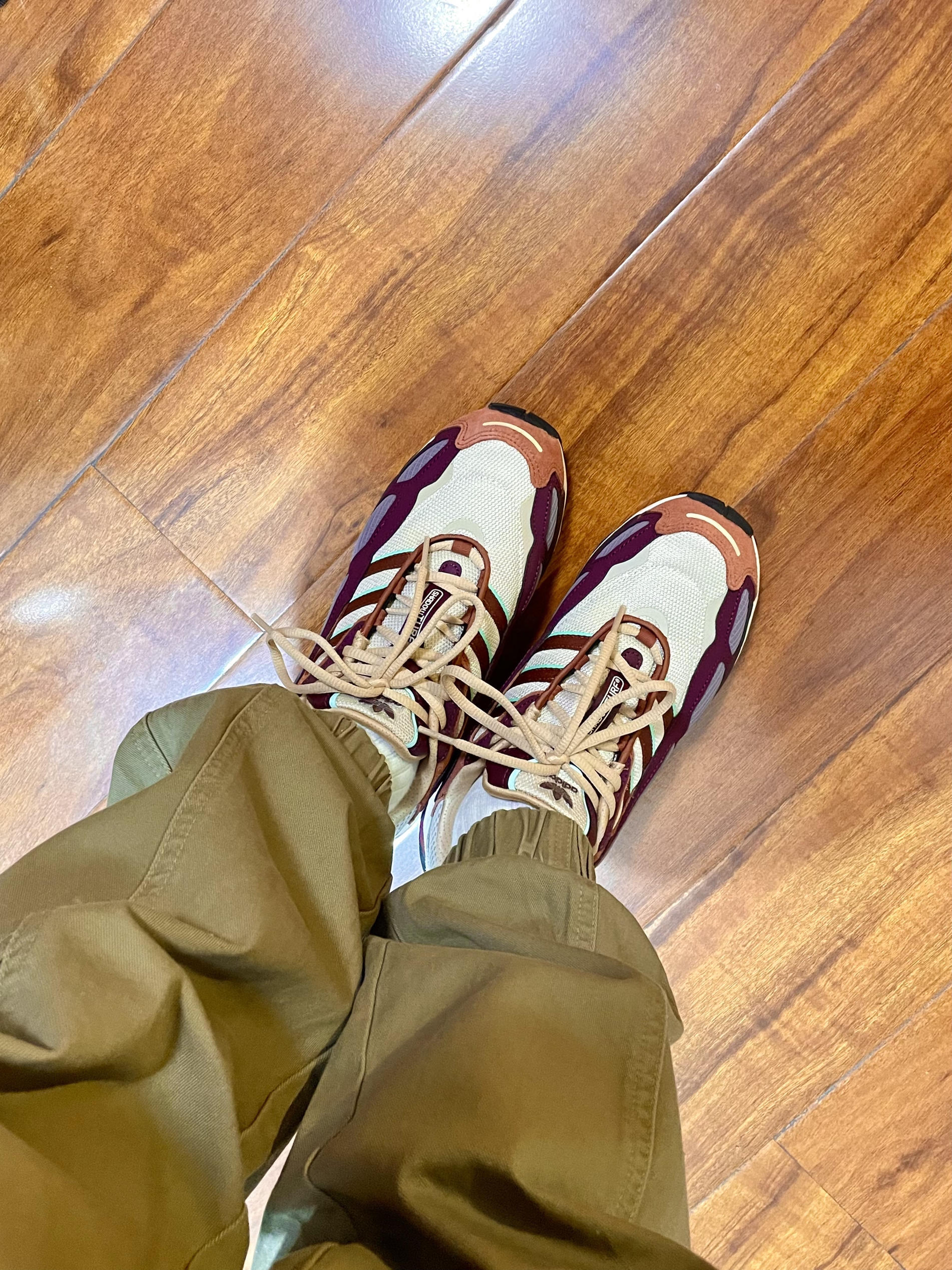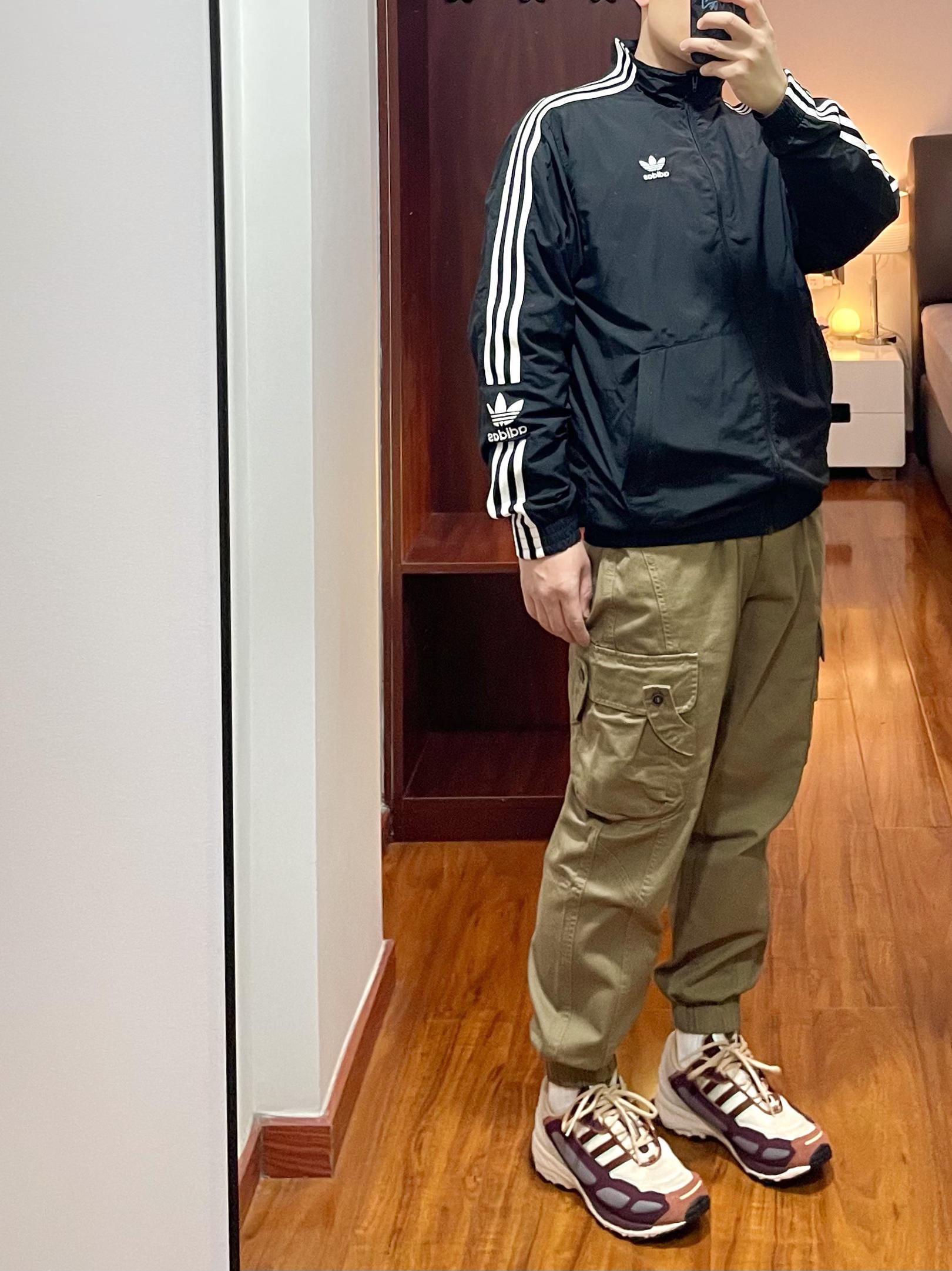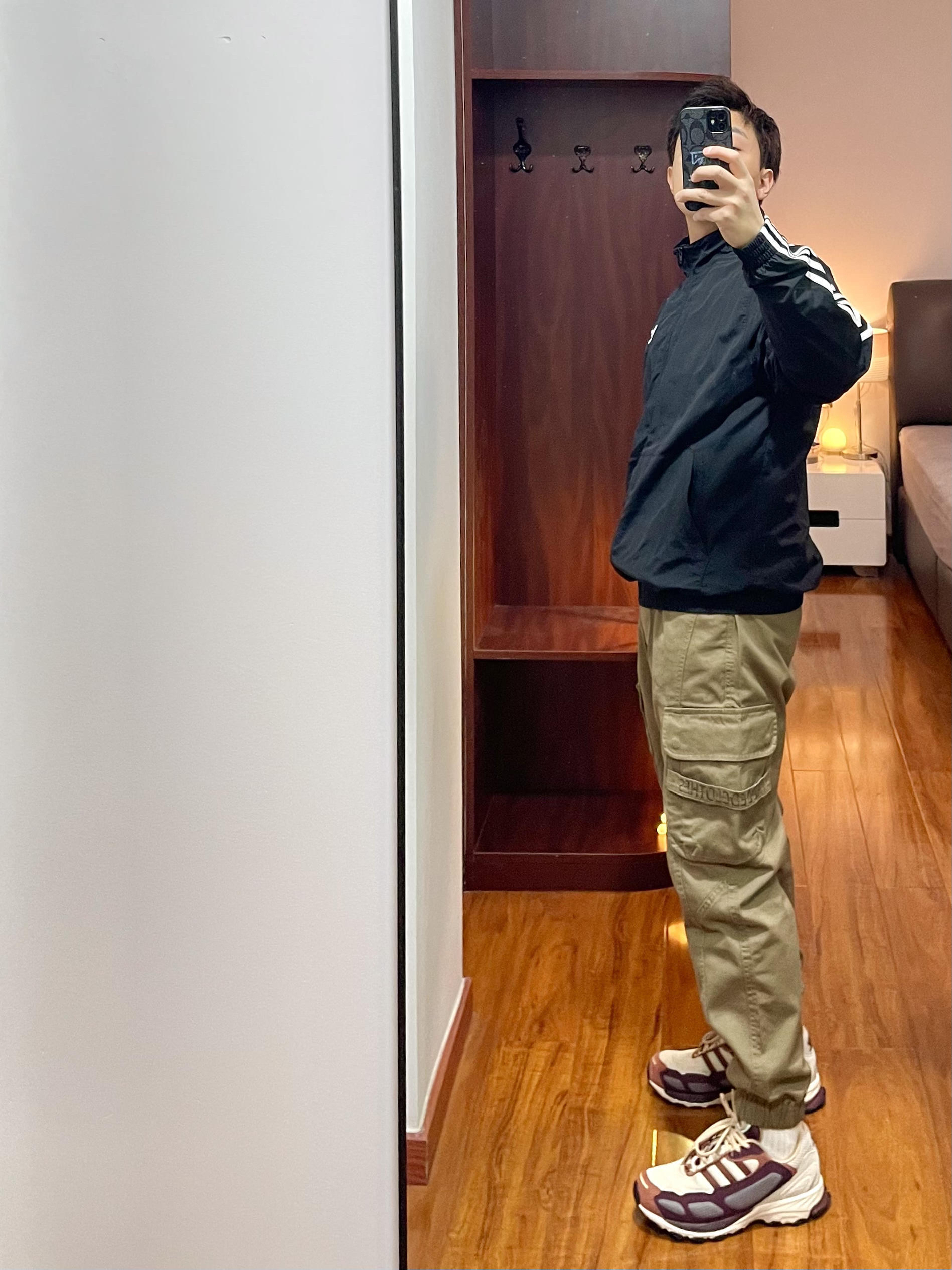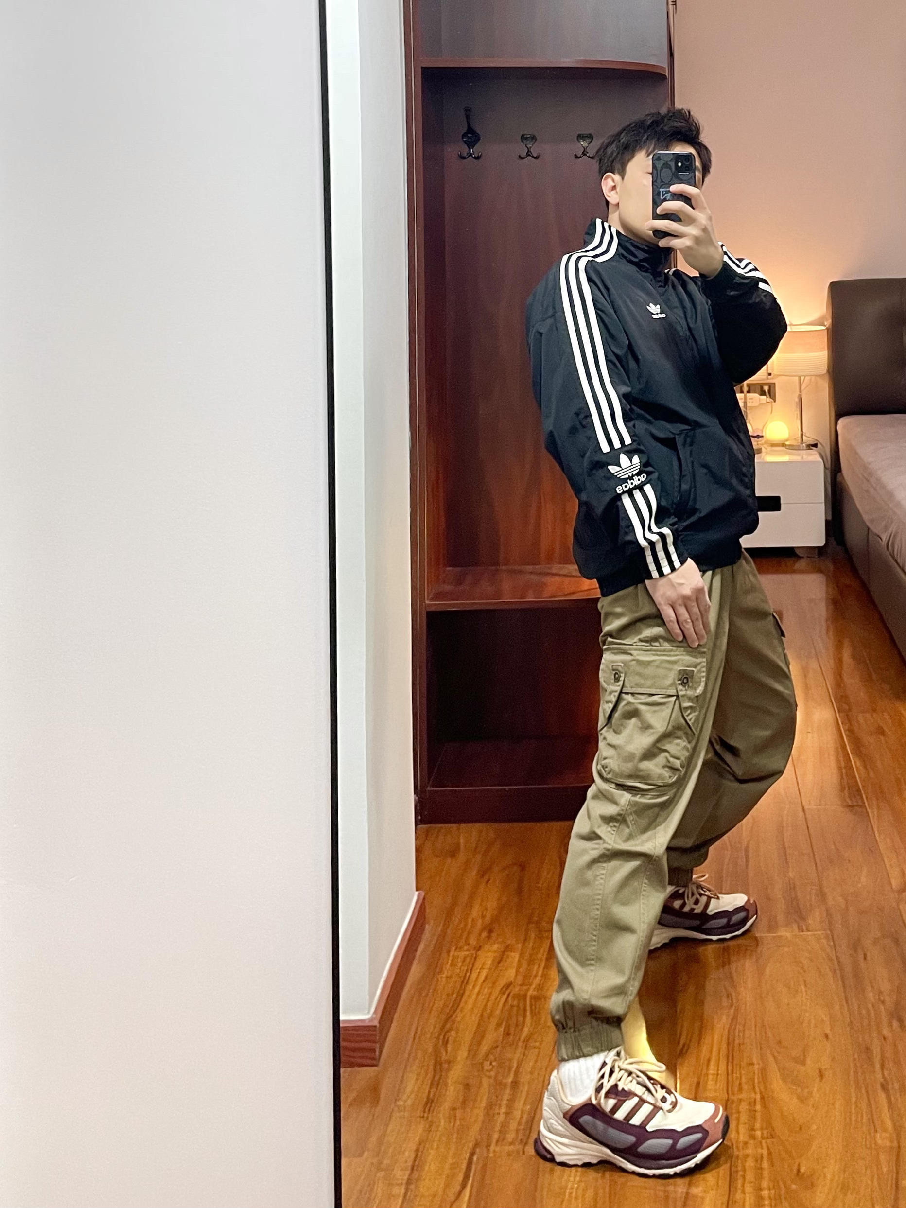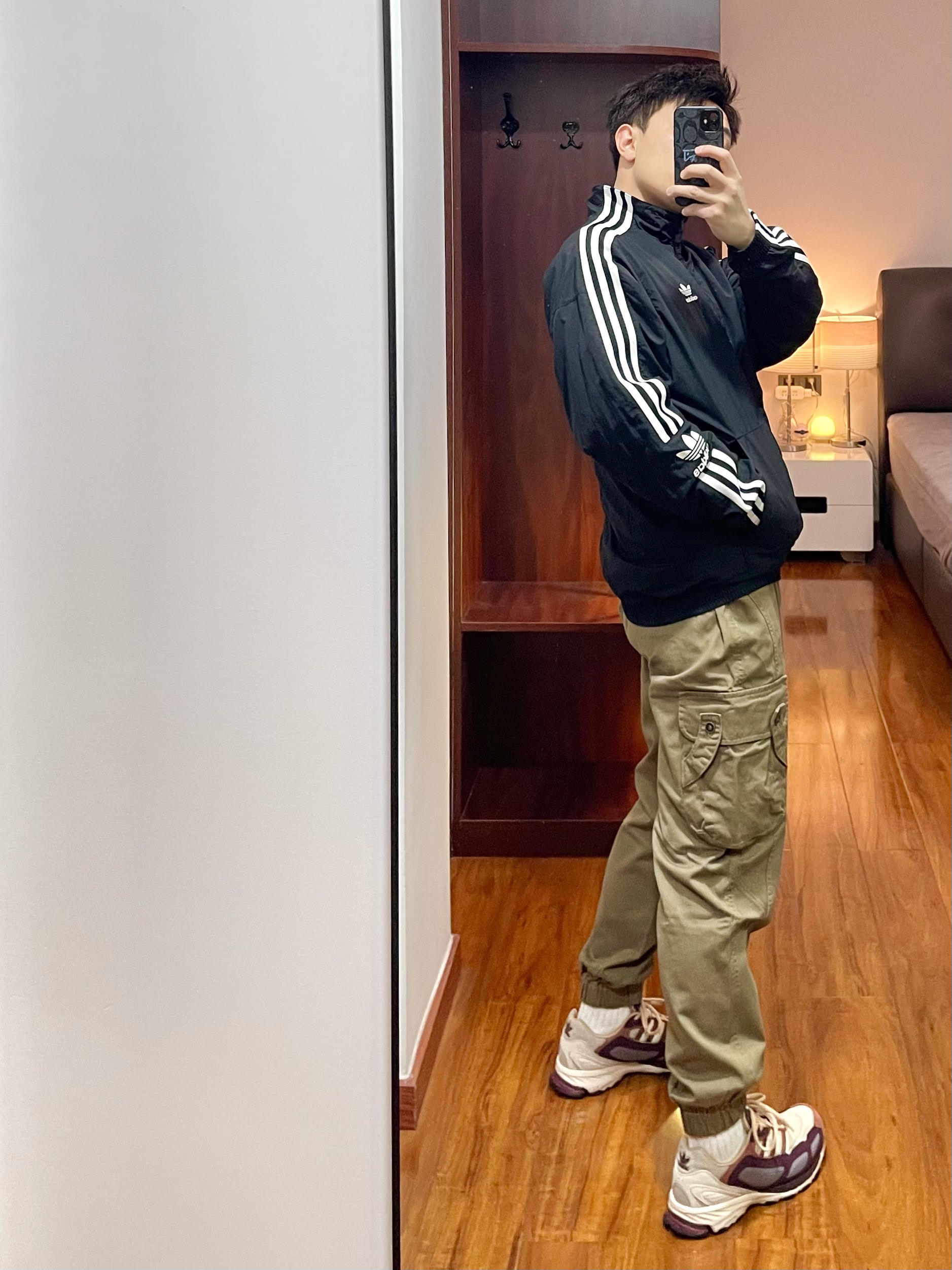 170/135斤 一个普通人的穿搭分享 👔:Adidas 立领外套 黑色的运动立领夹克外套,外层面料是粗的风衣布,内里有层网可以帮助透气防止外层面料贴住皮肤。 👖:KGK 束脚裤 卡其的颜色休闲,双腿边上有口袋好看又实用,面料也厚实上身效果挺括。 👟:Adidas Shadowturf 鞋身发部分以酒红色为主,鞋面与鞋带深卡其色,鞋型鞋头部分上翘,散步跑步基础运动穿着合适。