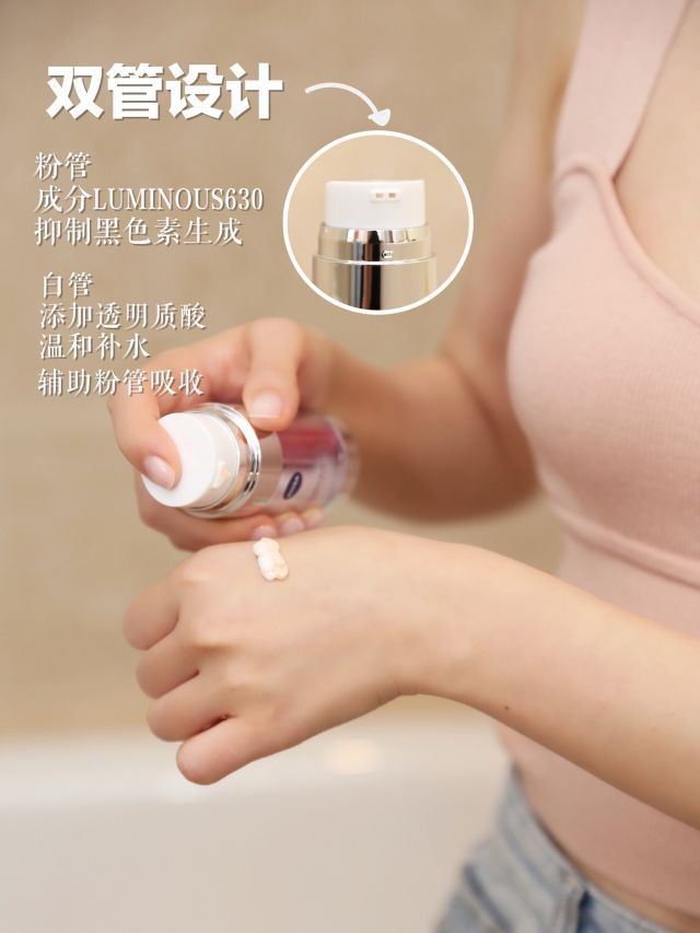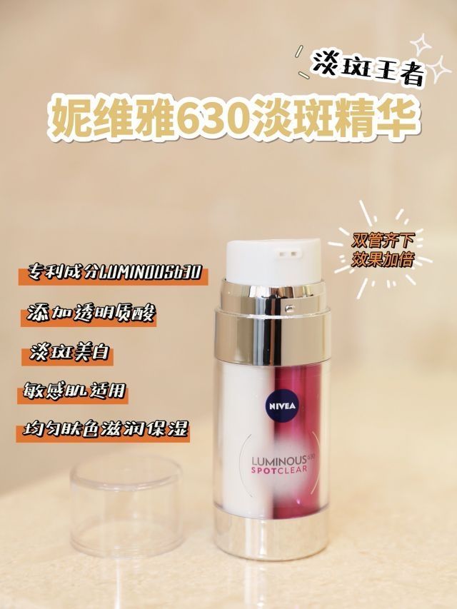 随着自己脸上的晒斑越来越明显,真的是悔不当初啊!最近都在疯狂购入美白产品,然而都没有很显著的效果。直到表姐给我推荐了一瓶✨妮维雅630淡斑精华✨,用了十多天发现淡斑效果着实让我惊艳,忍不住前来和集美分享一下! . 独特的双管设计,一边是粉管一边是白管,粉管的主打成分是LUMINOUS630,据说是花了10年研究出来的硬核成分😃白管添加了透明质酸,双管齐下相辅相成。 . 我一般早晚使用,使用后是不需...