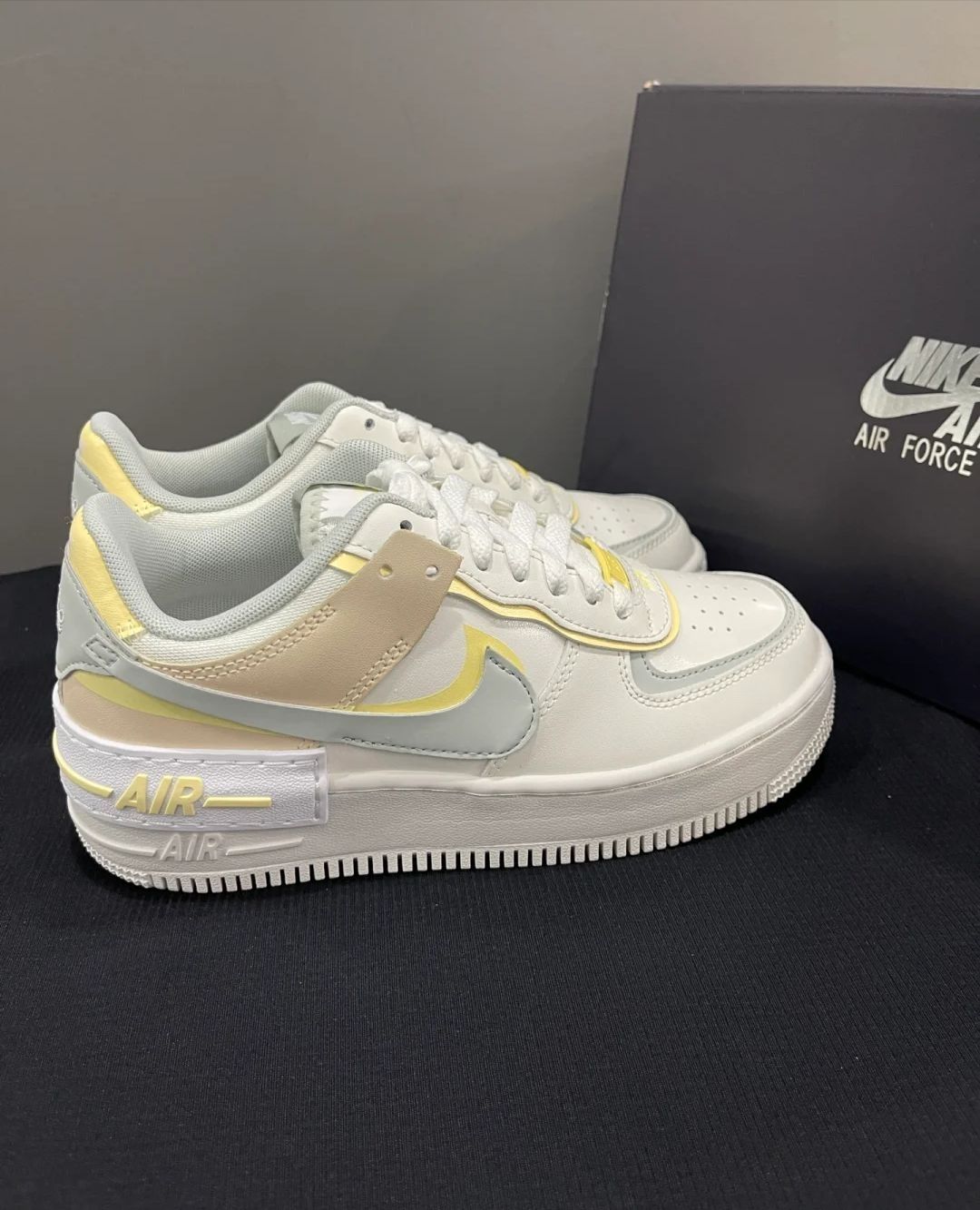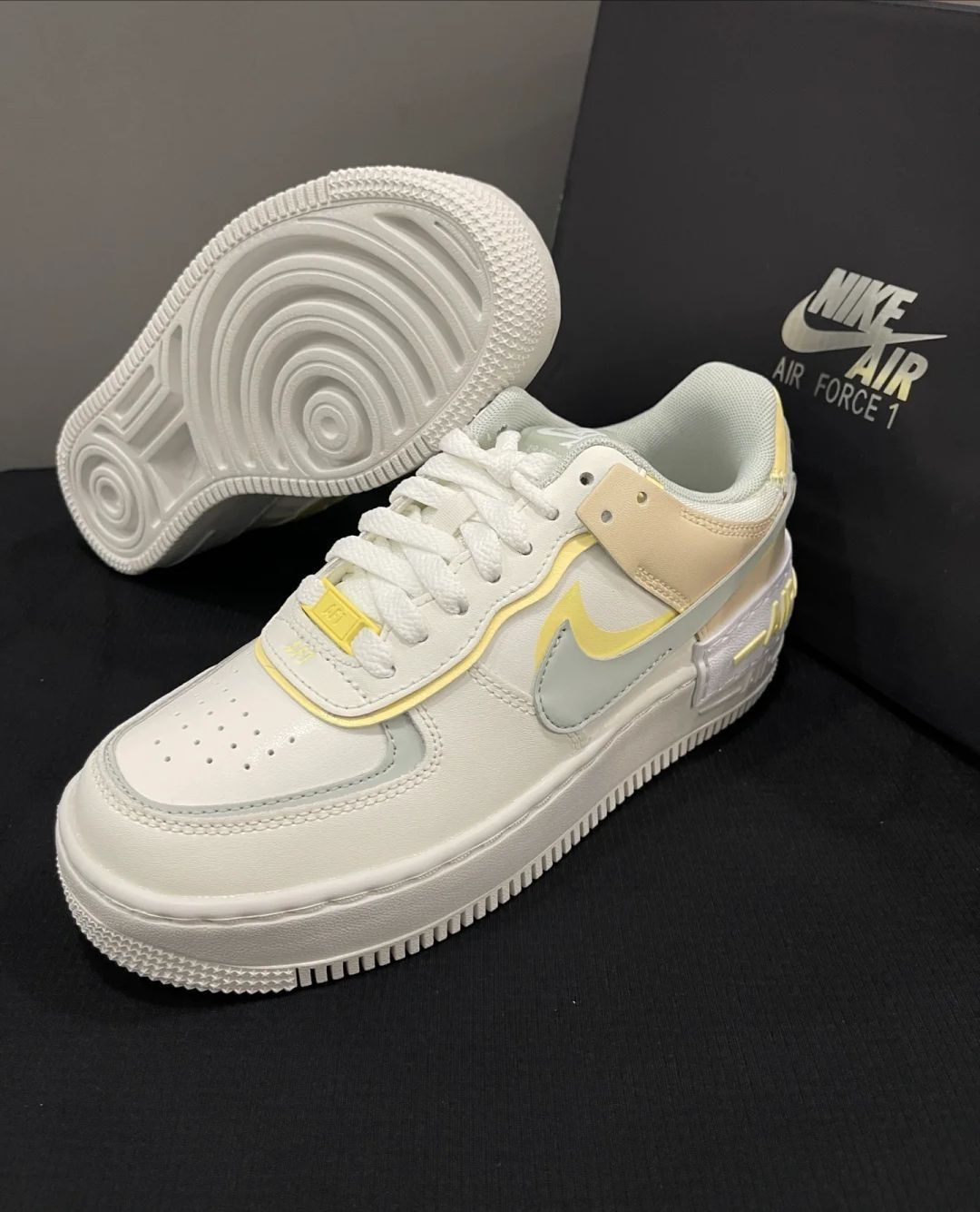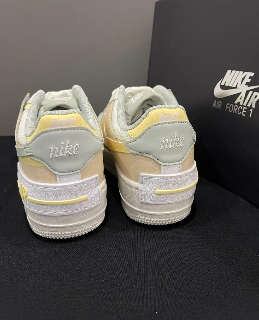 NikeAirForce1LowShadow耐磨低帮板鞋,米白色,整双鞋以淡绿色、浅黄色、浅褐色呈现,整体都是低饱和度的颜色进行组合,比较耐看又百搭
