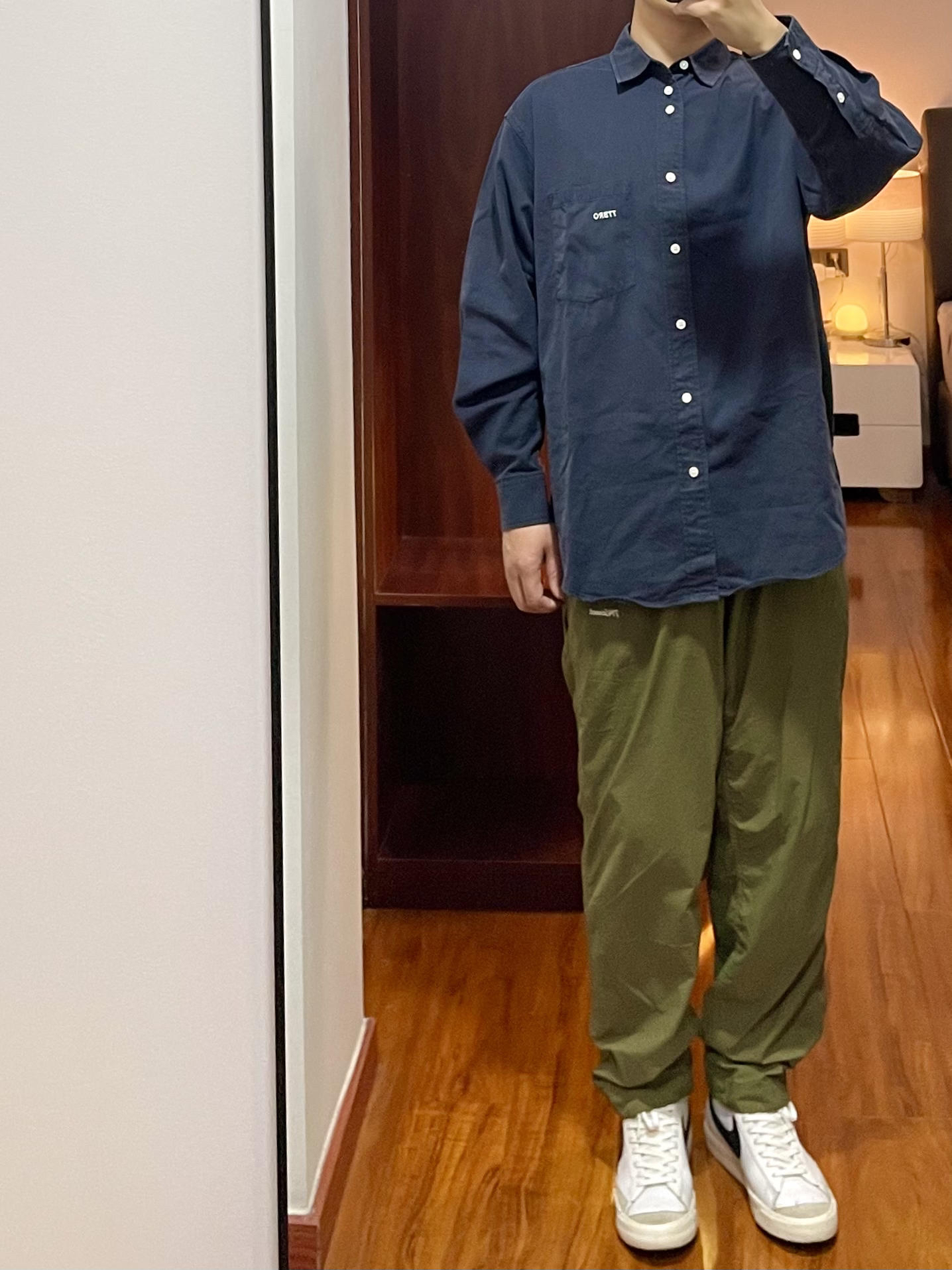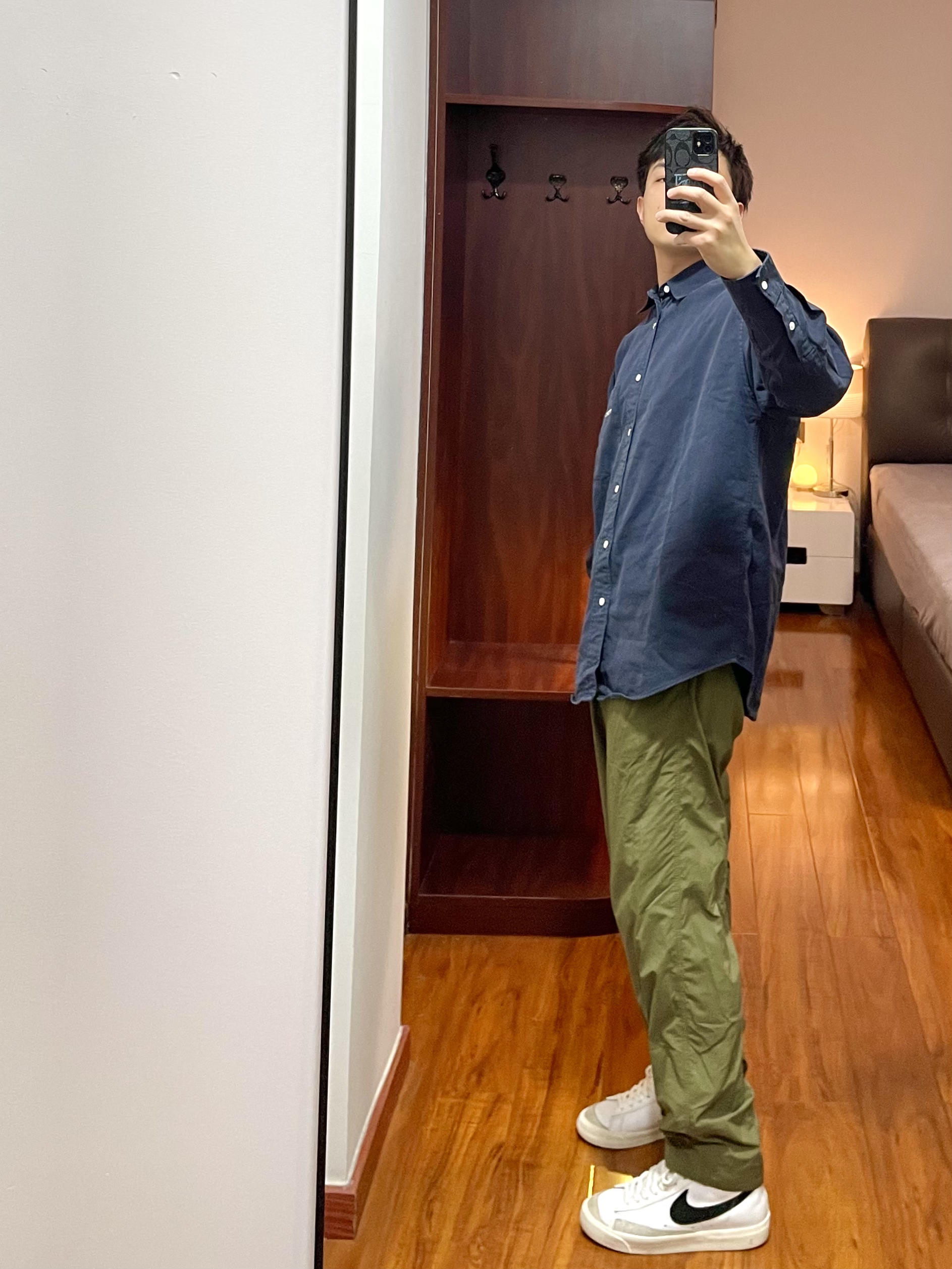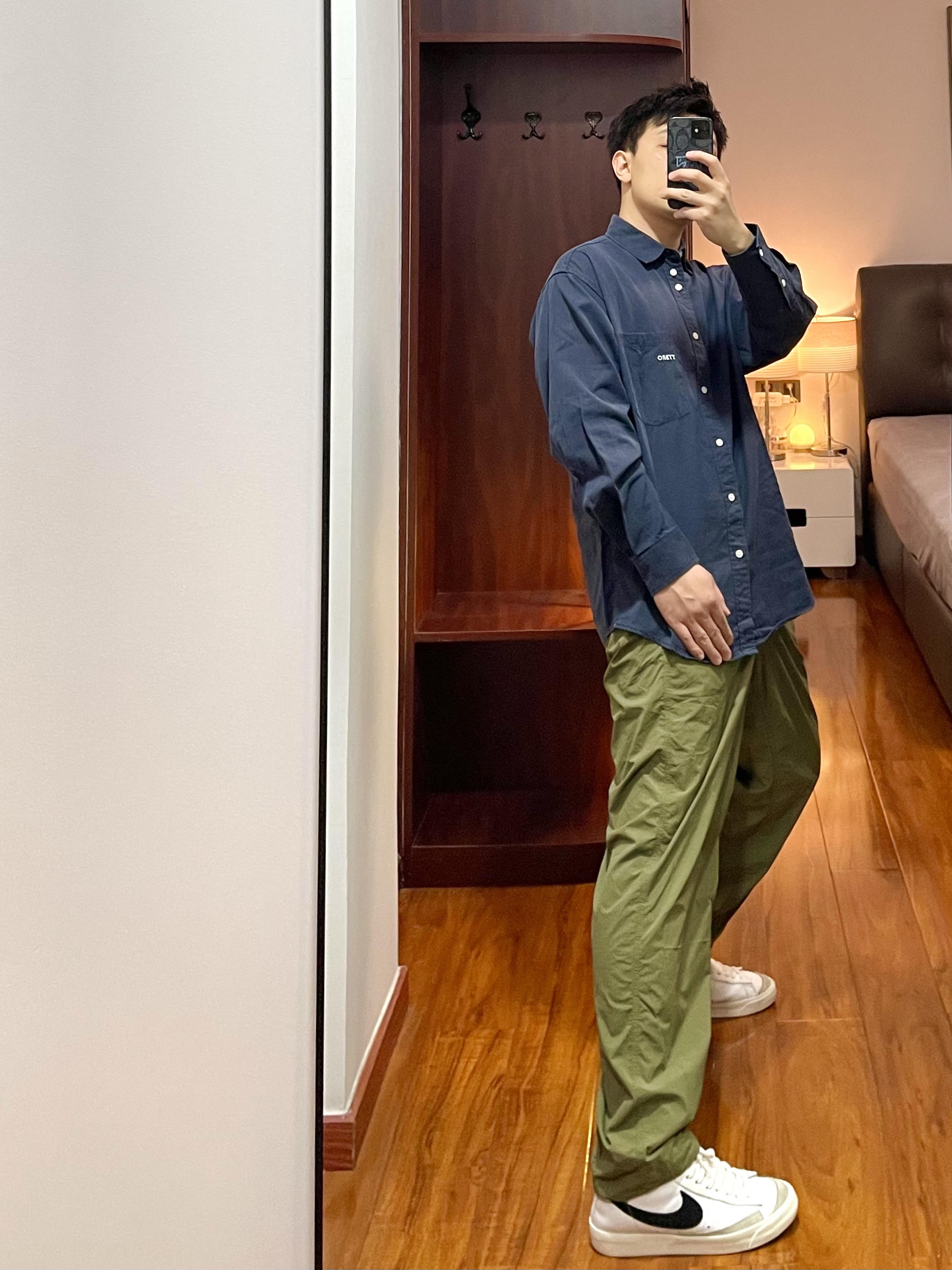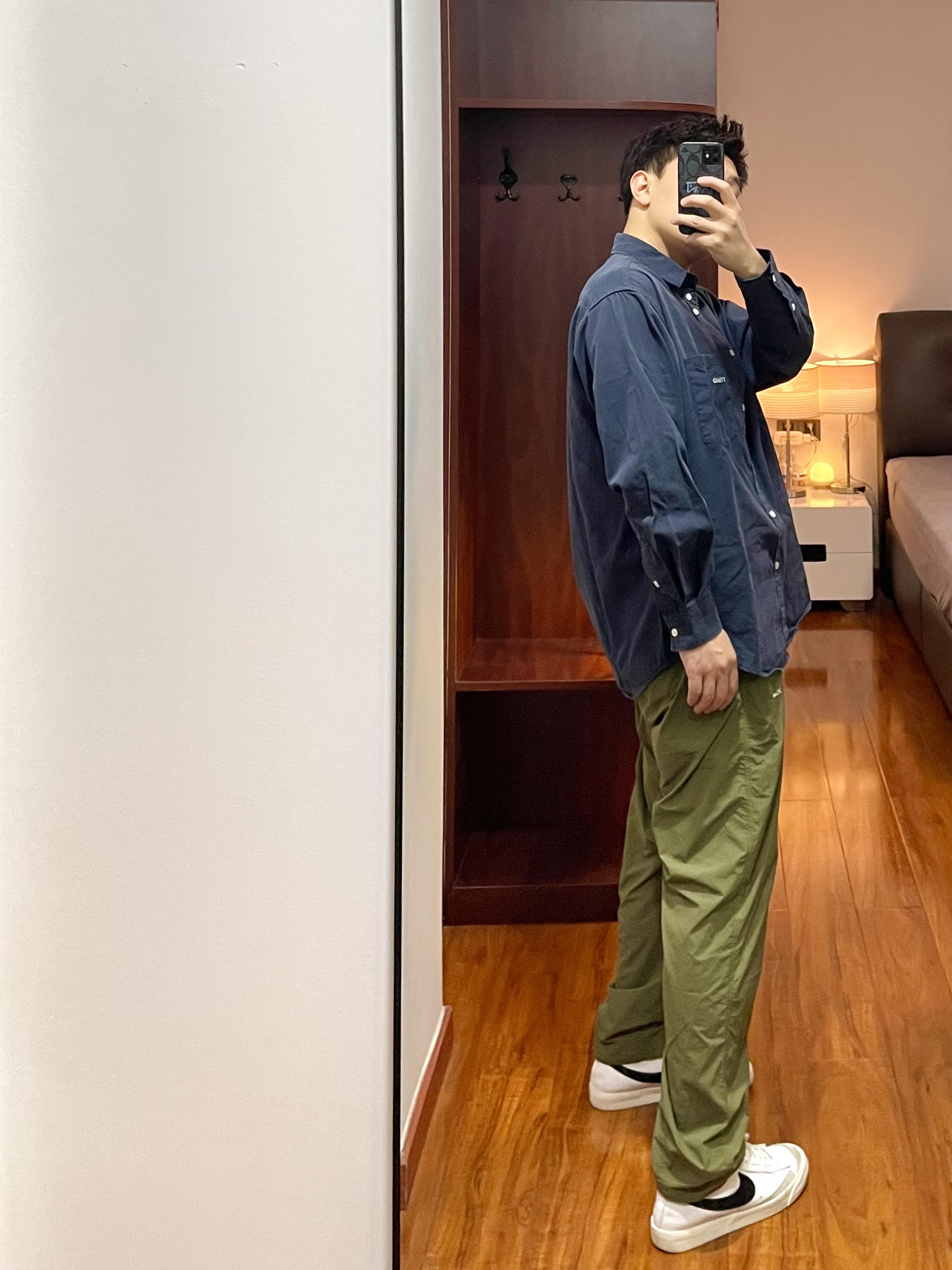170/135斤 一个普通人的穿搭分享 👔:纯色衬衫 藏青色休闲款衬衫带口袋的,面料比较厚实春季外穿合适,整体面料哑光有质感,版型宽松廓形。 👖:714 尼龙休闲裤 军绿色高密防水尼龙面料,直筒微锥的版型,整体比较轻薄夏天穿的话非常凉爽透气,裤子还可以叠起来翻转变成收纳包。 👟:Nike blazer 高帮款,日常休闲穿搭很合适,整体鞋面是皮质,大面积白色swoosh为黑色,经典的配色,脚感...
