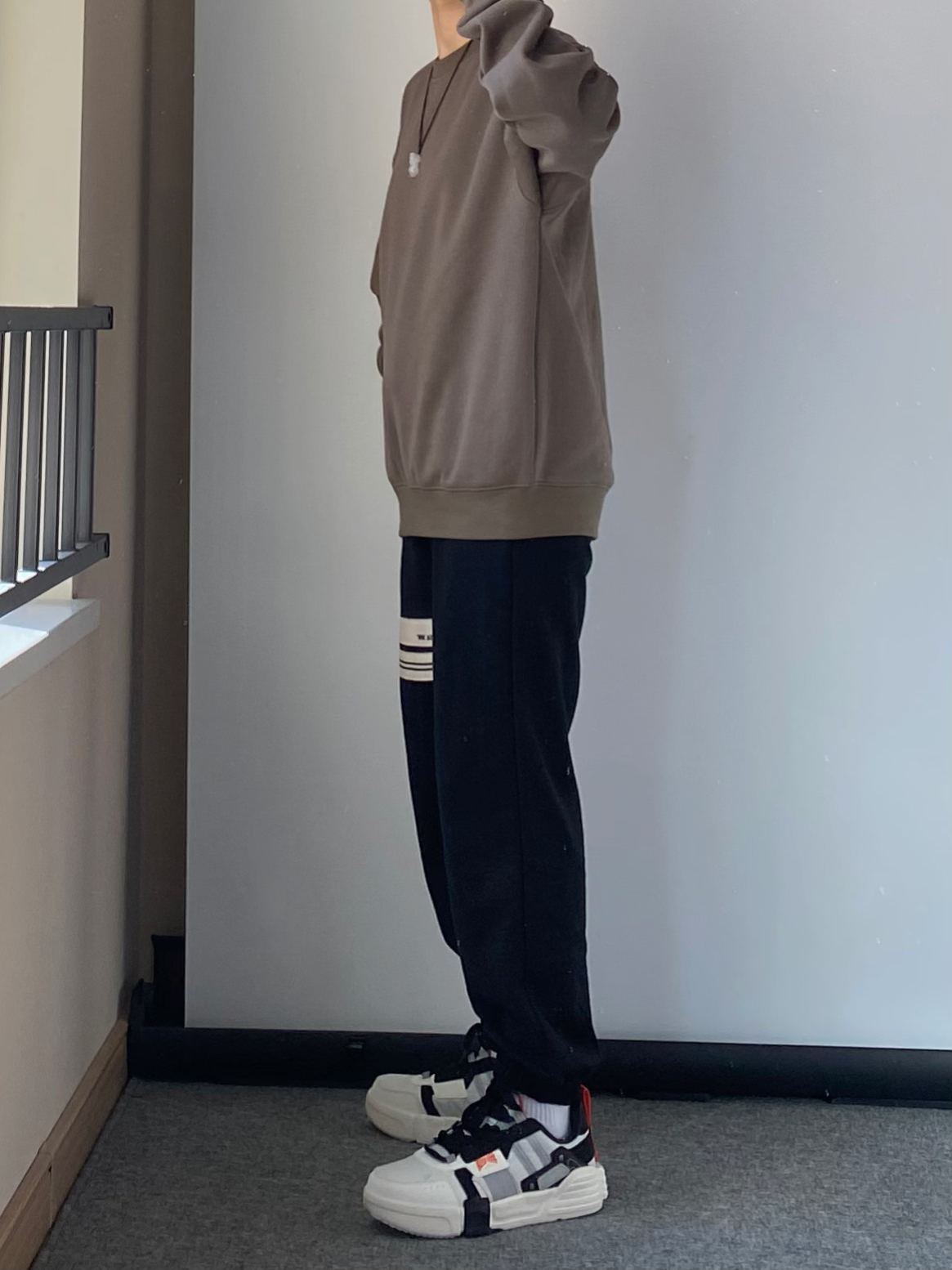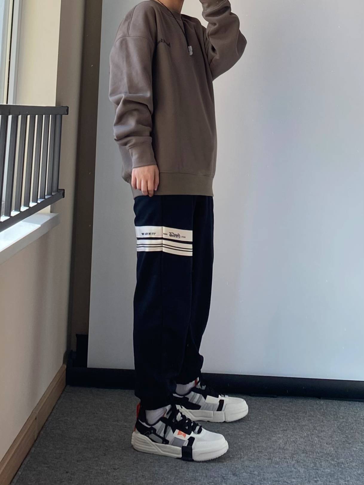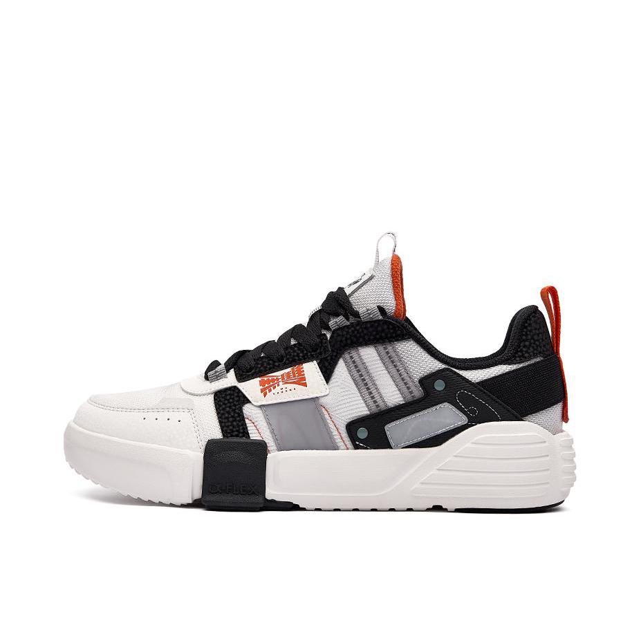 日常出门穿的简单干净就 很特别的一个颜色“暴雨灰”色圆领卫衣 内里很厚实的一层绒 春天单穿刚刚好 搭配一条百搭的黑色束脚卫裤 鸿星尔克无双板鞋 性价比真的蛮高的 整体鞋型的拼接层次感十足 橙色的汉字“无双大师”给鞋子增添了亮色点缀 日常学生党搭配工装裤束脚裤都很帅