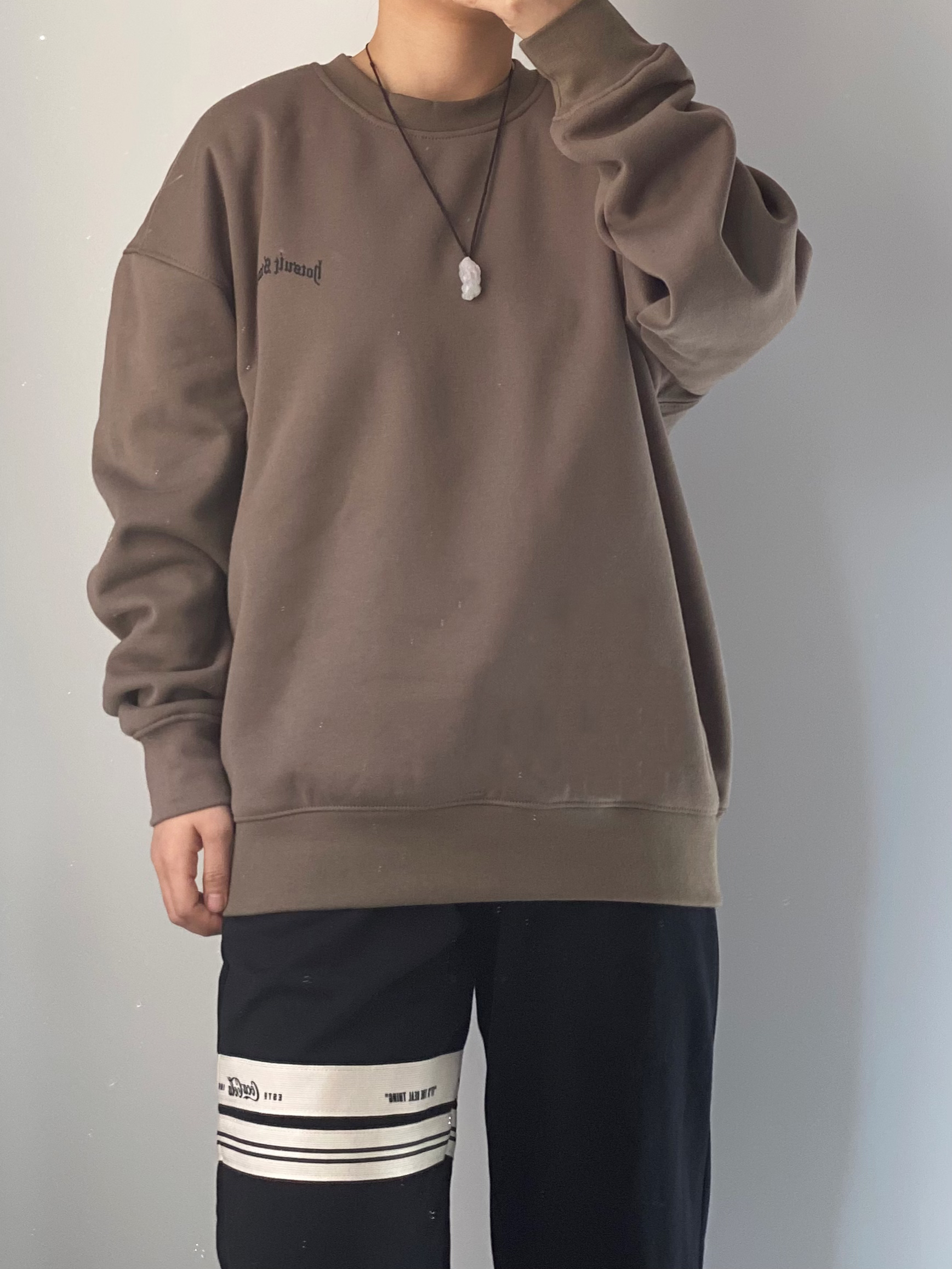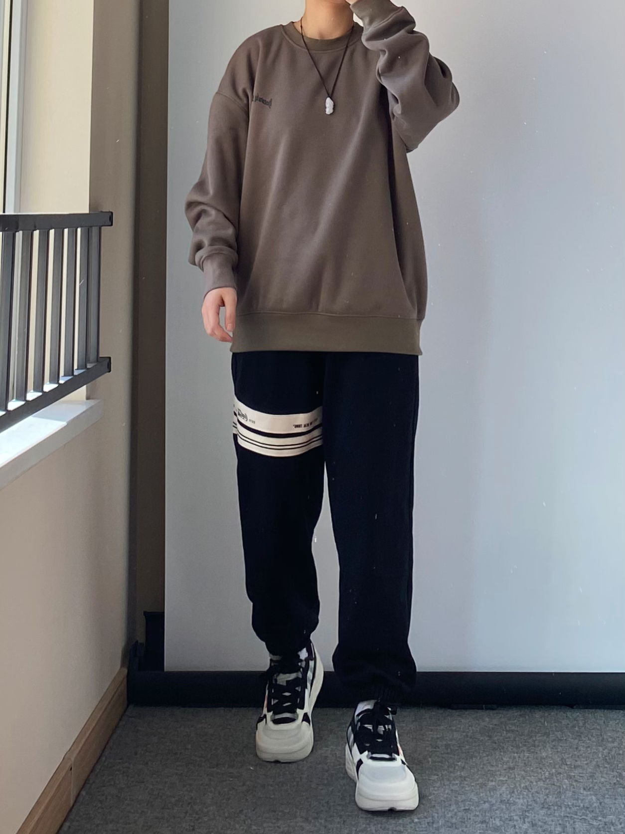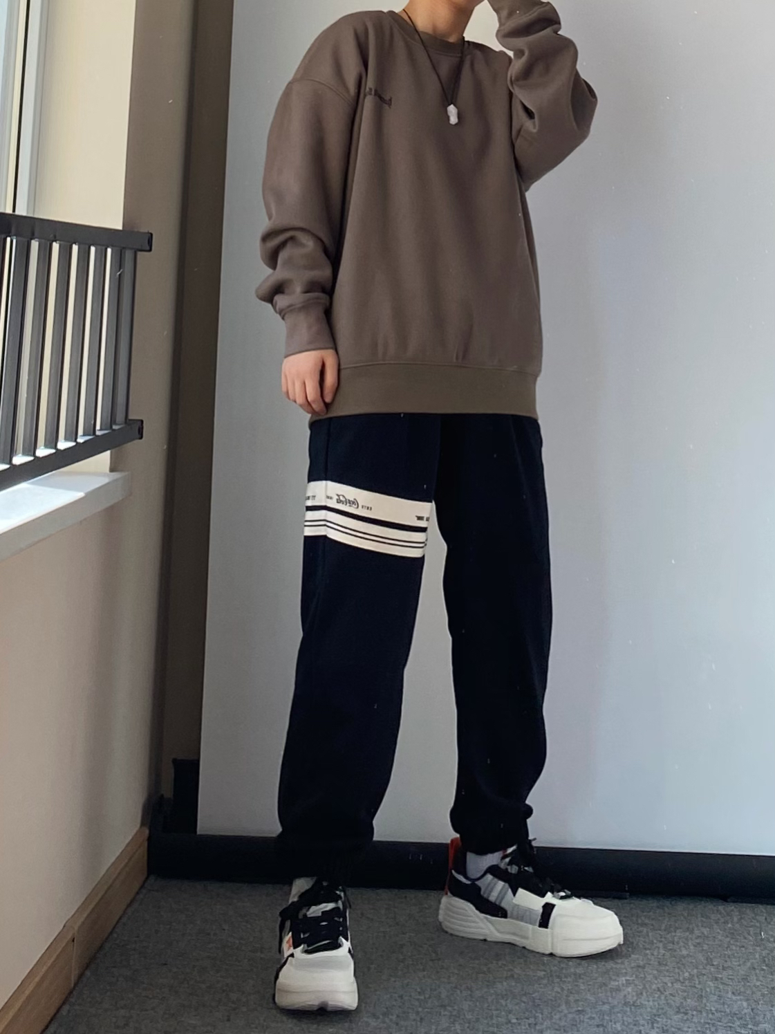 日常出门穿的简单干净就 很特别的一个颜色“暴雨灰”色圆领卫衣 内里很厚实的一层绒 春天单穿刚刚好 搭配一条百搭的黑色束脚卫裤 鸿星尔克无双板鞋 性价比真的蛮高的 整体鞋型的拼接层次感十足 橙色的汉字“无双大师”给鞋子增添了亮色点缀 日常学生党搭配工装裤束脚裤都很帅