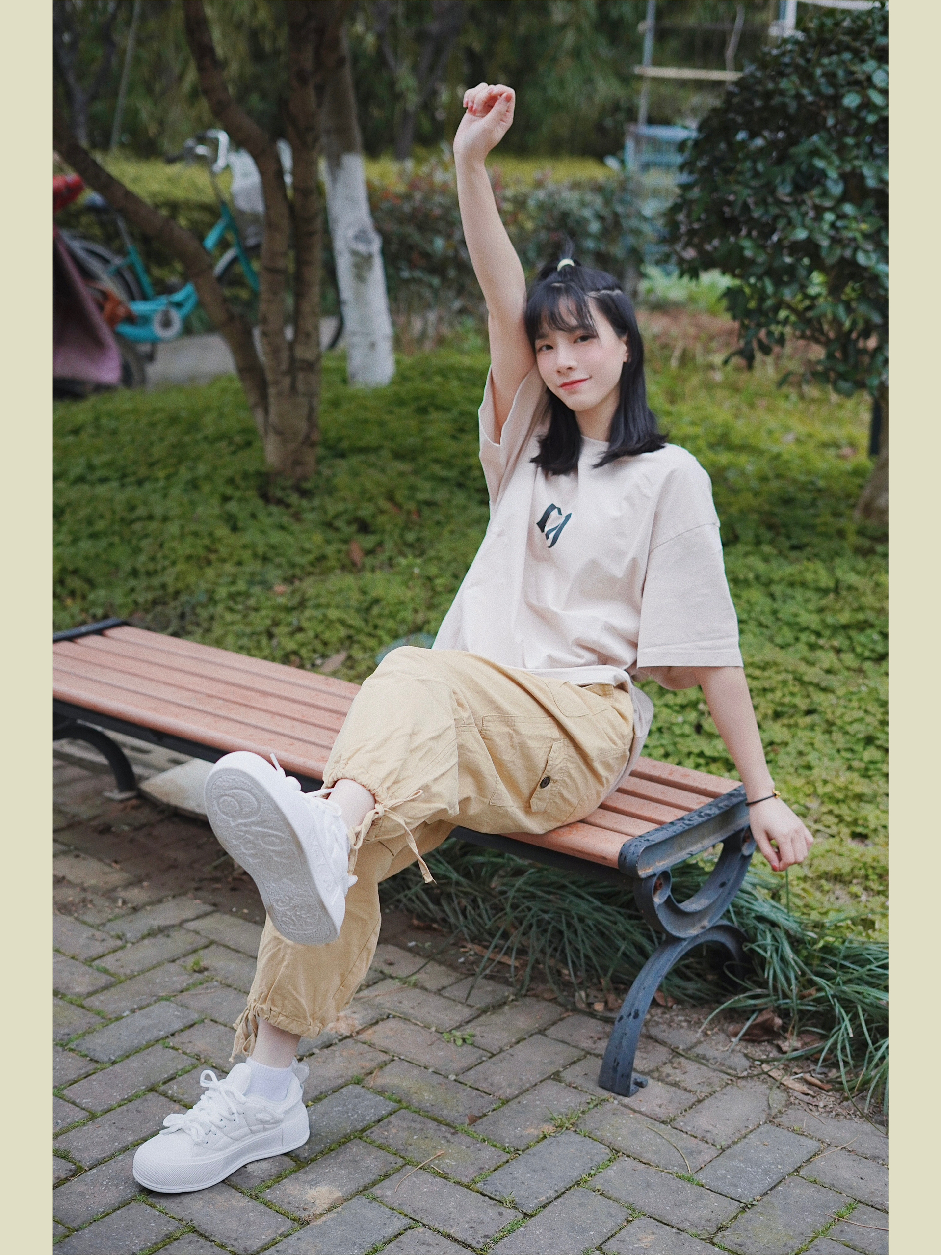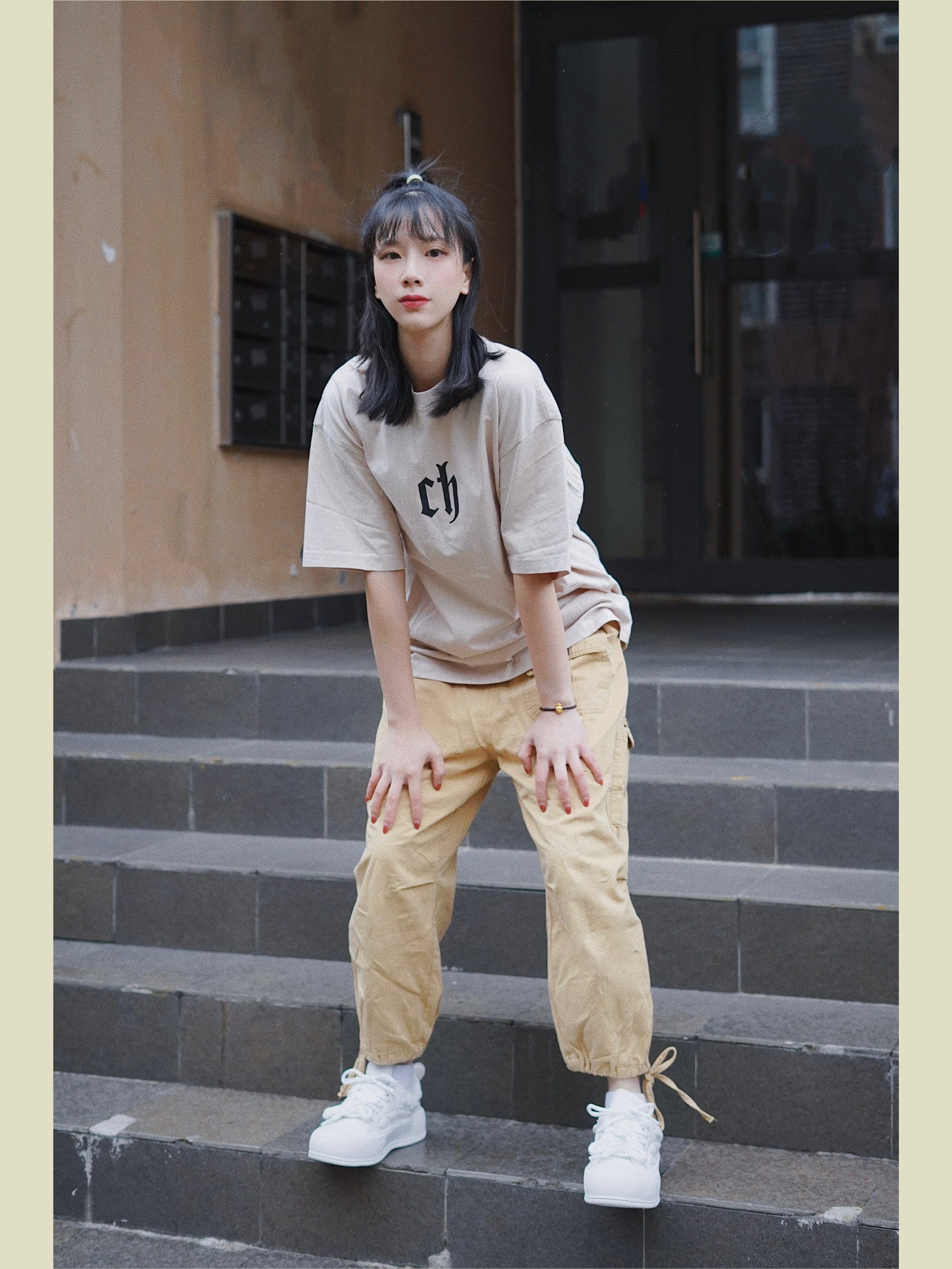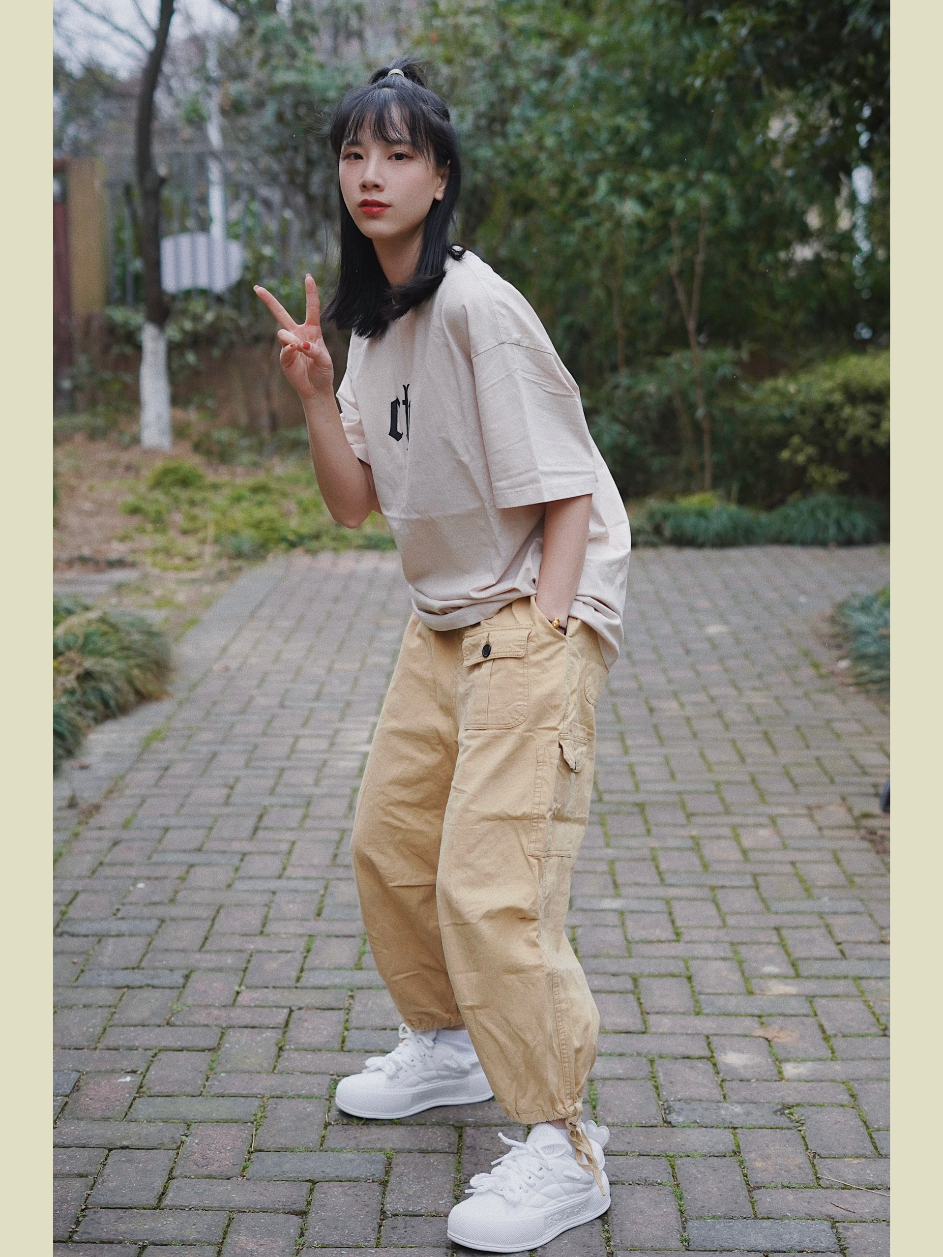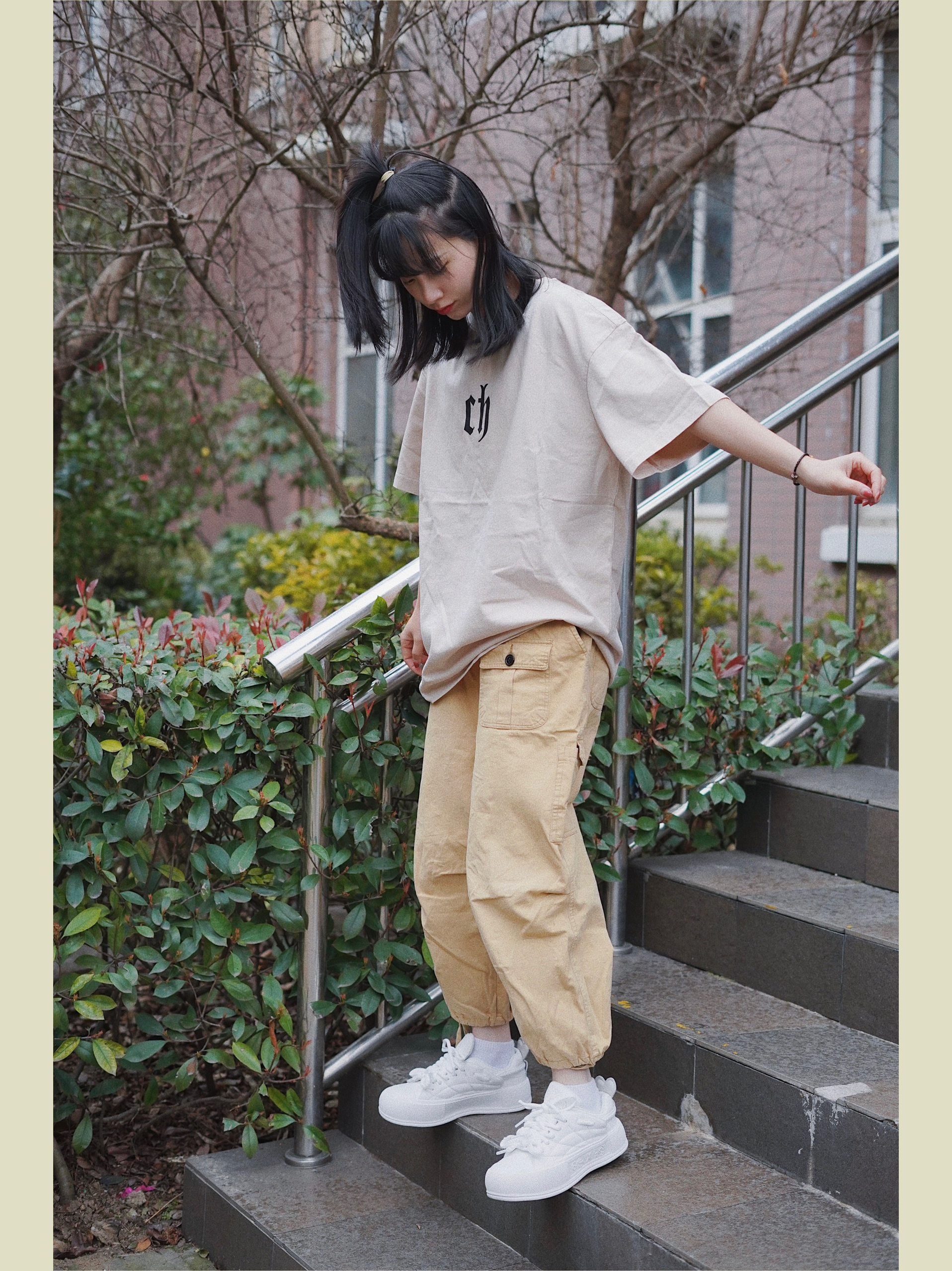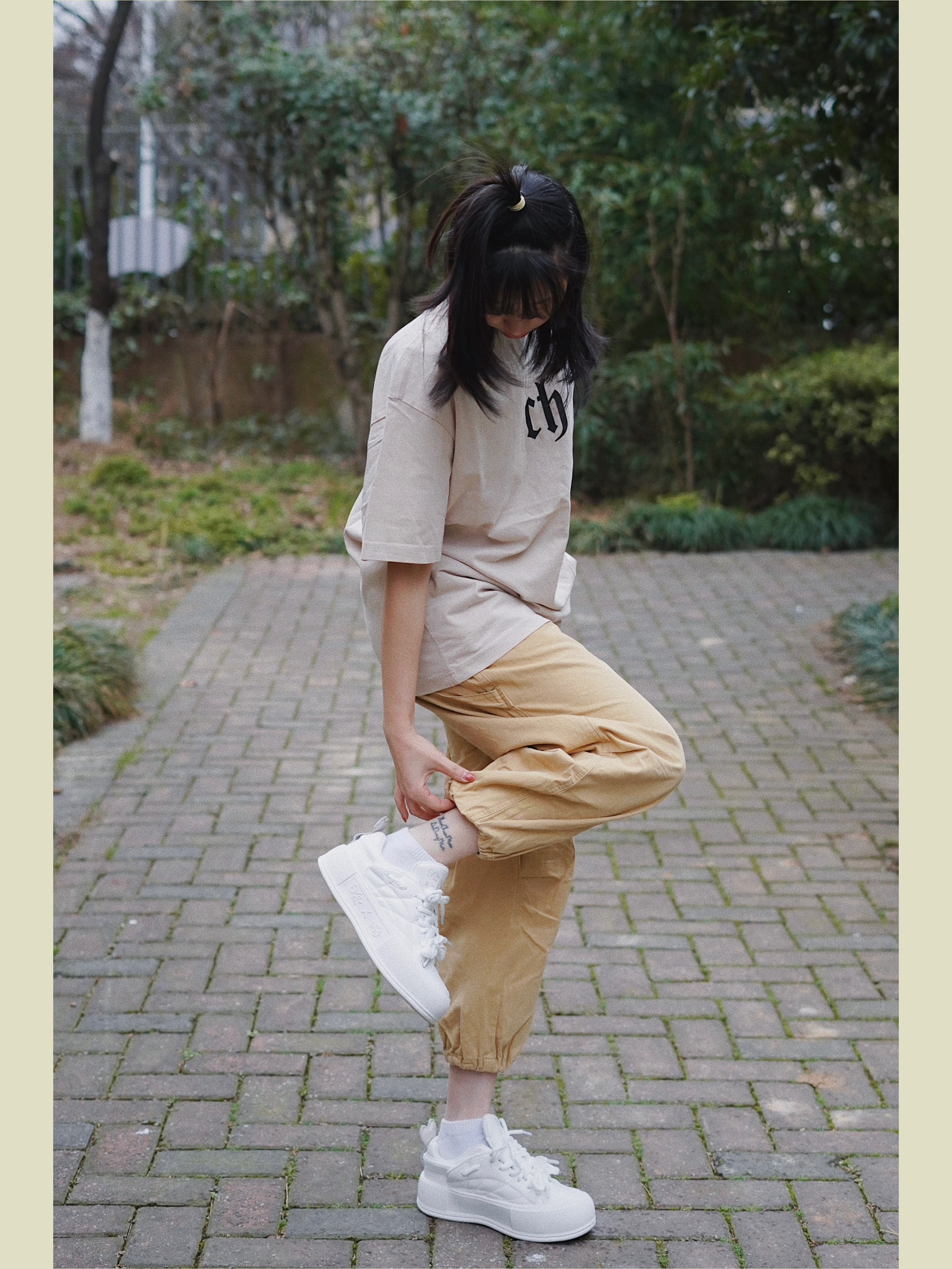 今天的穿搭分享来啦! 最喜欢的日潮工装穿搭 上身淡卡其色的短袖设计包容性强很好穿 胸前的logo简简单单 下身搭配卡其色休闲裤 再过渡脚上一对jifffly小白鞋 增高效果嘎嘎的 162cm秒变167cm 后跟爱心的设计真戳中我心 ❤ 整体颜色呼应看着真的很舒服 ----------