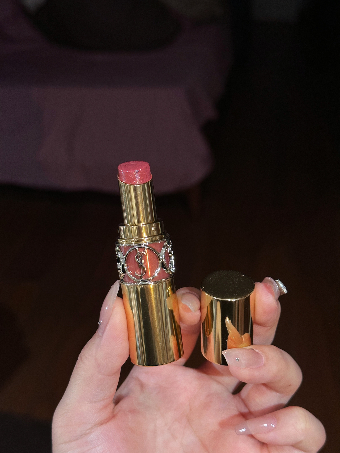 YSL 口红的颜色真的是好看的!!! 圆管真的清透水润!但是比润唇膏还要润! 随便摸一下就移位了。呜呜!! 这支色号108 是那种水水的玫瑰荔枝奶茶色~ 黄皮化妆可以涂!!白皮请闭眼🐛!!好看! over❤️
