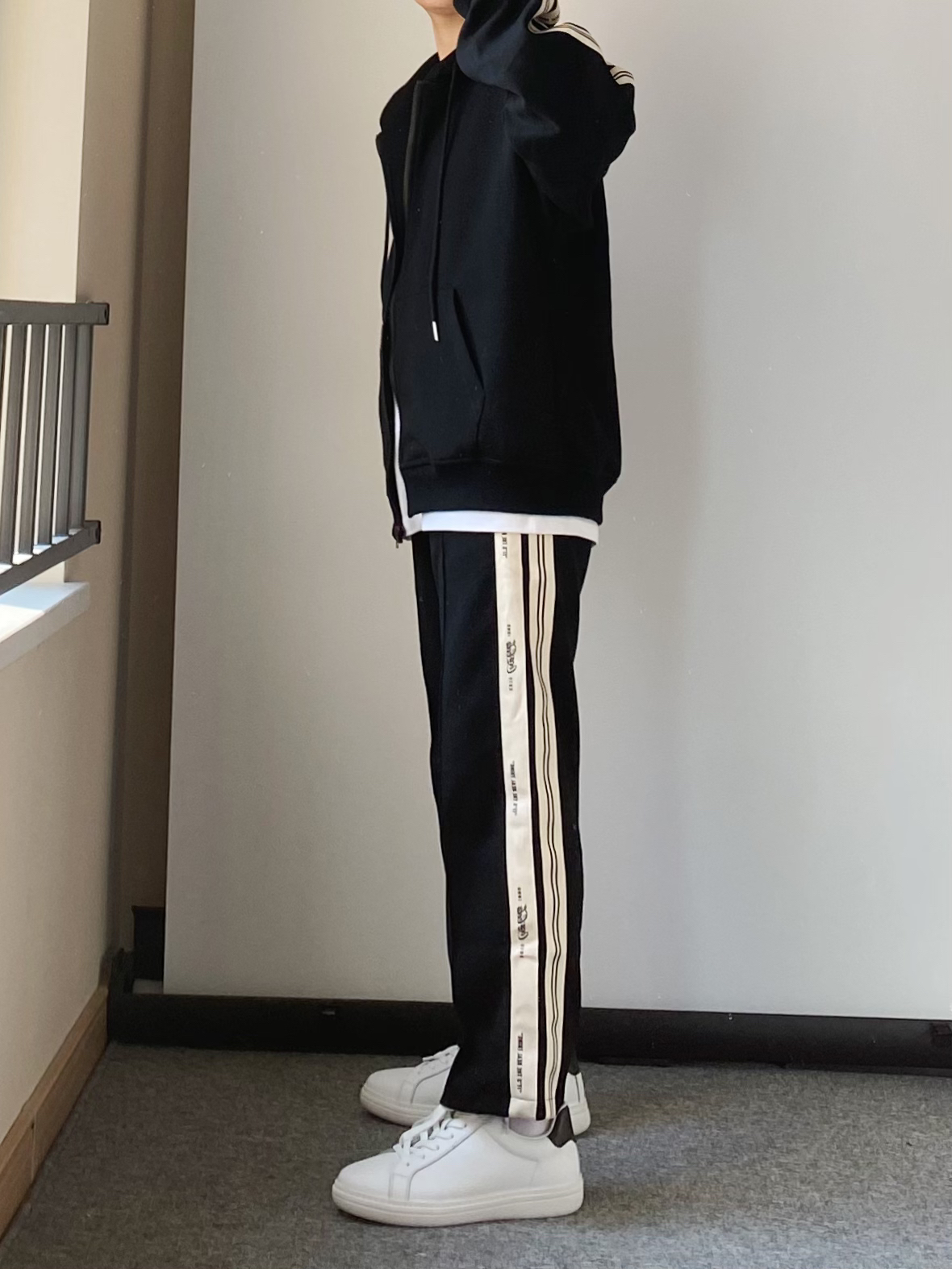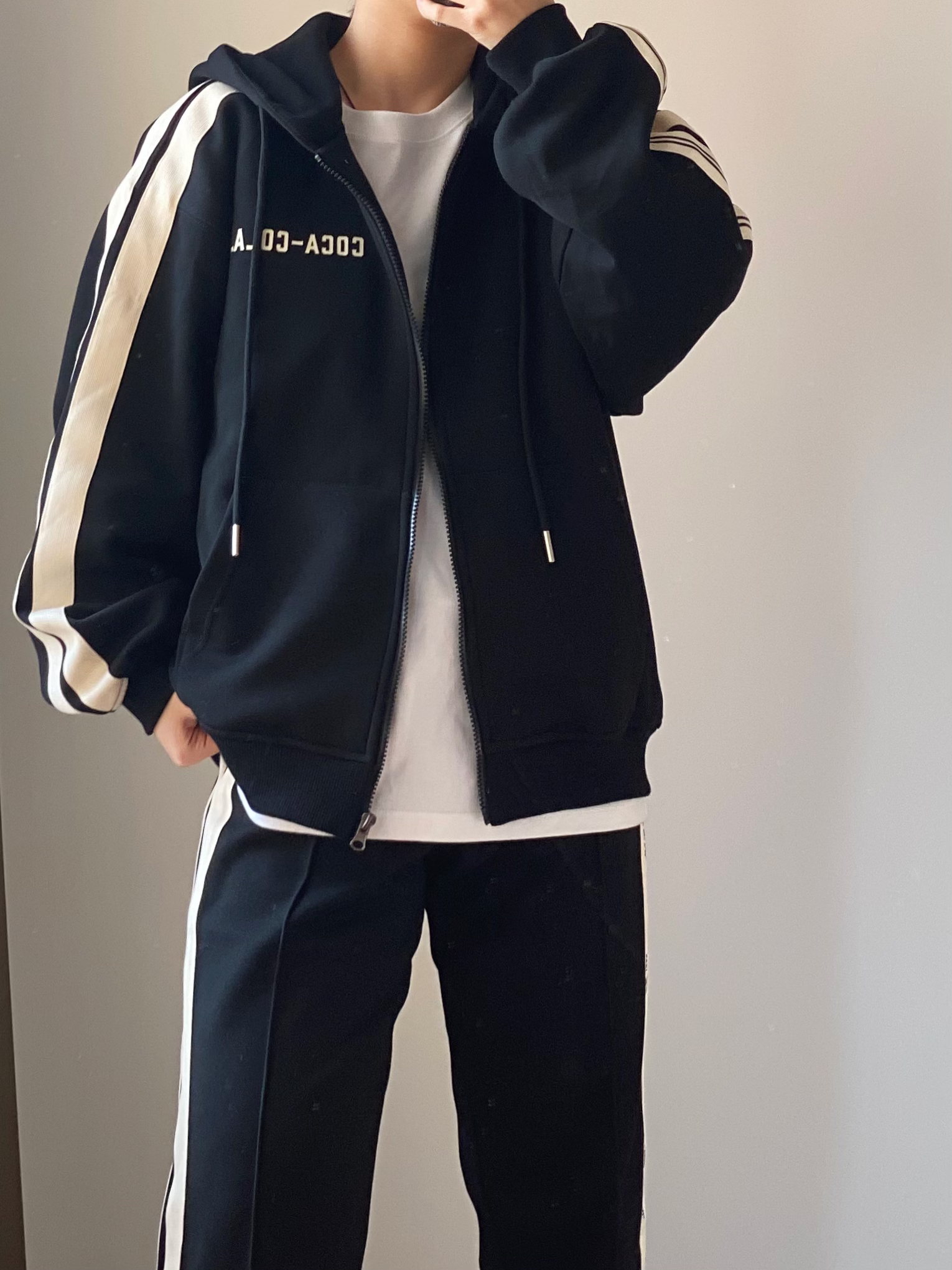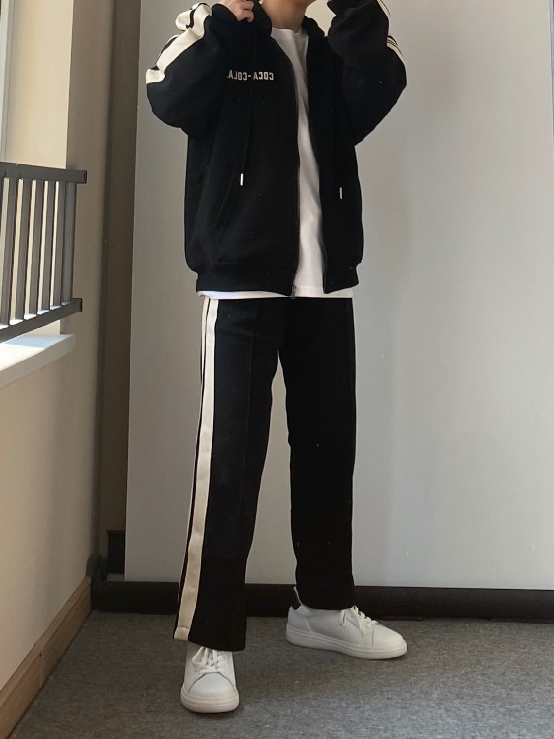 简约黑白男友风搭配~ 艾特你的男朋友学起来 不对称的条纹织带连帽外套 内里简单搭配一件纯色t 裤子搭配侧边织带的直筒卫裤 (我160穿S码大小刚好喜欢宽松可以大一码) 鞋子搭配黑尾百搭小白鞋 头层牛皮真皮材质 春天怎么搭都好看 👔👖Coca Cola