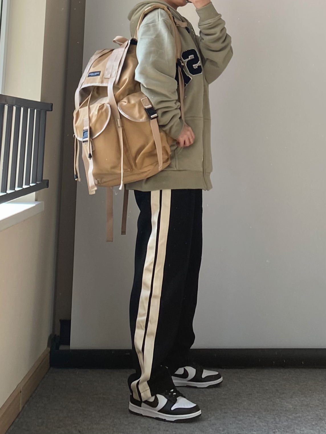 学生党的朋友 春季开学太适合这样穿啦~ 浅浅的抹茶绿色连帽卫衣外套 搭配一条黑色织带直筒卫裤 卡其色学生党都可背的大容量双肩书包 今天的小细节是999足金的素戒 净版版型男生也能戴还可以配情侣 哦 👔白告studio 👖Coca Cola 🎒VAOPER 💍贝戈丽丝BEGORIS