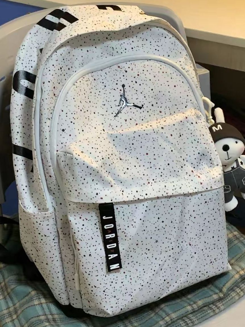 Jordan 学生书包休闲背包双肩包 🎨🎨🎨这款背包容量大,所以电脑、衣物、文具等物品都能整洁有序的放置好。🎯🎯🎯 具有一定的防泼水功能,大胆前卫,匠心品质,魅力尽显,百搭大气,出行必备,时尚轻便🎲🎲🎲做工一流,好看不贵,书包真的很帅气, 背着也很舒服,还有一款黑色,也是很好看的🏆🏆🏆适合上学,旅行,外出 图源网络,侵删。