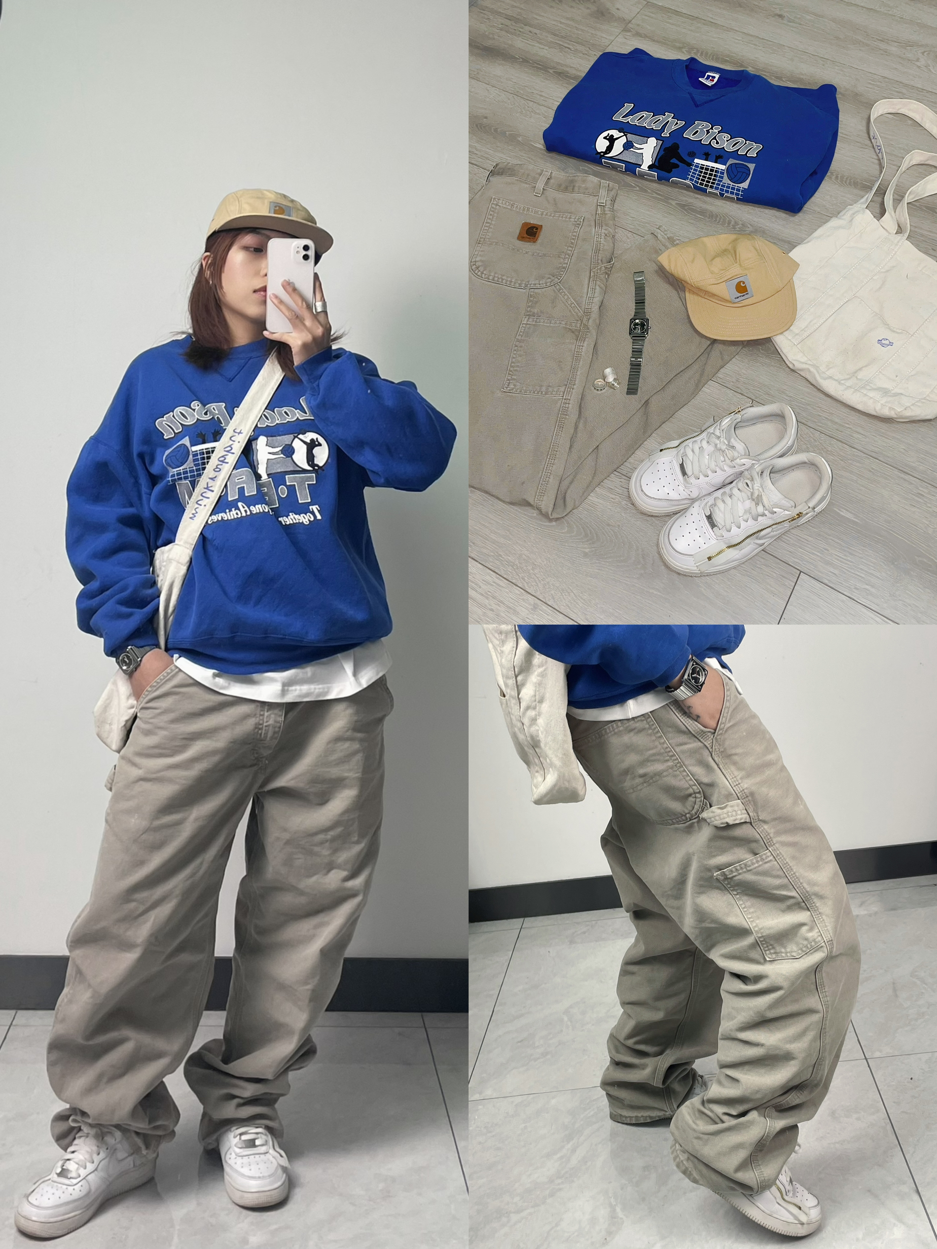 身高|体重:160/110 🧍♂️ 穿搭风格:日系中带有一丝节有感 👔 上衣:罗素vintage卫衣 👖 下装:vintage卡哈特b11 沙色百搭裤型宽松直筒单膝 我穿腰围86裤长110!宽松堆叠感很强!