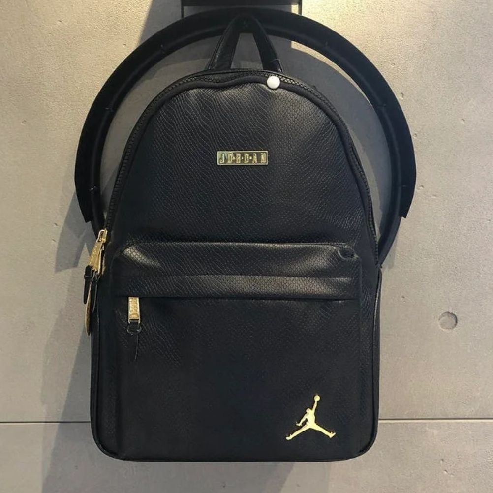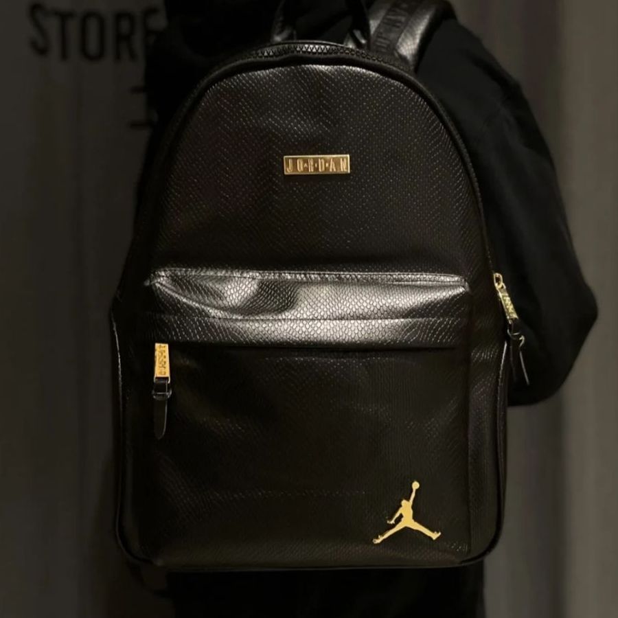 Jordan 大容量金色飞天Logo蛇纹皮革书包背包双肩包 🔮🔮🔮容量大,所以电脑、衣物、文具等物品都能整洁有序的放置好。🛍🛍🛍 具有防泼水功能,大胆前卫,匠心品质,魅力尽显,百搭大气,出行必备,时尚轻便🎐🎐🎐这款背包物美价廉,颜色很正,线条颜色和金色logo的搭配简直完美,里外做工细致高大上📯📯📯适合上学,旅行,外出 图源网络,侵删。