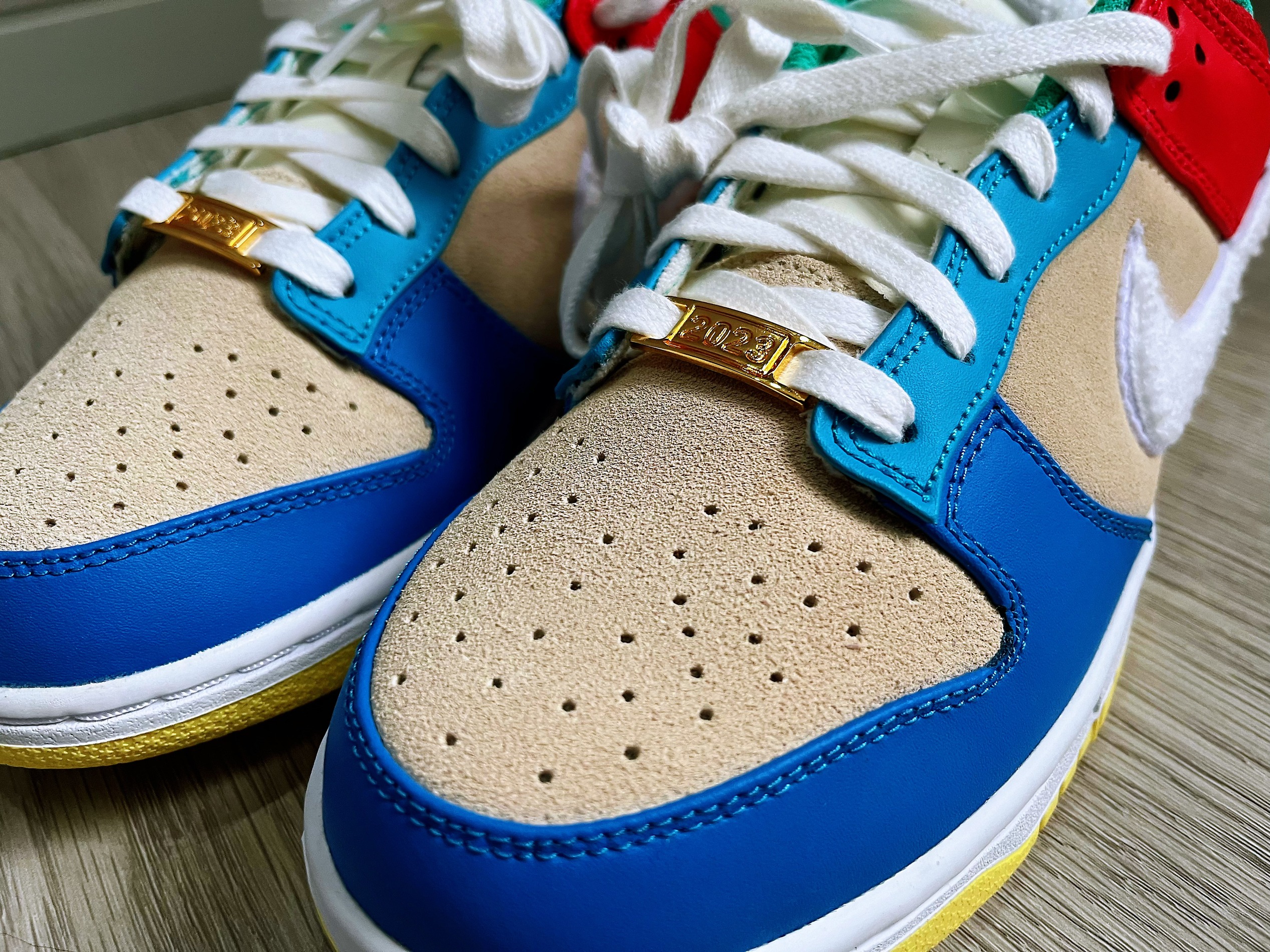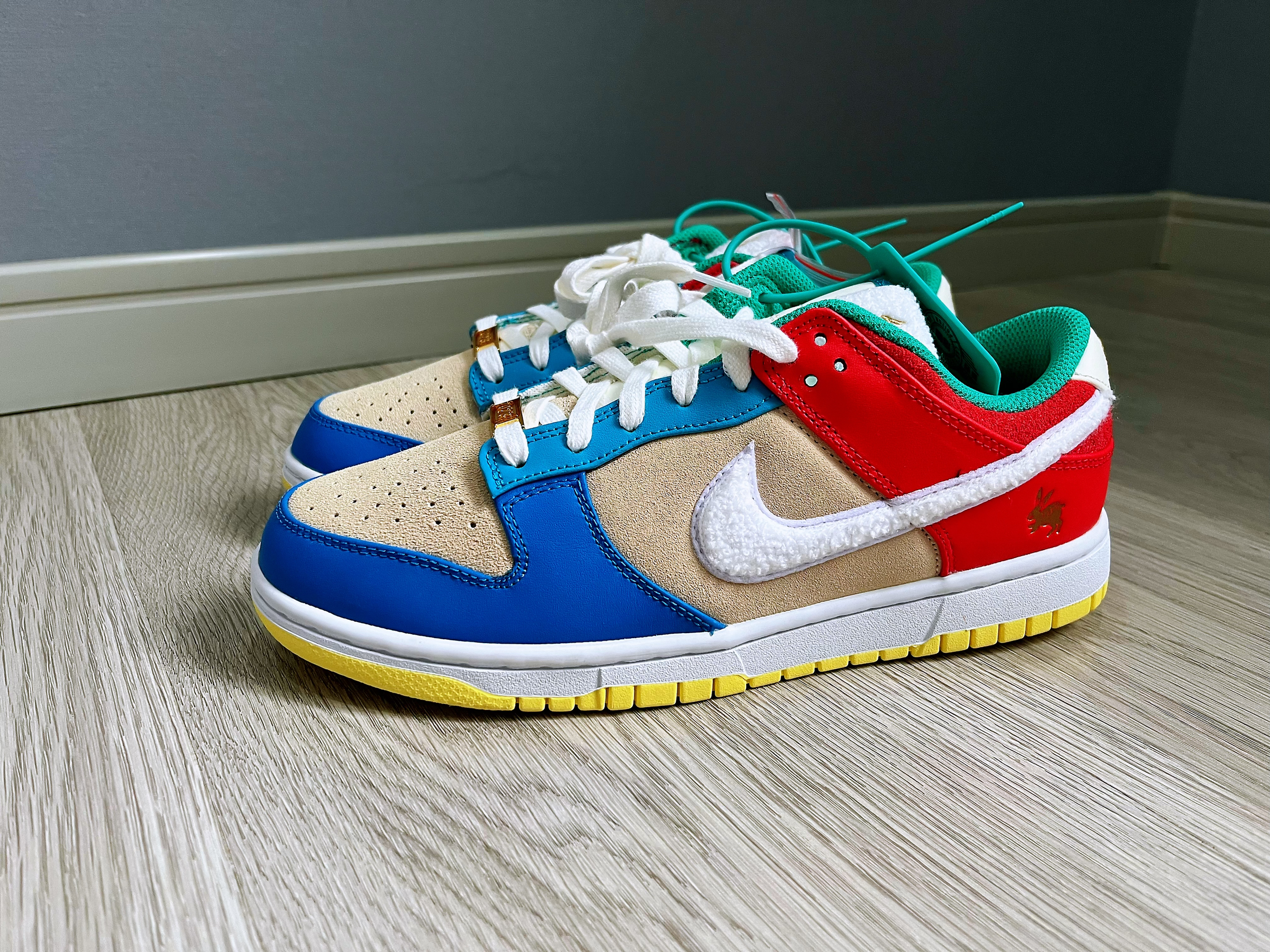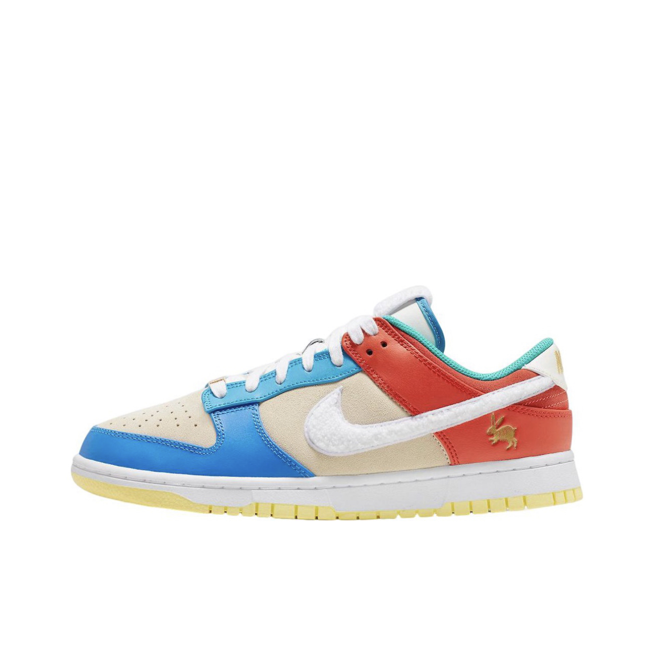 🚗“兔儿爷”它带着金牌子就来了,今年的京兔dunk灵感就来源于非遗泥塑“兔儿爷”🐇 🤔兔子味儿十足,swoosh标志和鞋舌都用了兔子皮毛混合材料制成,鞋舌,鞋后跟还有鞋垫都有兔子哦 金色的牌子真的很增加视觉冲击,而且鞋子整体的颜色搭配也是京味十足,价格7开 这不得赶紧入手个🫡