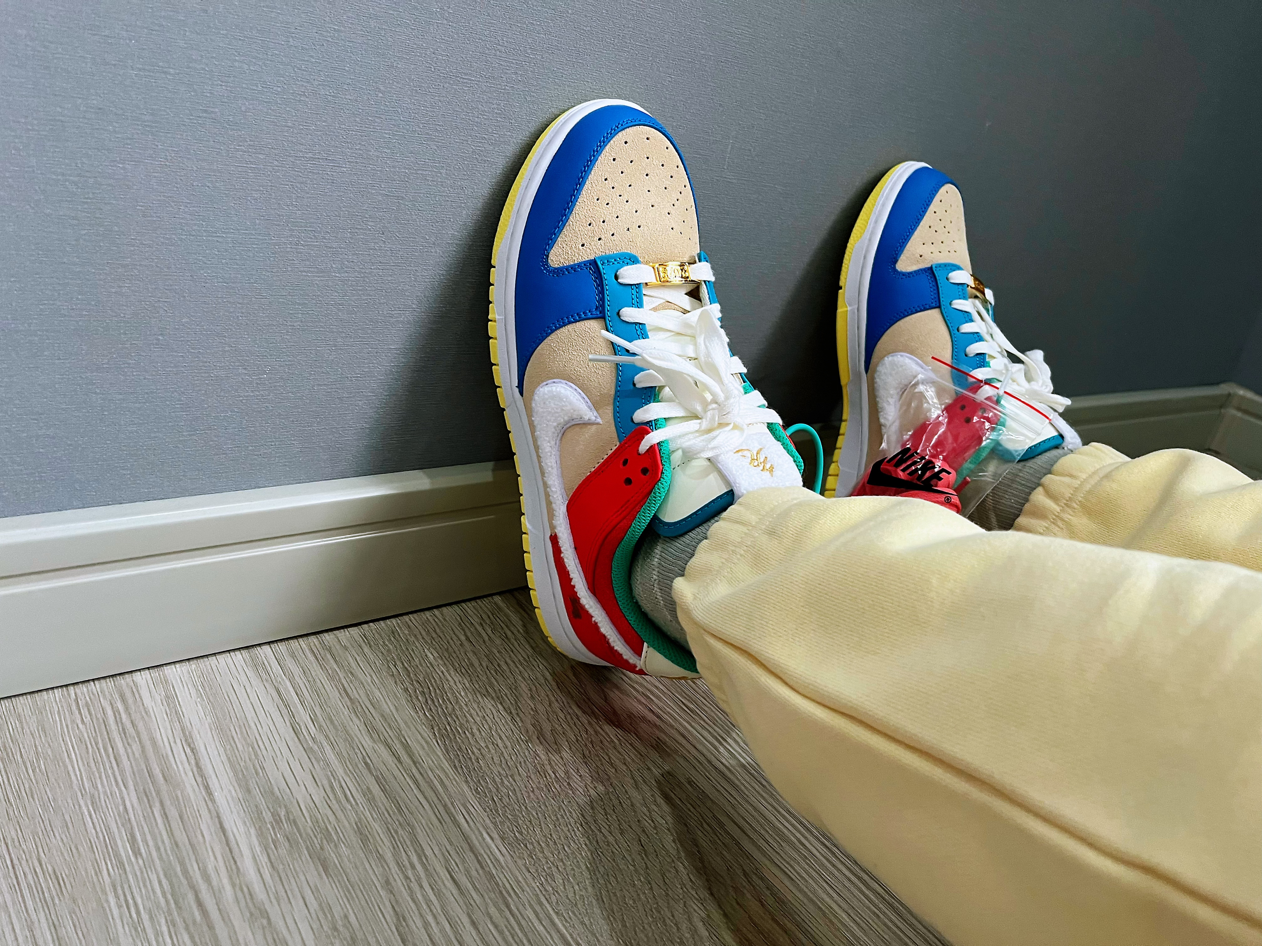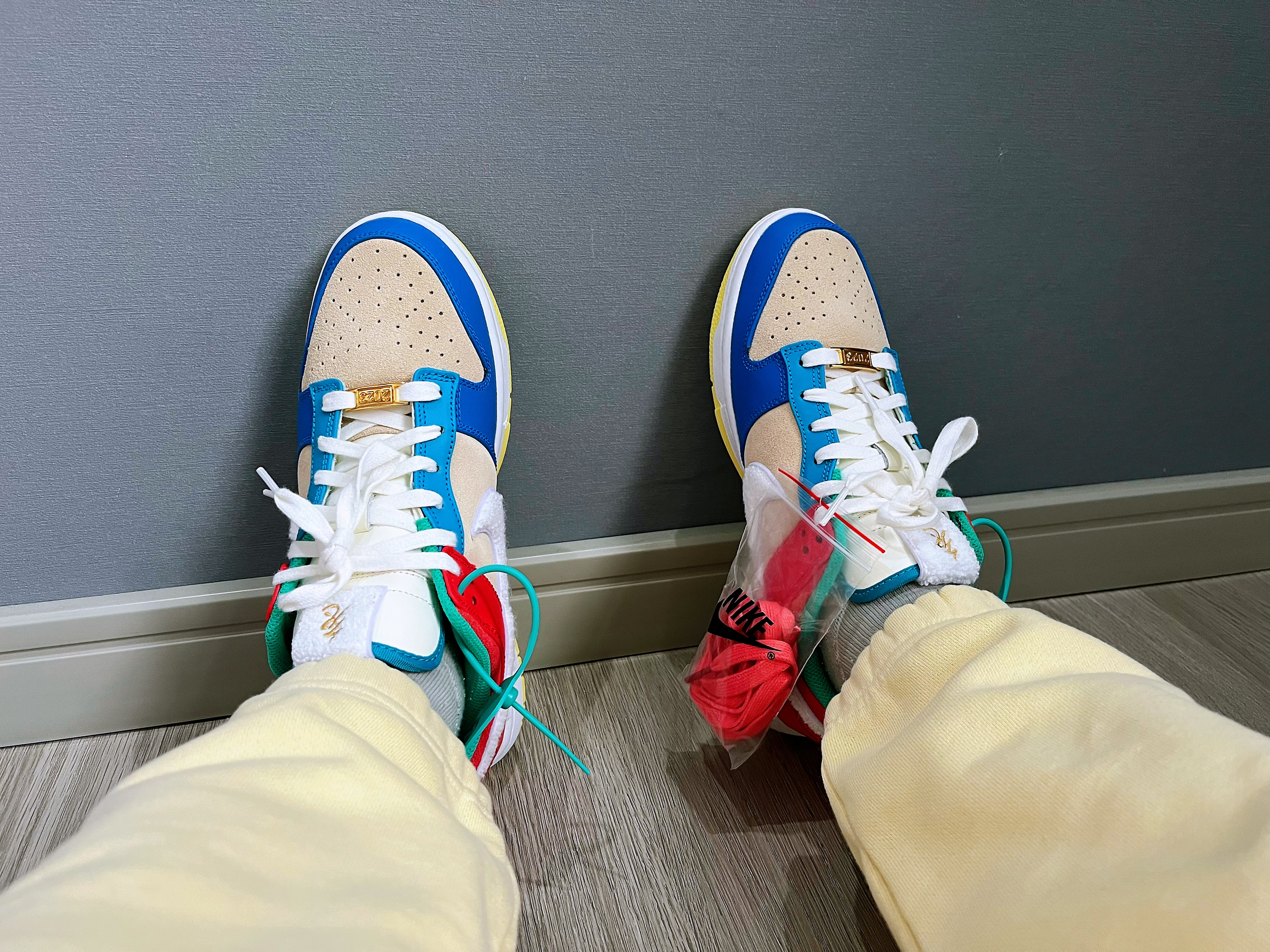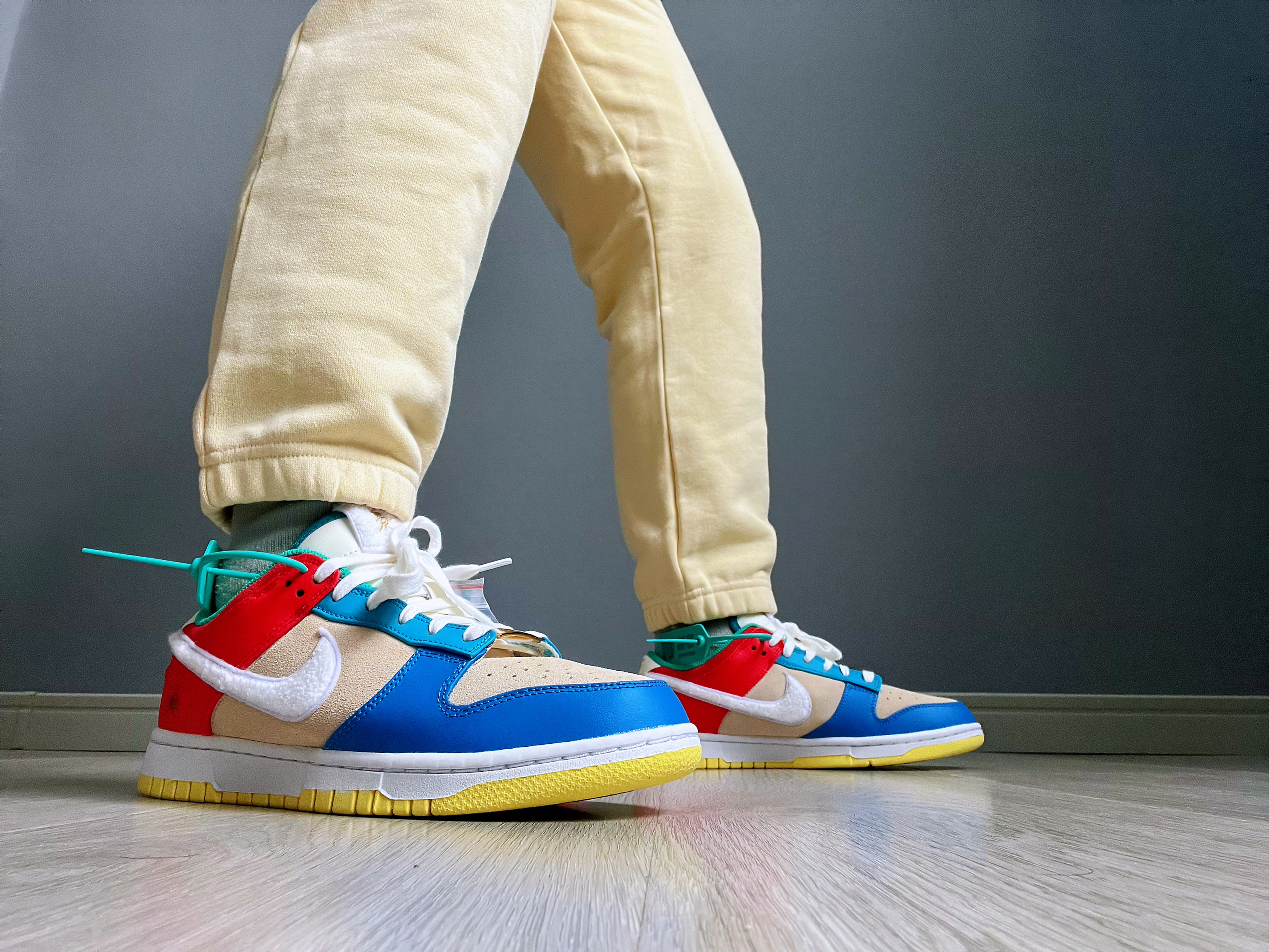 🚗“兔儿爷”它带着金牌子就来了,今年的京兔dunk灵感就来源于非遗泥塑“兔儿爷”🐇 🤔兔子味儿十足,swoosh标志和鞋舌都用了兔子皮毛混合材料制成,鞋舌,鞋后跟还有鞋垫都有兔子哦 金色的牌子真的很增加视觉冲击,而且鞋子整体的颜色搭配也是京味十足,价格7开 这不得赶紧入手个🫡