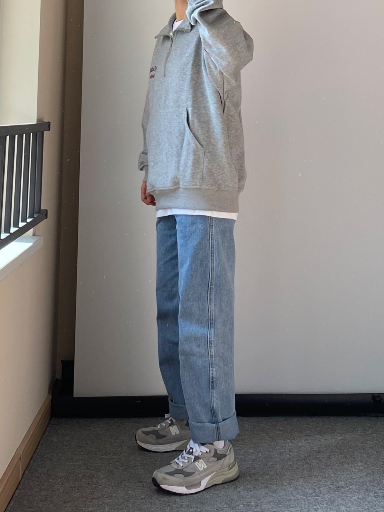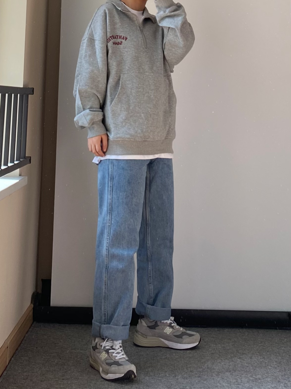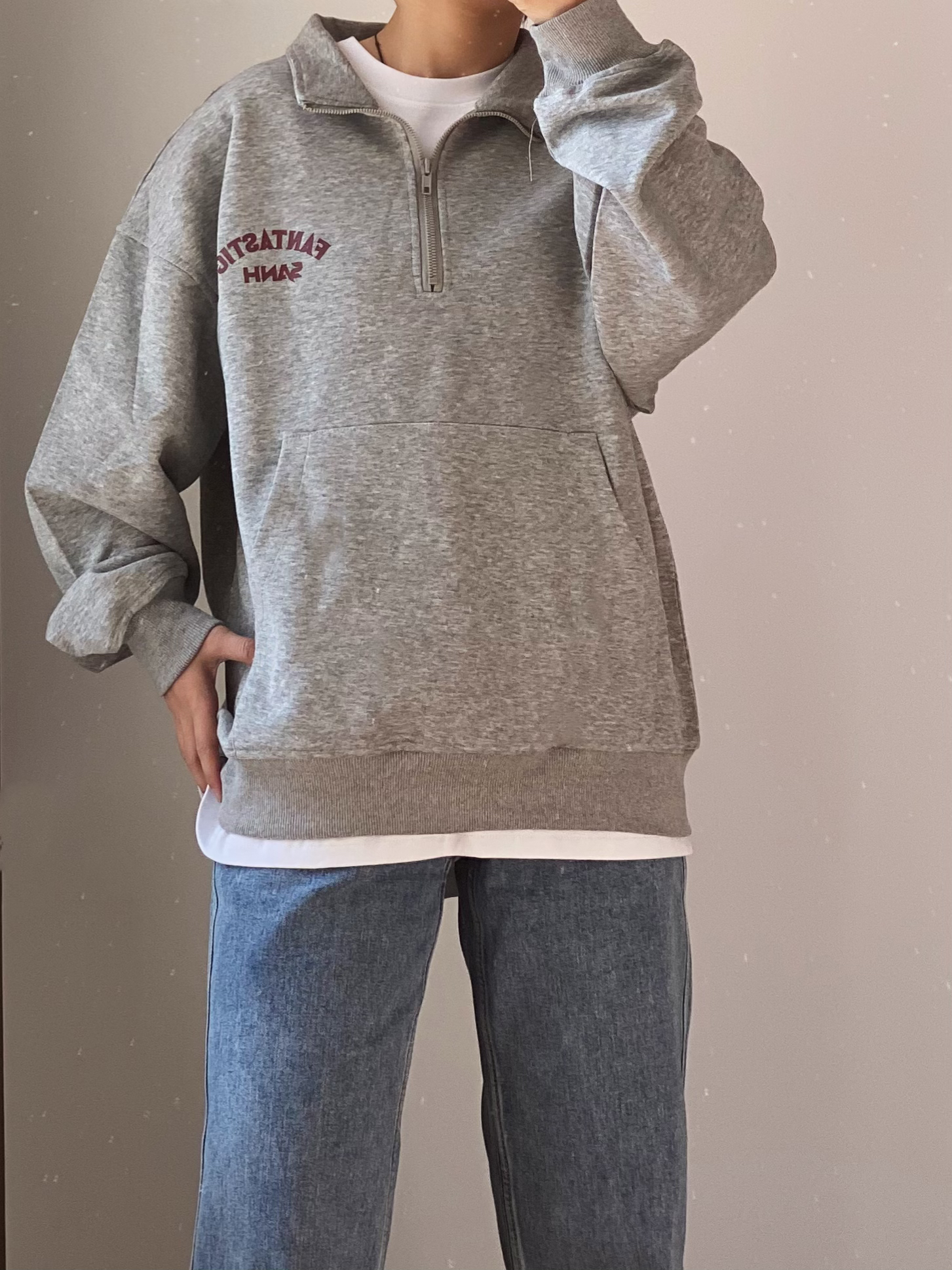 当地比较喜爱叠穿的一类人 👔灰色的半拉链立领卫衣 内里可以搭配一件稍微长一点的白T 漏出边边很有层次感 👖裤子搭配一条百搭的蓝色直筒牛仔裤 满满的少年感