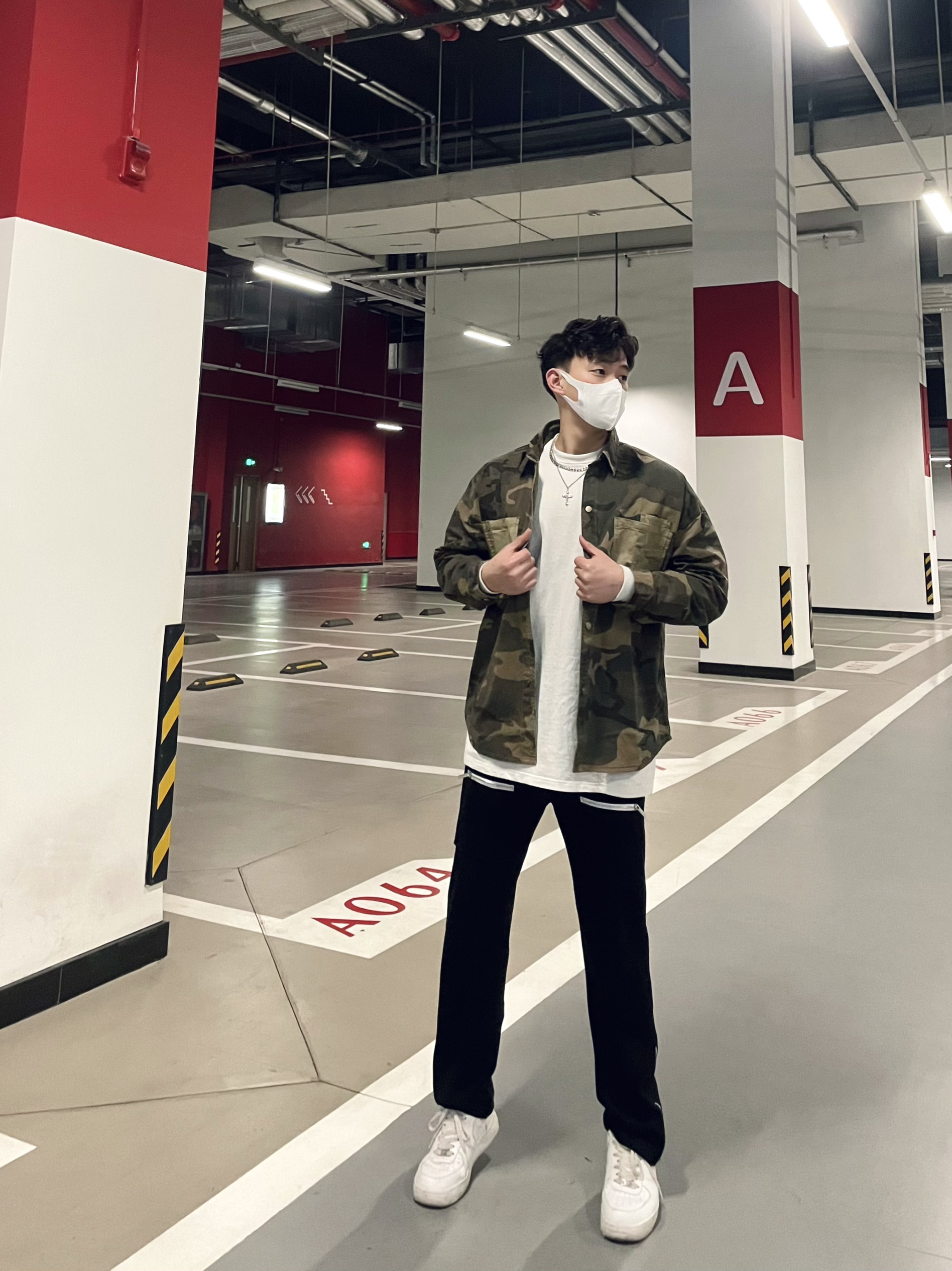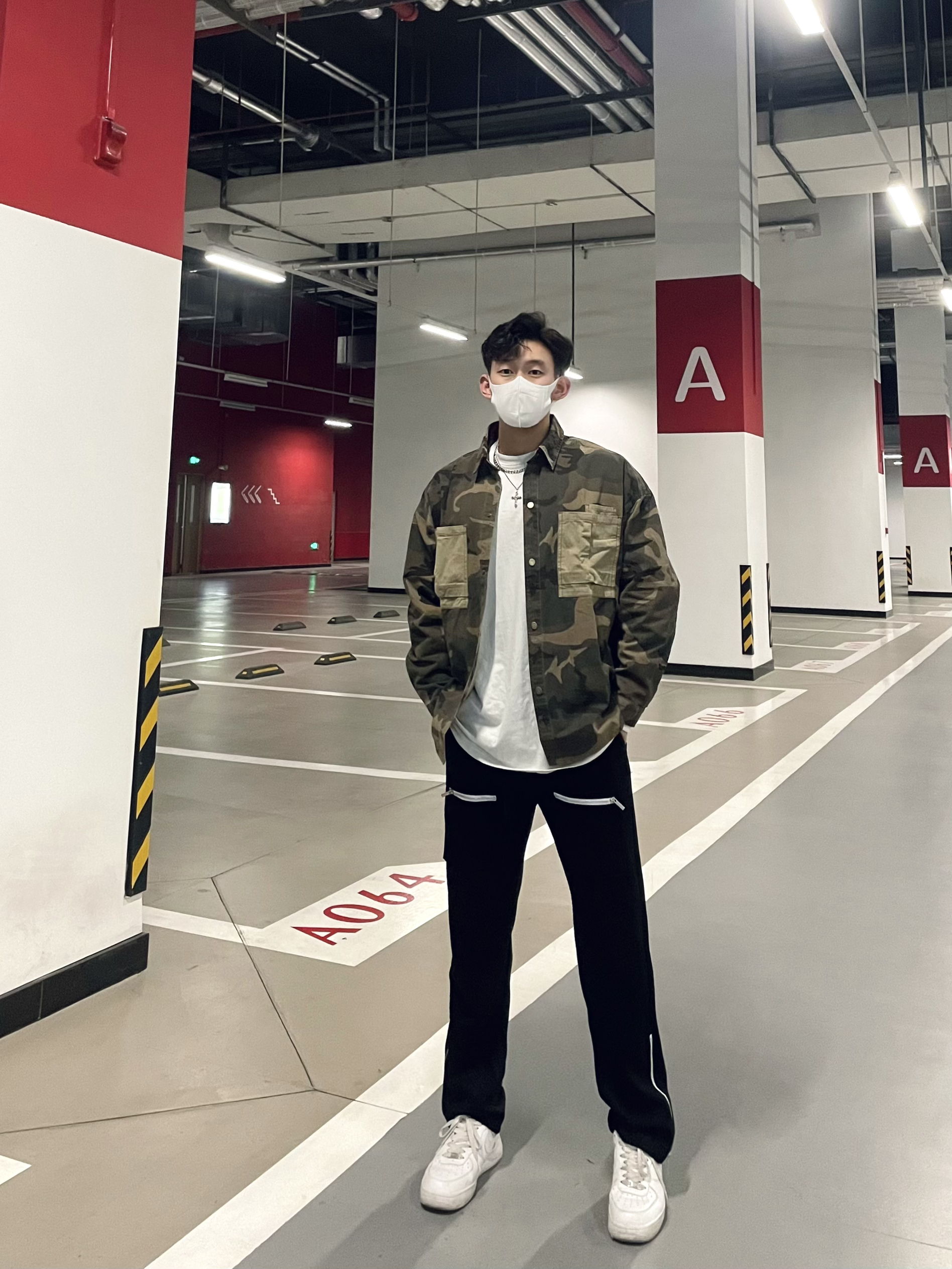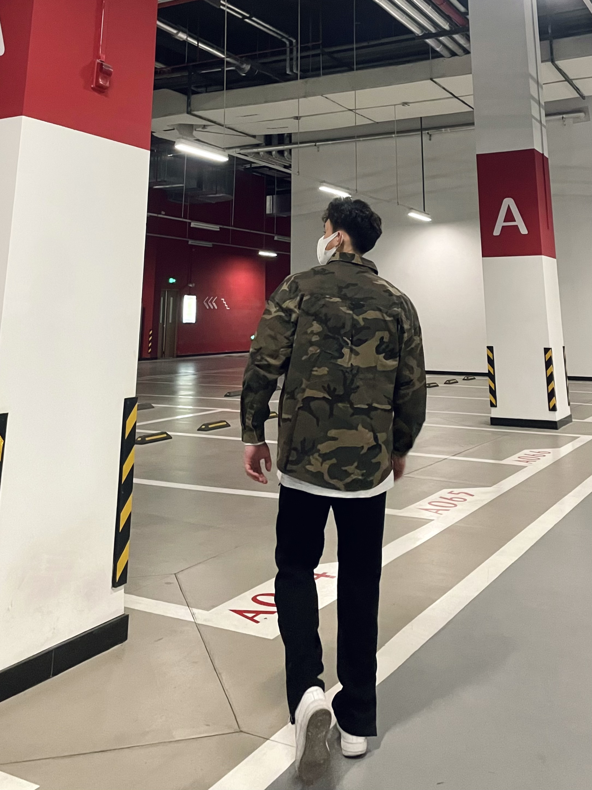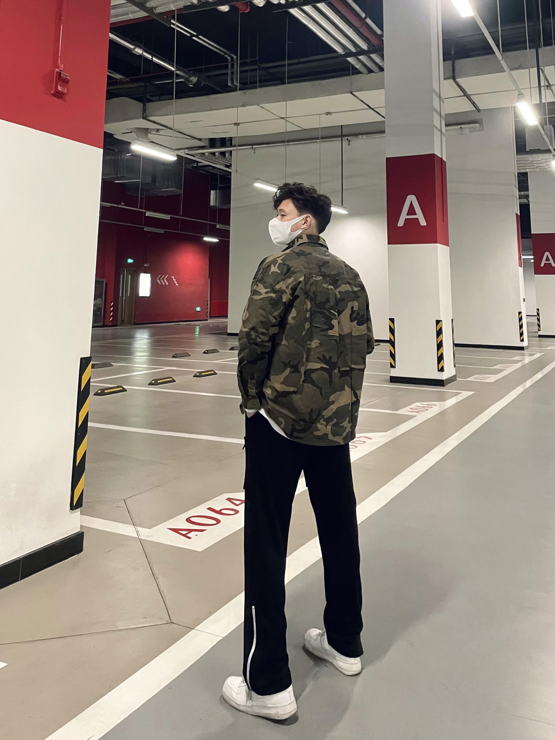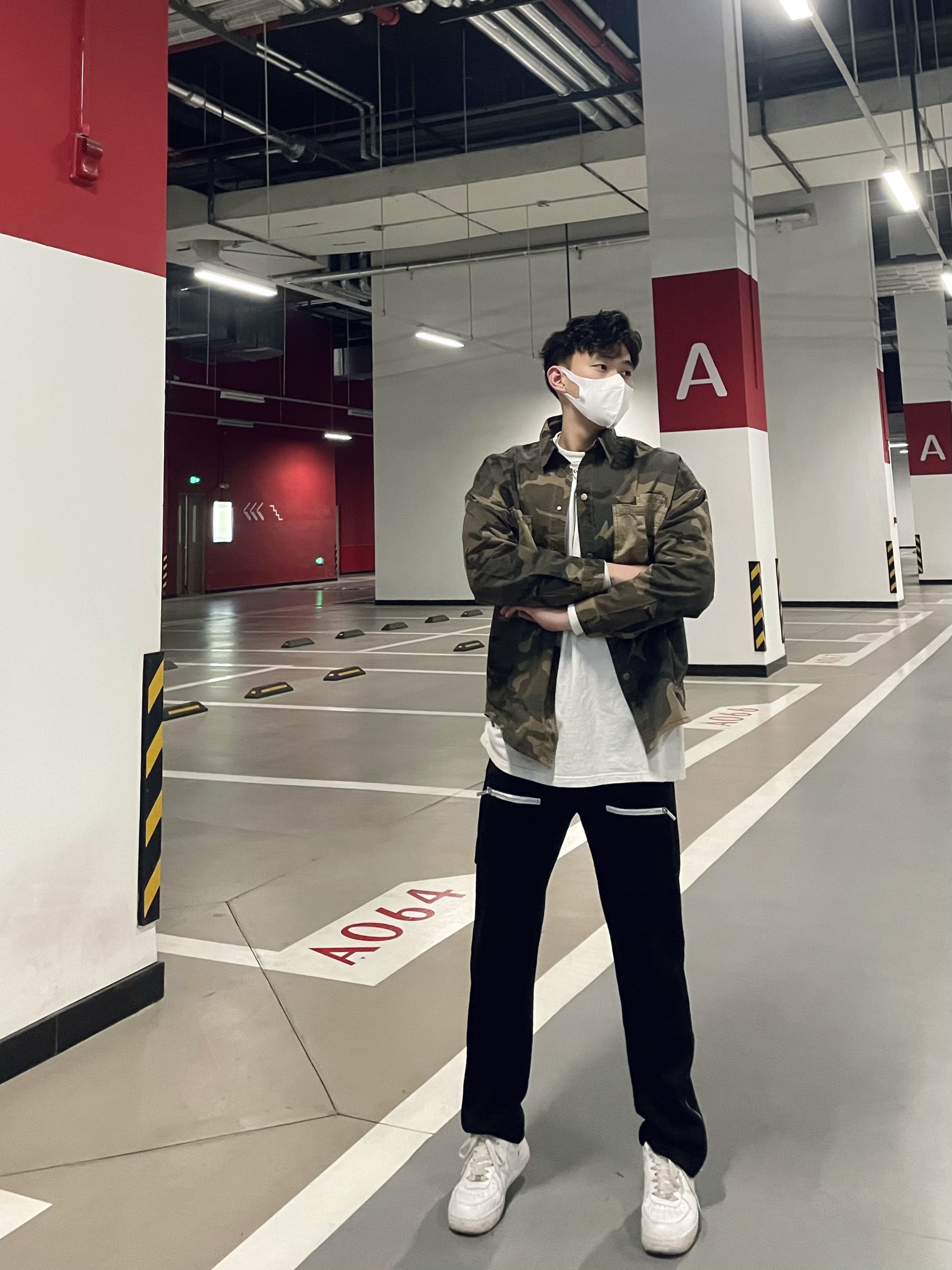 今日份男生穿搭 迷彩夹克上身 工装风格搭配真的很帅 夹克版型特别硬挺 穿上特别有男人味 黑色长裤版型也很好 非常显腿长腿直 拉链的设计也非常的高端 真的是很帅的一身穿搭啦