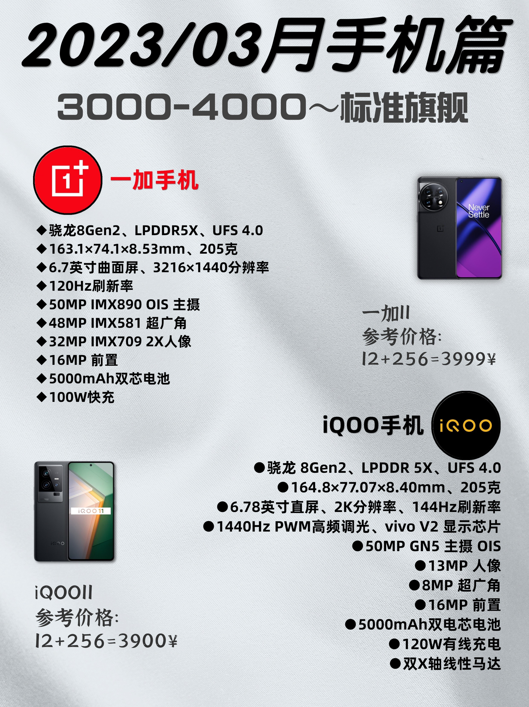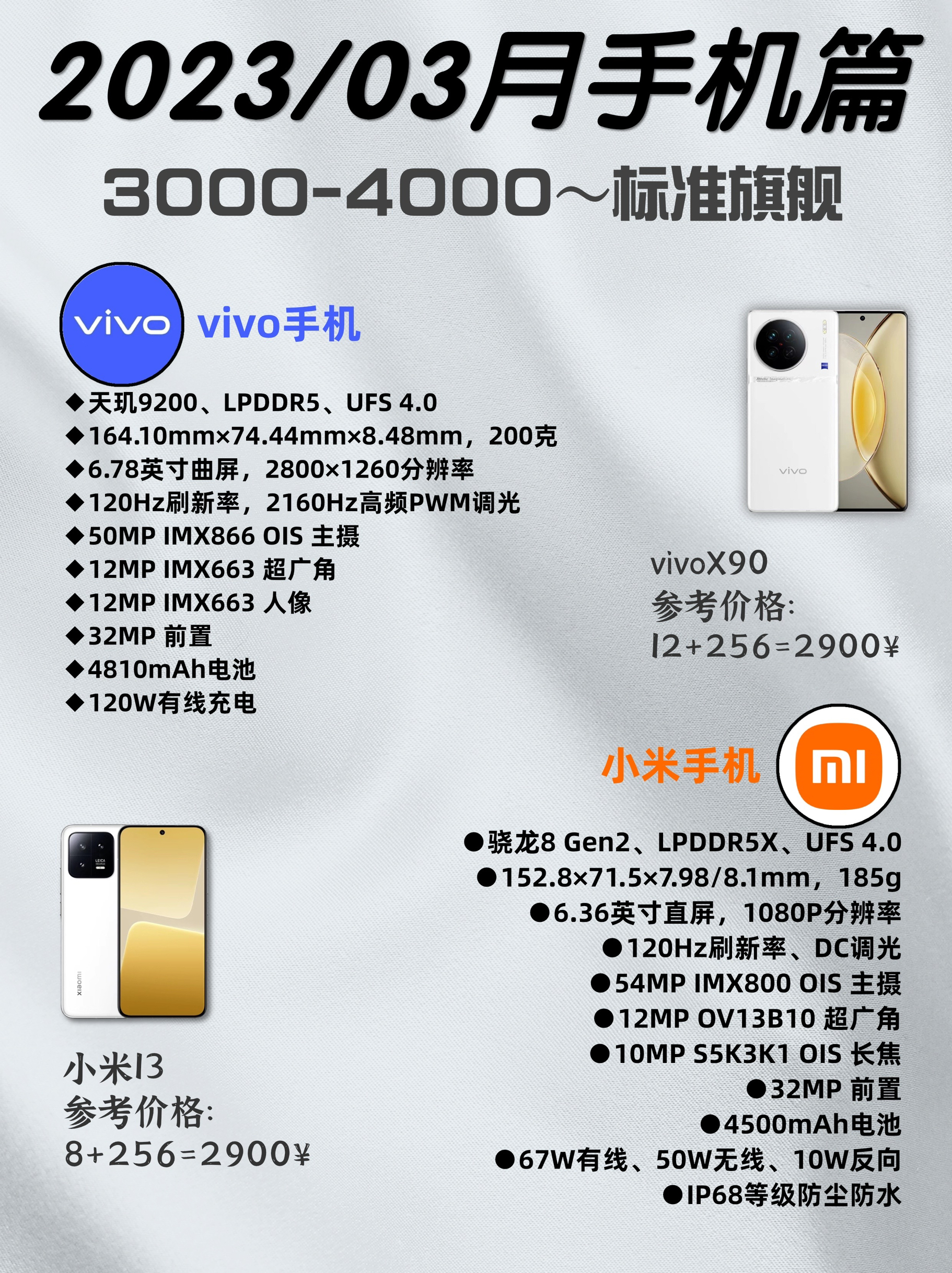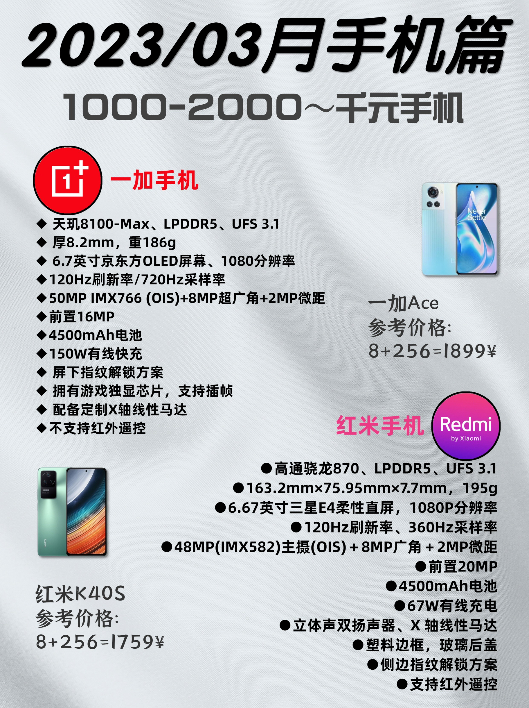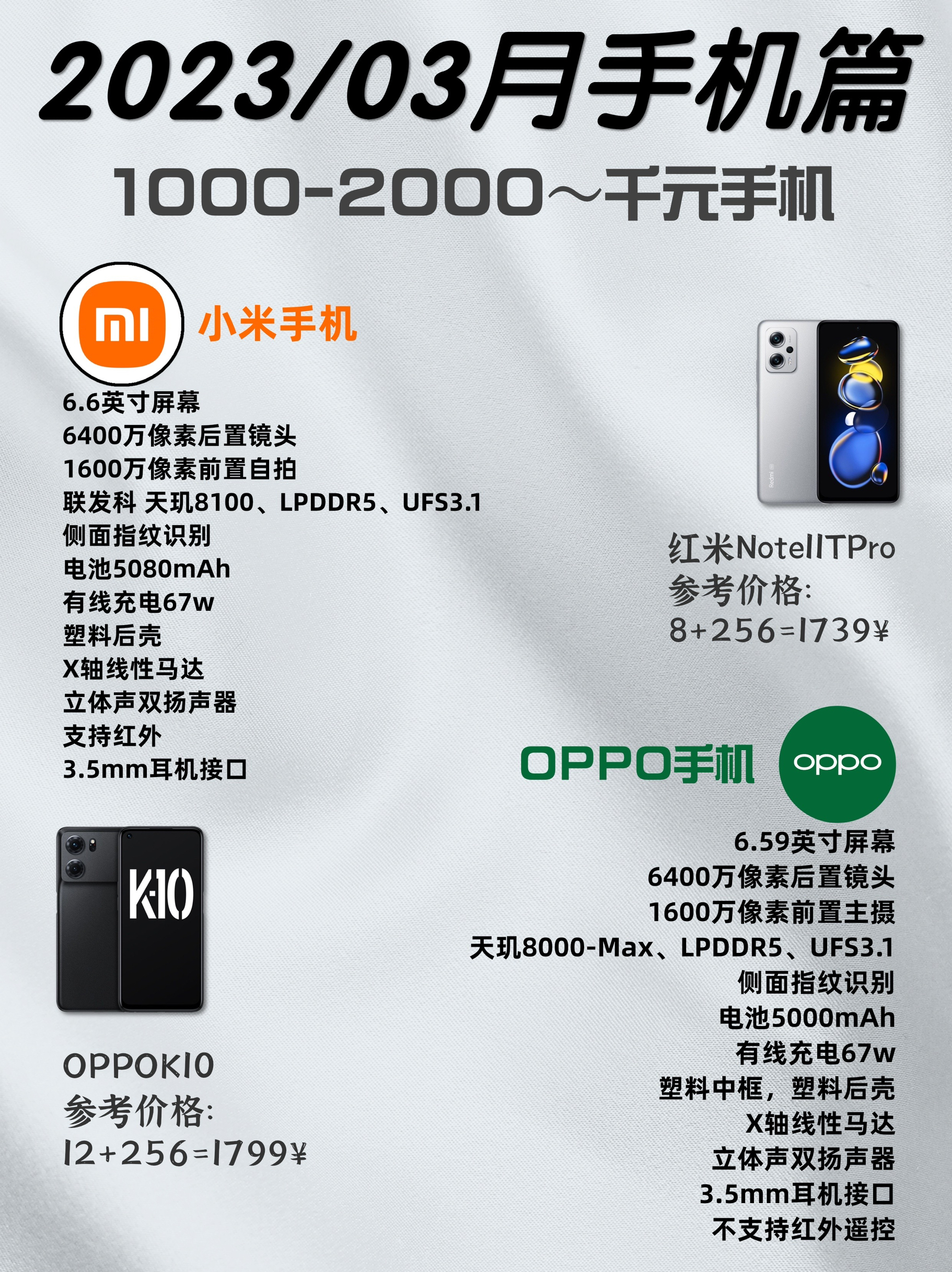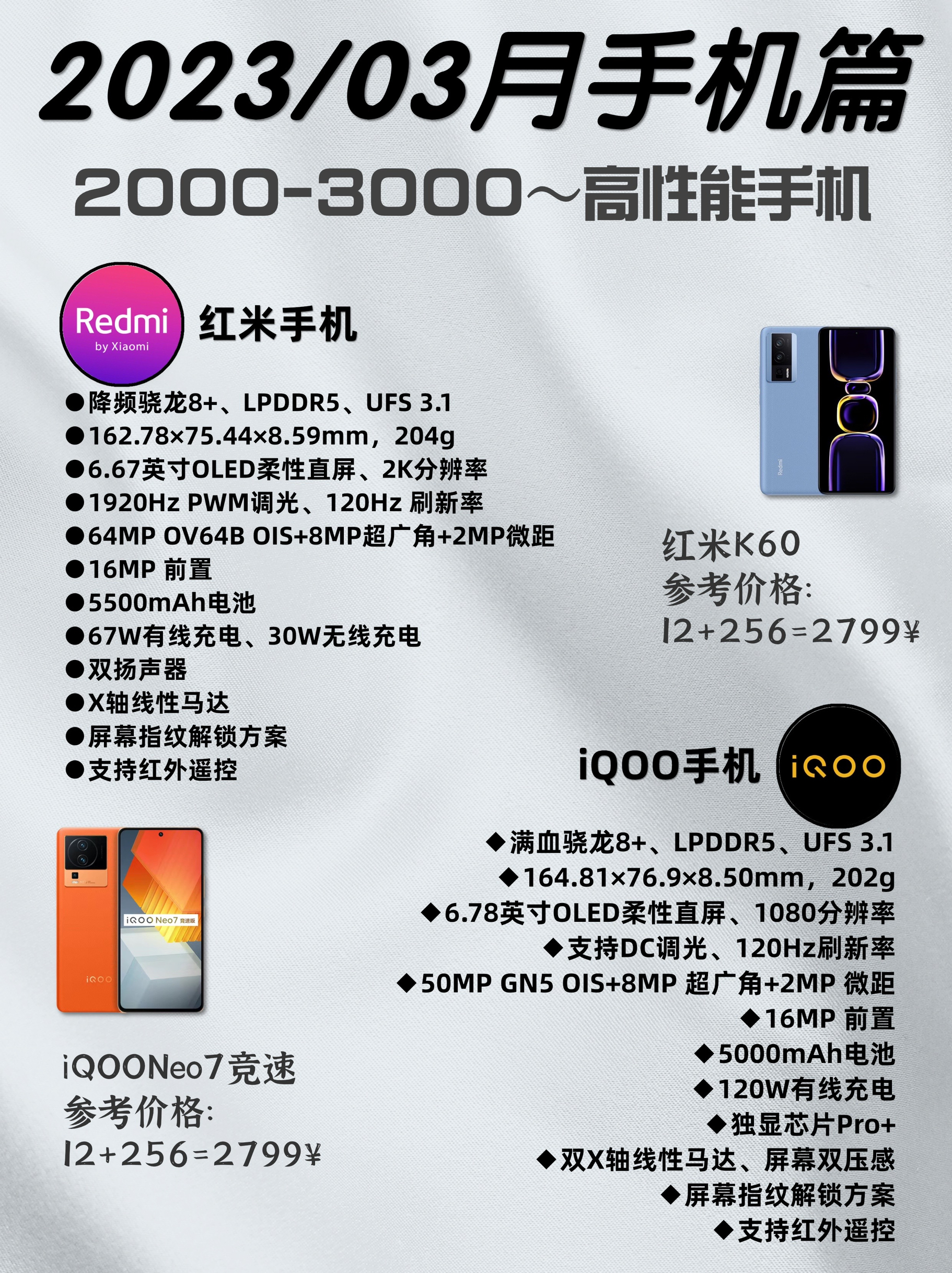进入3月份、各家都陆续发布了自家的很多型号手机、结合之前的旧机型、本期为大家盘点了本月20款性价比机型代表。 - ❗️❗️❗️声明❗️❗️❗️ - 🆚本期机型没有一款高价低配机型、请大家放心选择、让一分钱都不多花。 - 🆚本期机型针对1000-2000、2000-3000、3000-4000、4000-5000价格区间都有不同手机品牌机型、以方便不同用户挑选。 - 🆚本期机型均为高性能手机、主打性...
