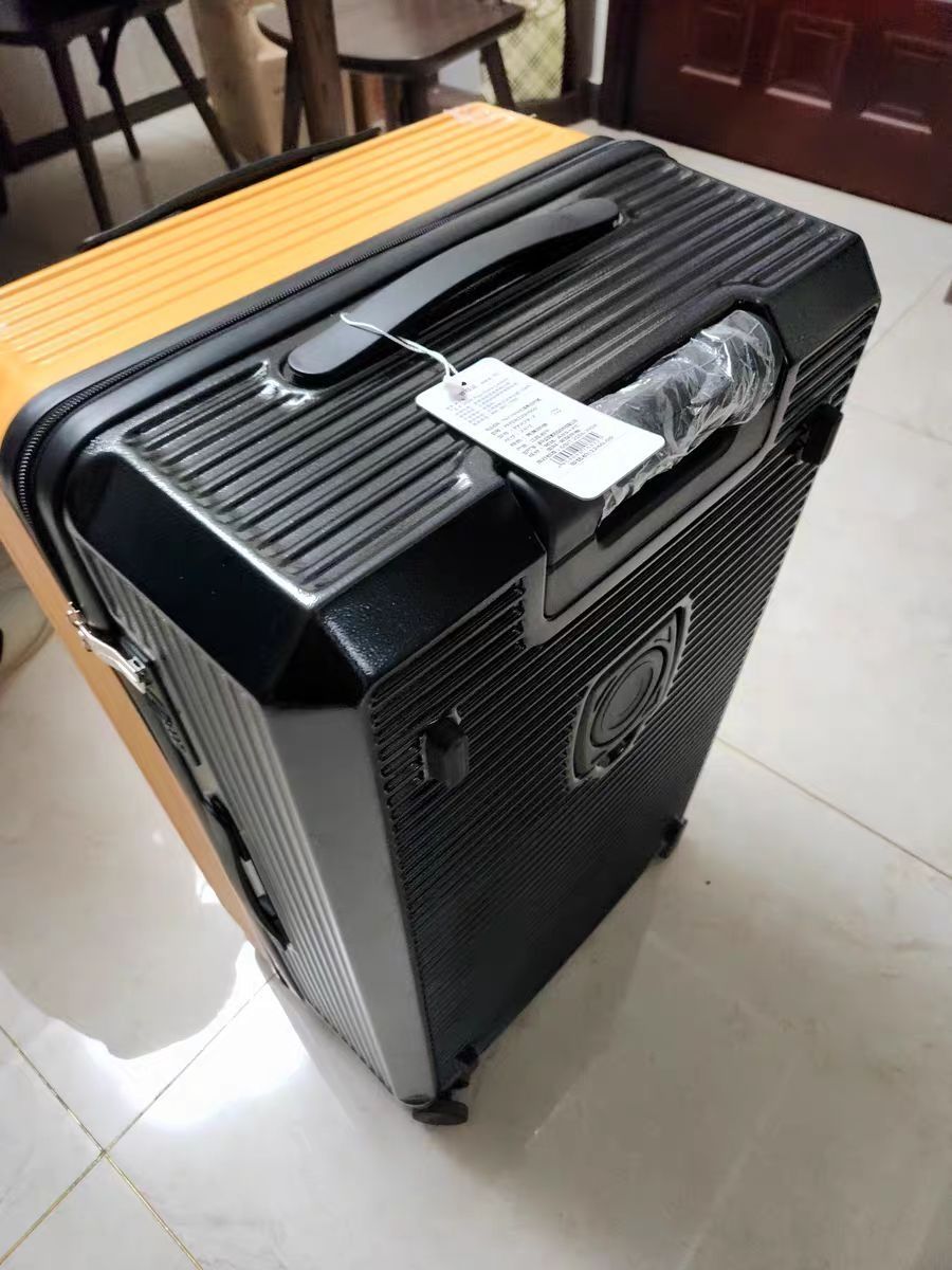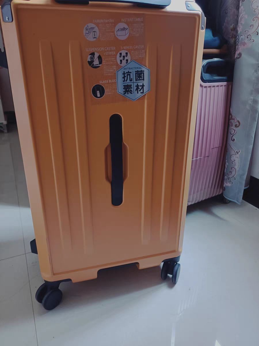 🌈目前来看总体上还是很满意的!到货超快,隔天就到了。颜色真的很漂亮,橘黑拼色很酷~ 🌈我买的是28寸,真的很深很深,放电饭煲绰绰有余!箱子背部有专门的杯架,可以放杯子,再也不用一边拿着奶茶一边推行李箱了哈哈哈 🌈底部有5个轮子,很稳!摸起来外壳还是比较硬的,有一定弹性,有海关锁,而且橘黑色真的超级耐脏,也真的好好看,也送了个箱套和一些贴纸!