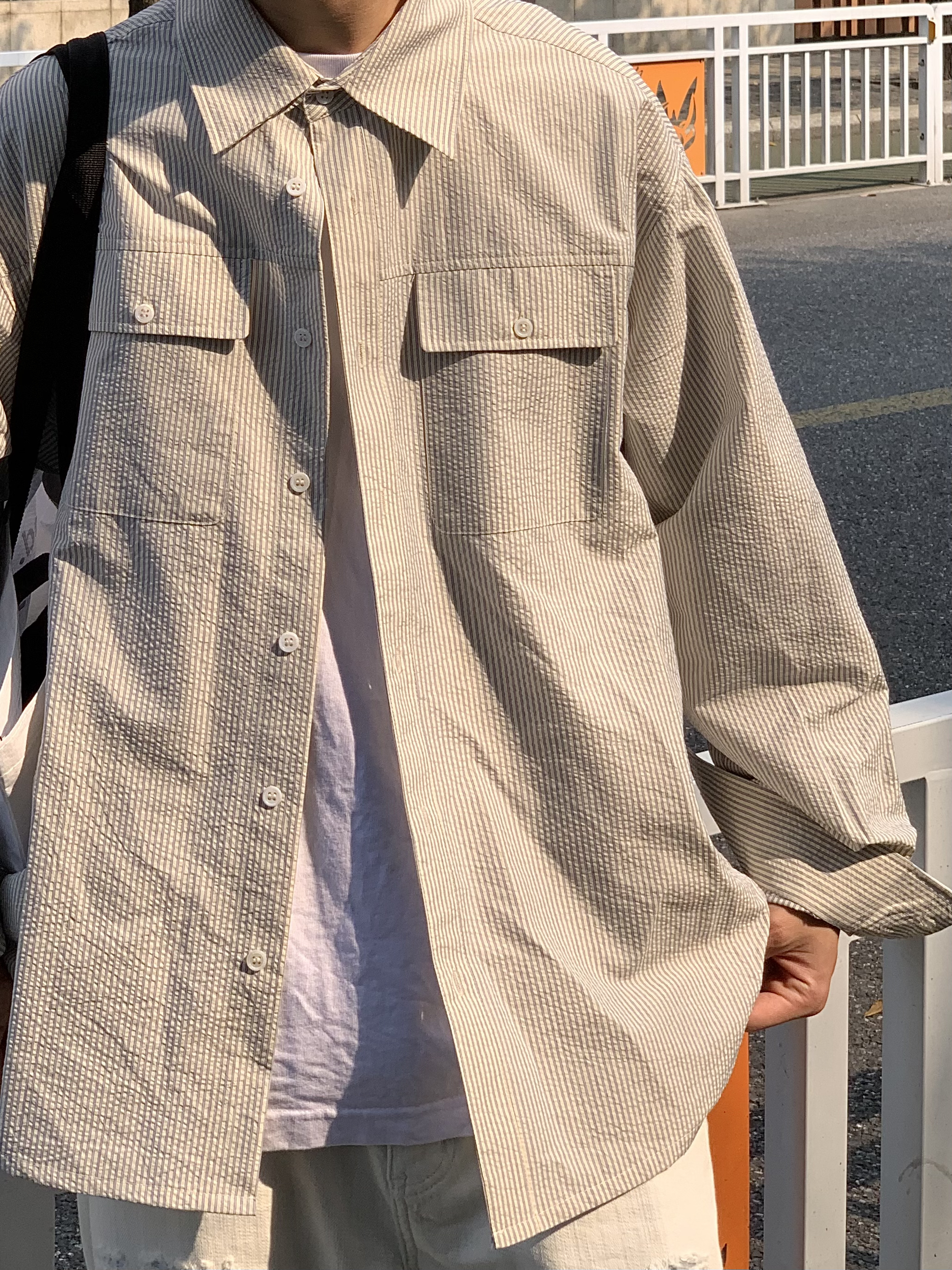 上衣 条纹衬衫 泡泡纱材质上身太舒服啦 白色条纹经典又百搭 秋冬内搭 春天单穿也没问题 裤子 白色直筒牛仔裤 直筒微锥版型遮肉显瘦 带着小破洞的细节也不会单调 白裤子yyds