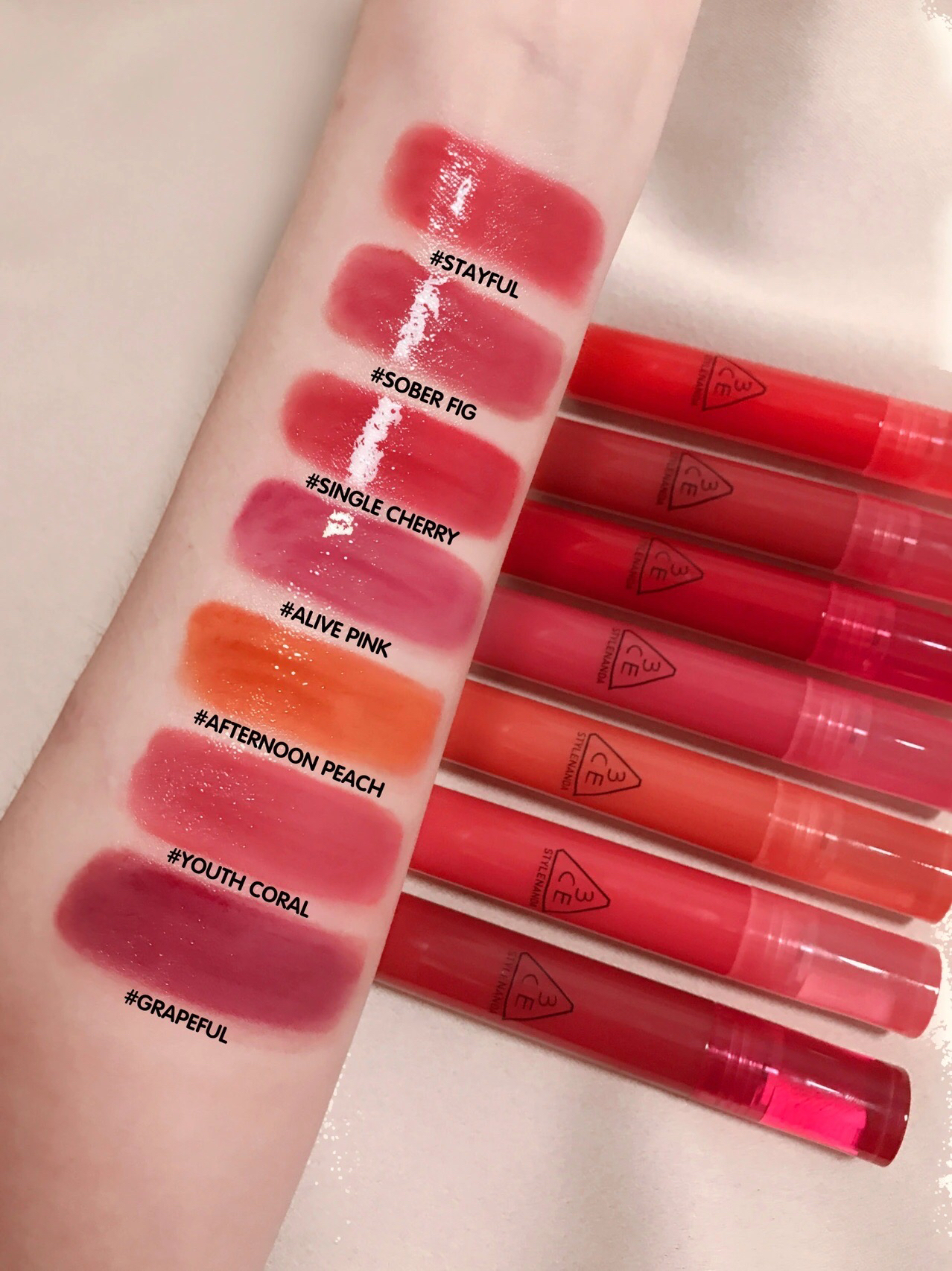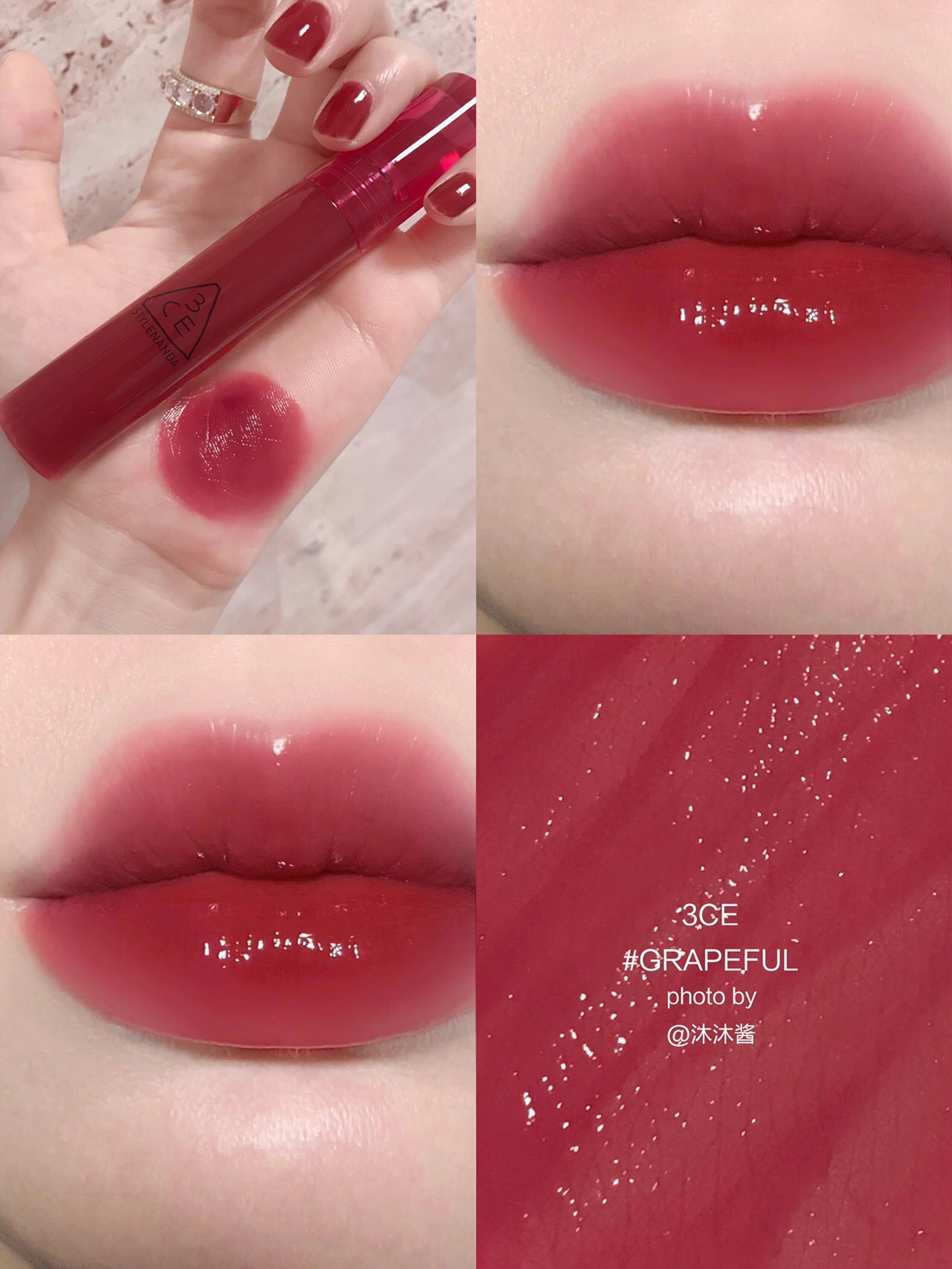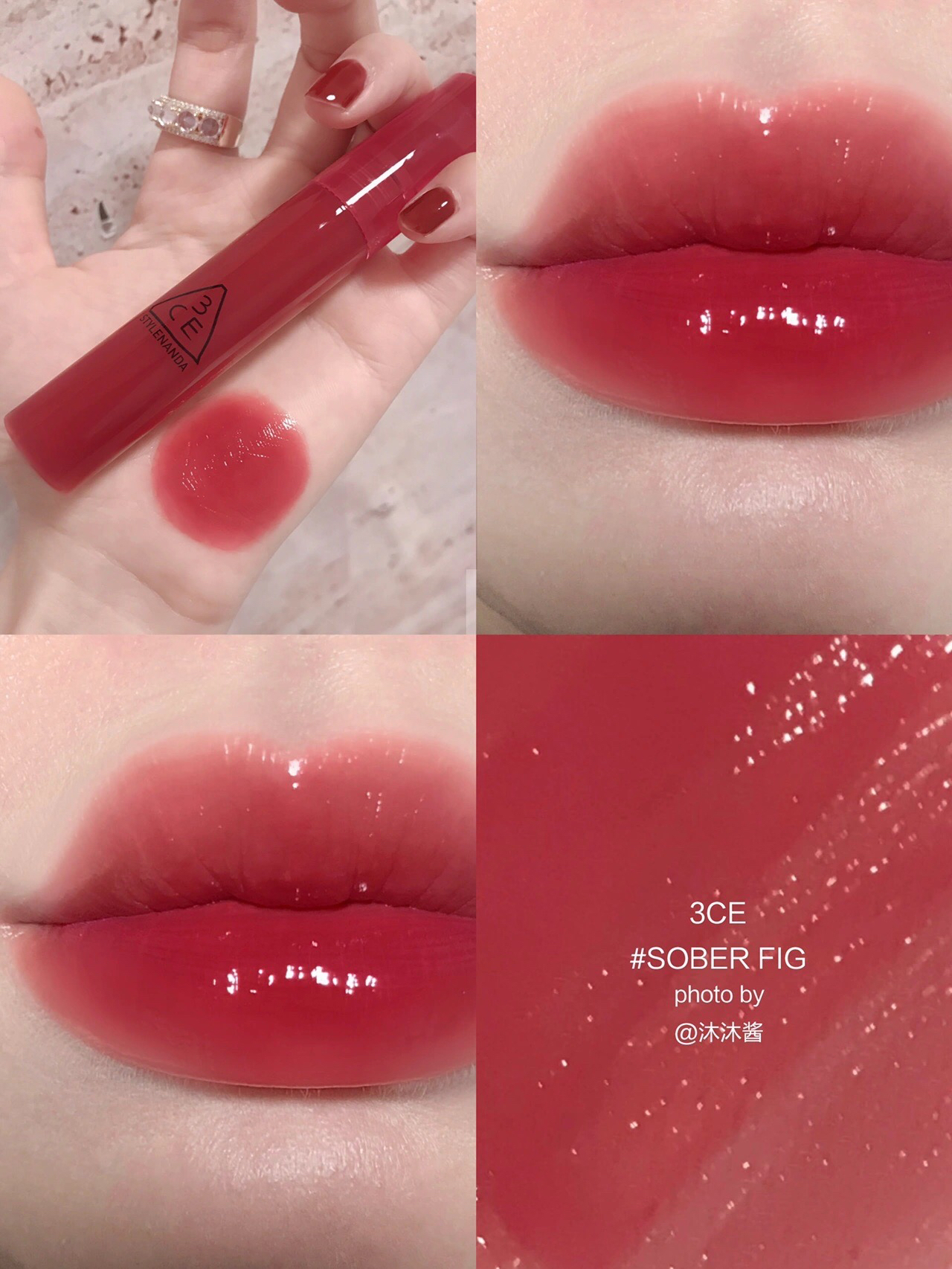 3CE诚不欺我! 这次水光唇釉调色出挑又美妙! 上嘴清清透透贼适合夏天! #sober fig无花果色 融合了豆沙的温柔和无花果的甜嫩,减龄又气质!国民初恋感就靠它啦 #grapeful 冰透葡萄 清透葡萄浆果冻,红调很足不发紫,很洋气!涂上魂穿泫雅hh 果汁水光唇釉的质地还挺有意思的,会成膜+氧化,水光感成膜后就很足,再等颜色氧化后更美!会染色,但用眼唇卸湿敷一会就能卸掉~ #无滤镜口红试色...