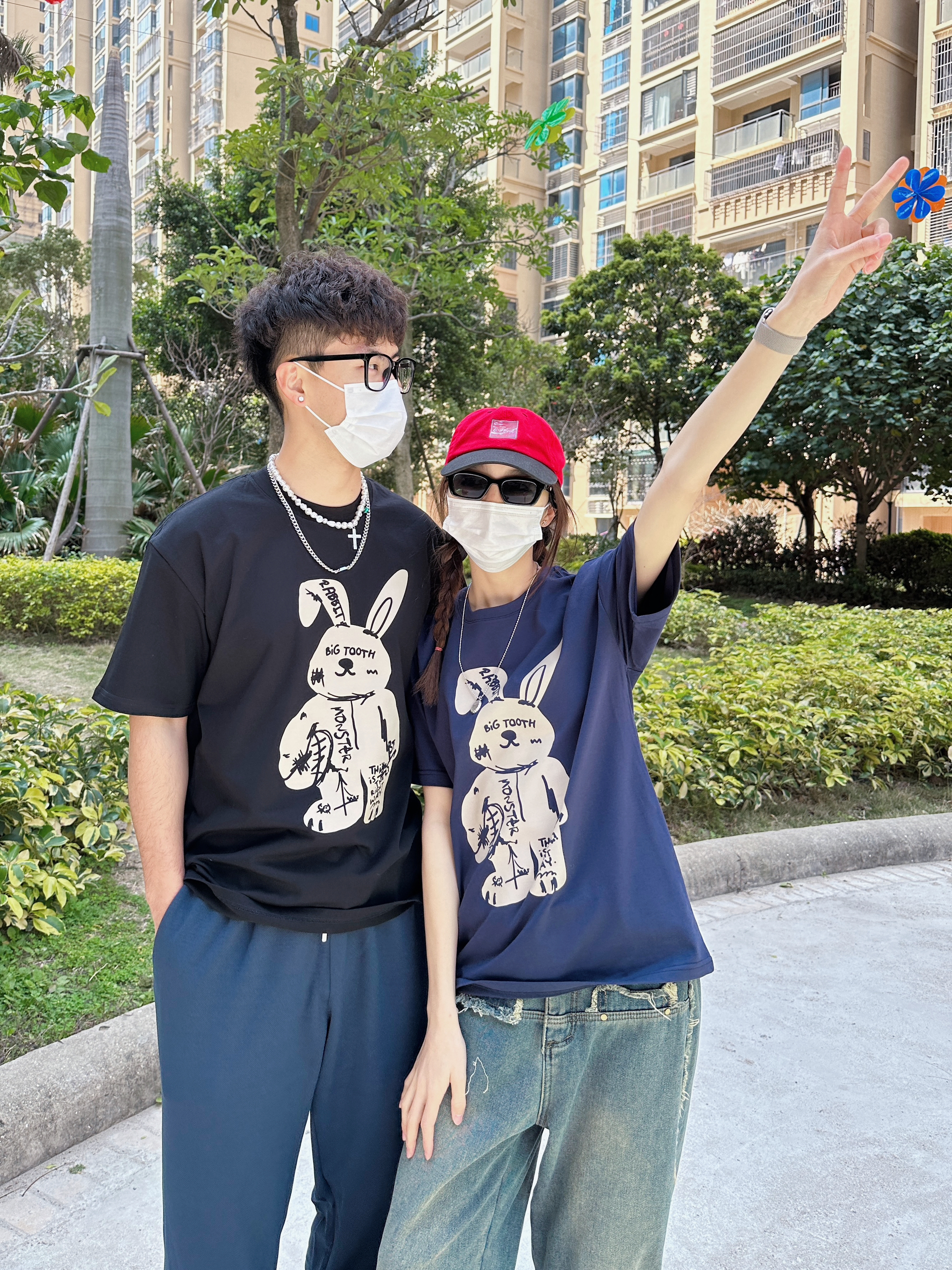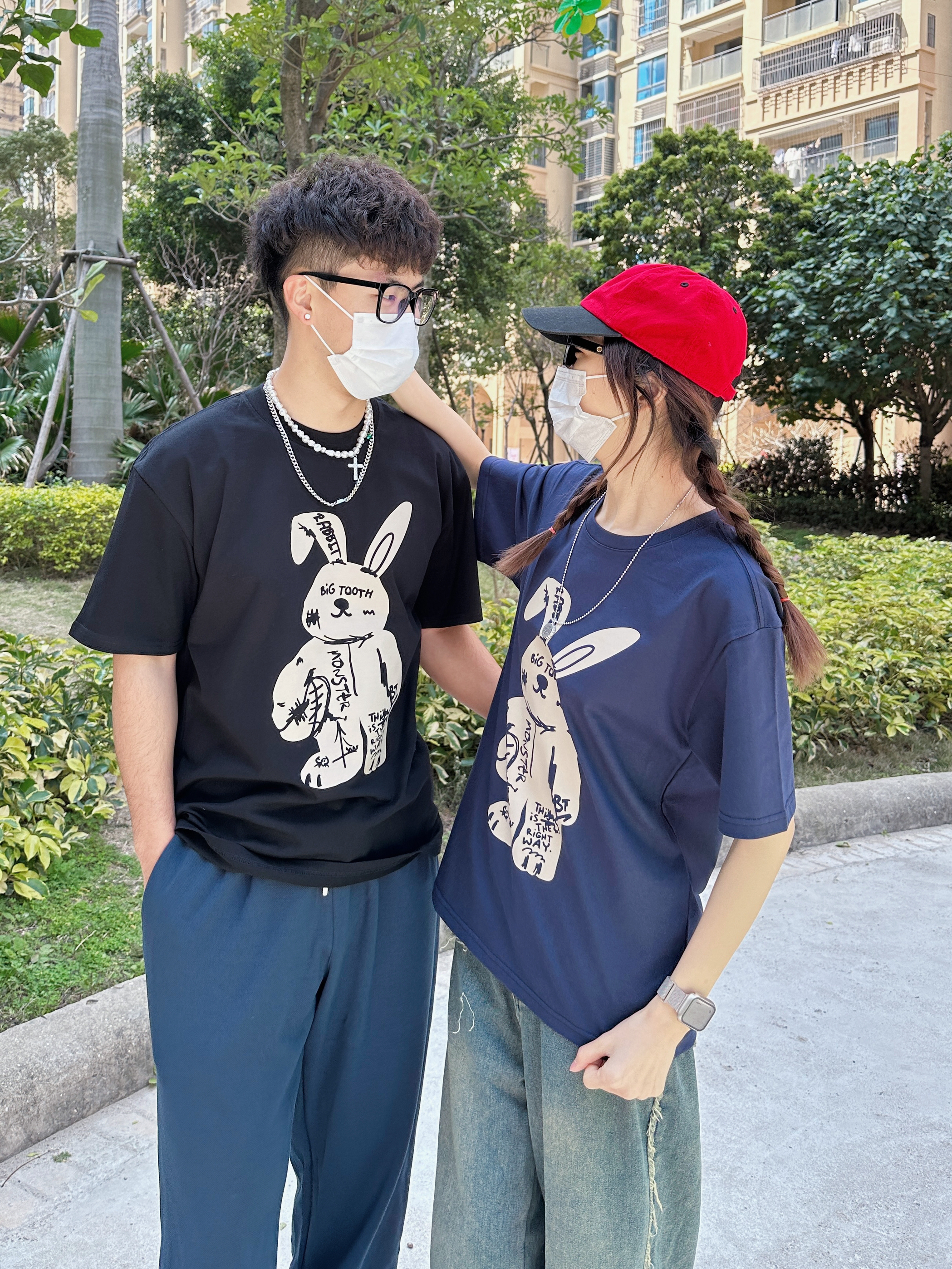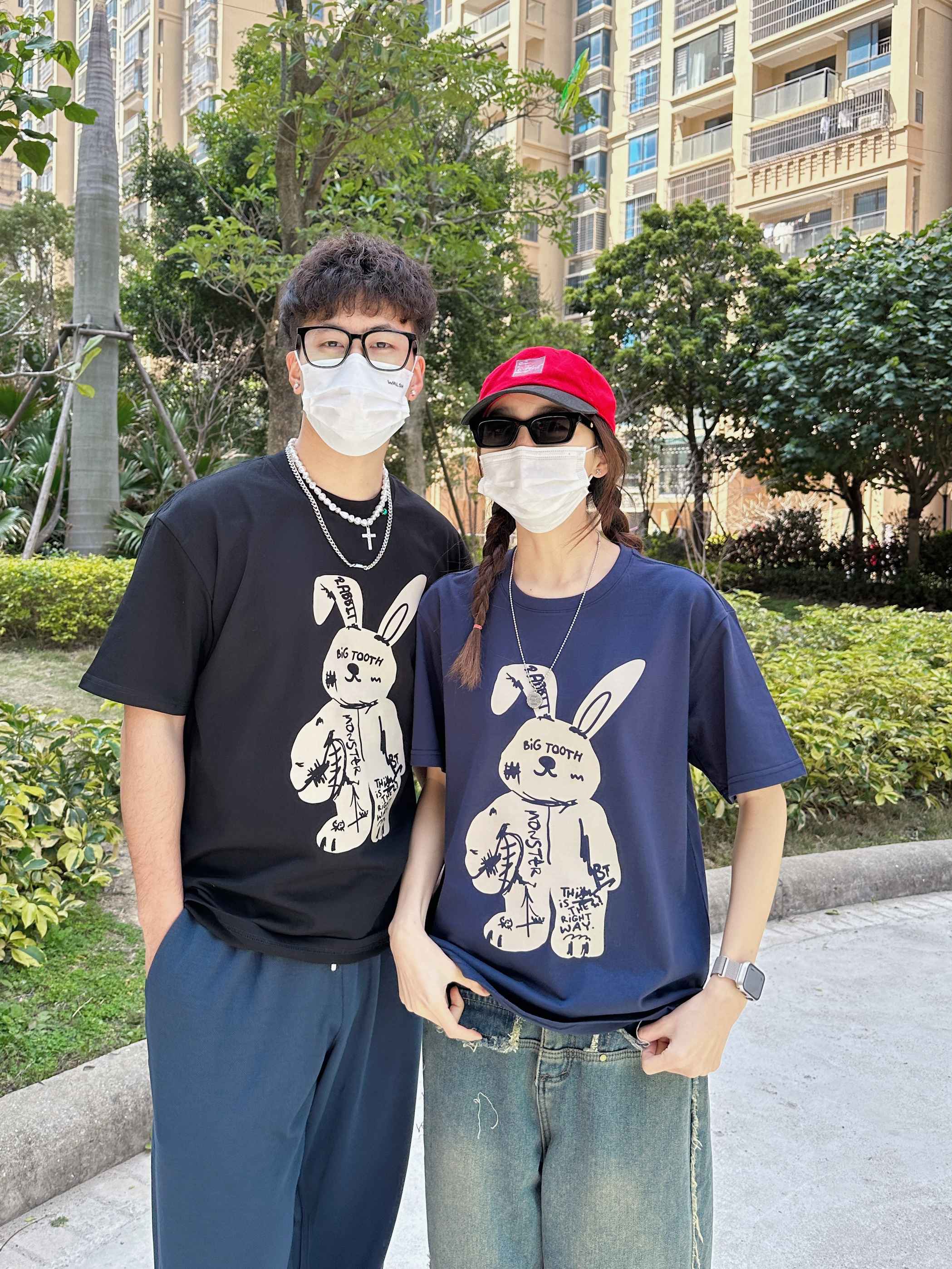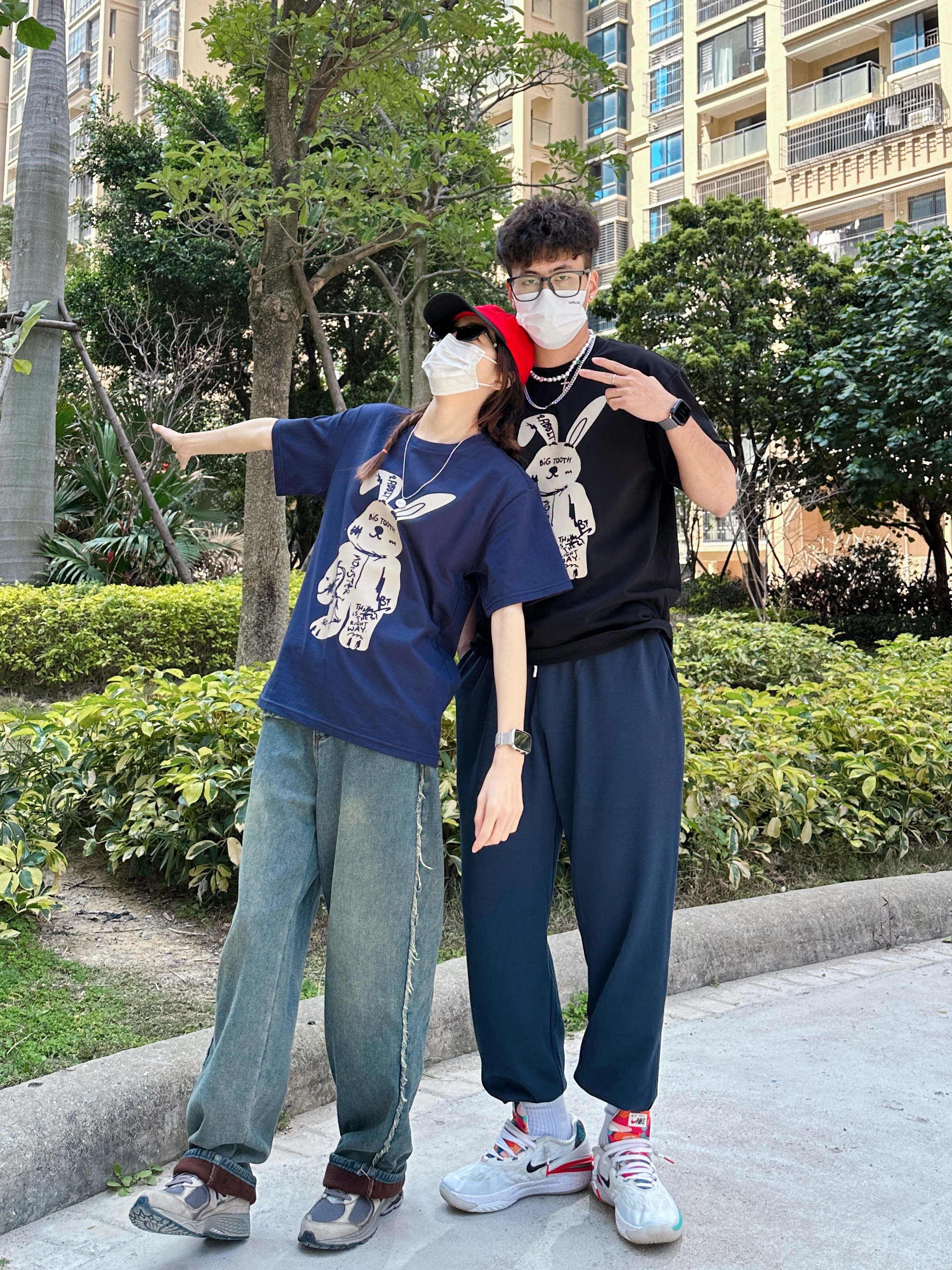 哈喽~小铭宗宗版夏日穿搭来咯~ 👧:168/44 m 👦:182/70 xl 我能想象到最浪漫的事大概就是和你一起穿情侣装啦👻👻👻 很难拒绝可爱的兔兔🐰~ 简约的tee搭配卡通的小兔几图案 就很卡哇伊~ 搭配运动裤or 牛仔裤 就🐒🐒看 黑、蓝色夏日经常穿的颜色 日常又百搭 爱了耶